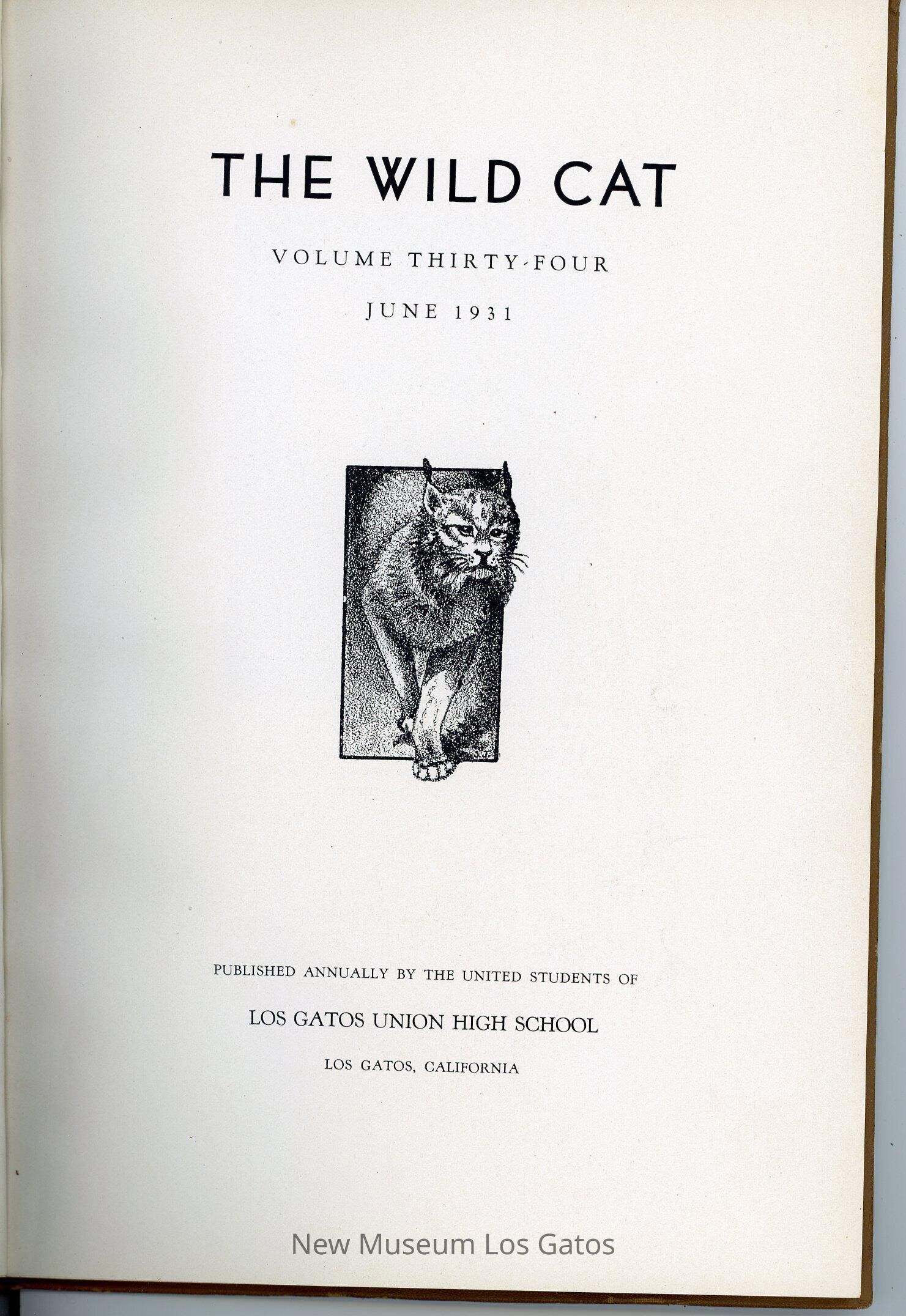 The Wildcat, a hardcover literary magazine/yearbook published by the students of Los Gatos High School in June 1931, volume number 34. Issue number is not specified in this particular issue.
