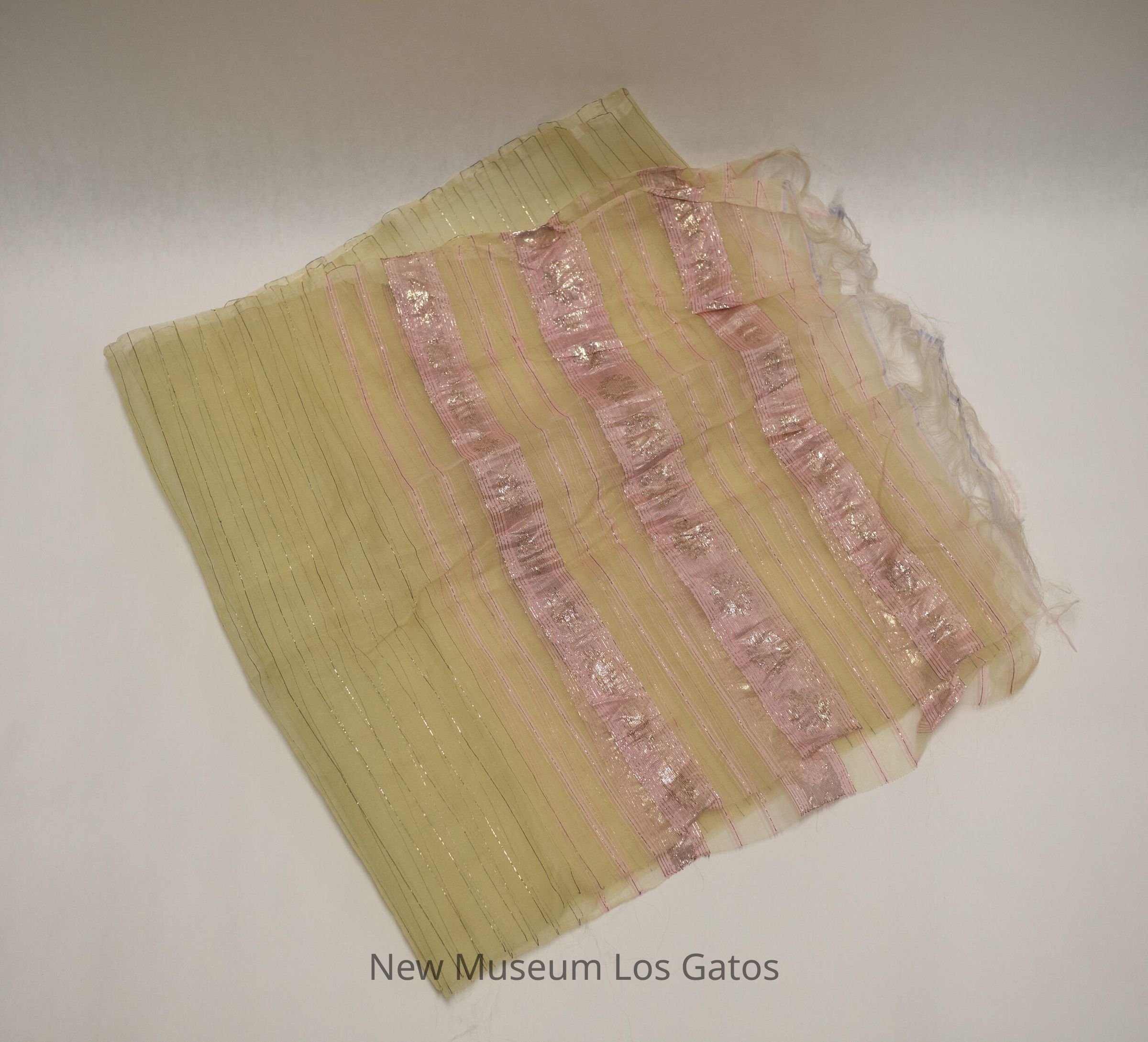 Sheer lime green silk scarf, with thin silver stripes throughout and thicker, patterned pink stripes towards the ends.Collection