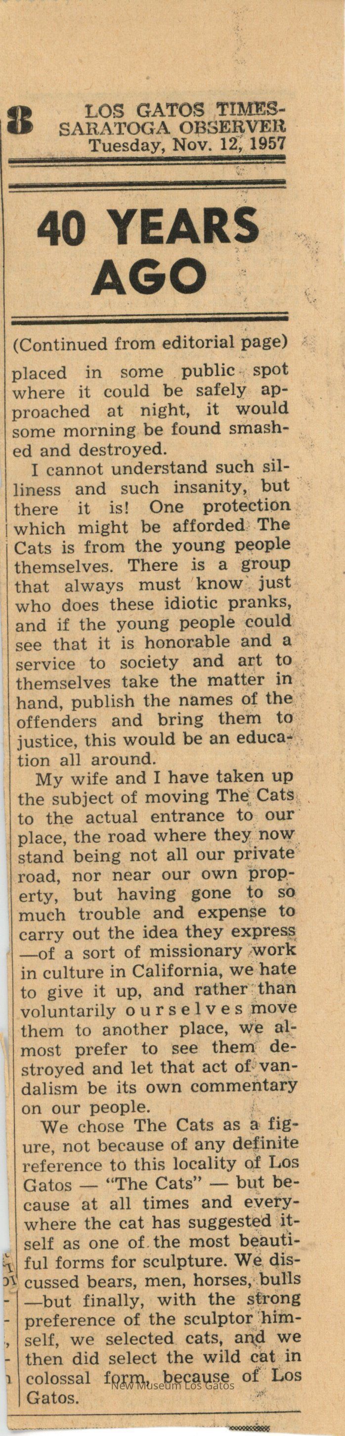 A clipped article from the Los Gatos Times-Observer, dated November 12, 1957. The article is about the Los Gatos cat statues, Leo and Leona, at Poet's Canyon, in Los Gatos, California.Collection