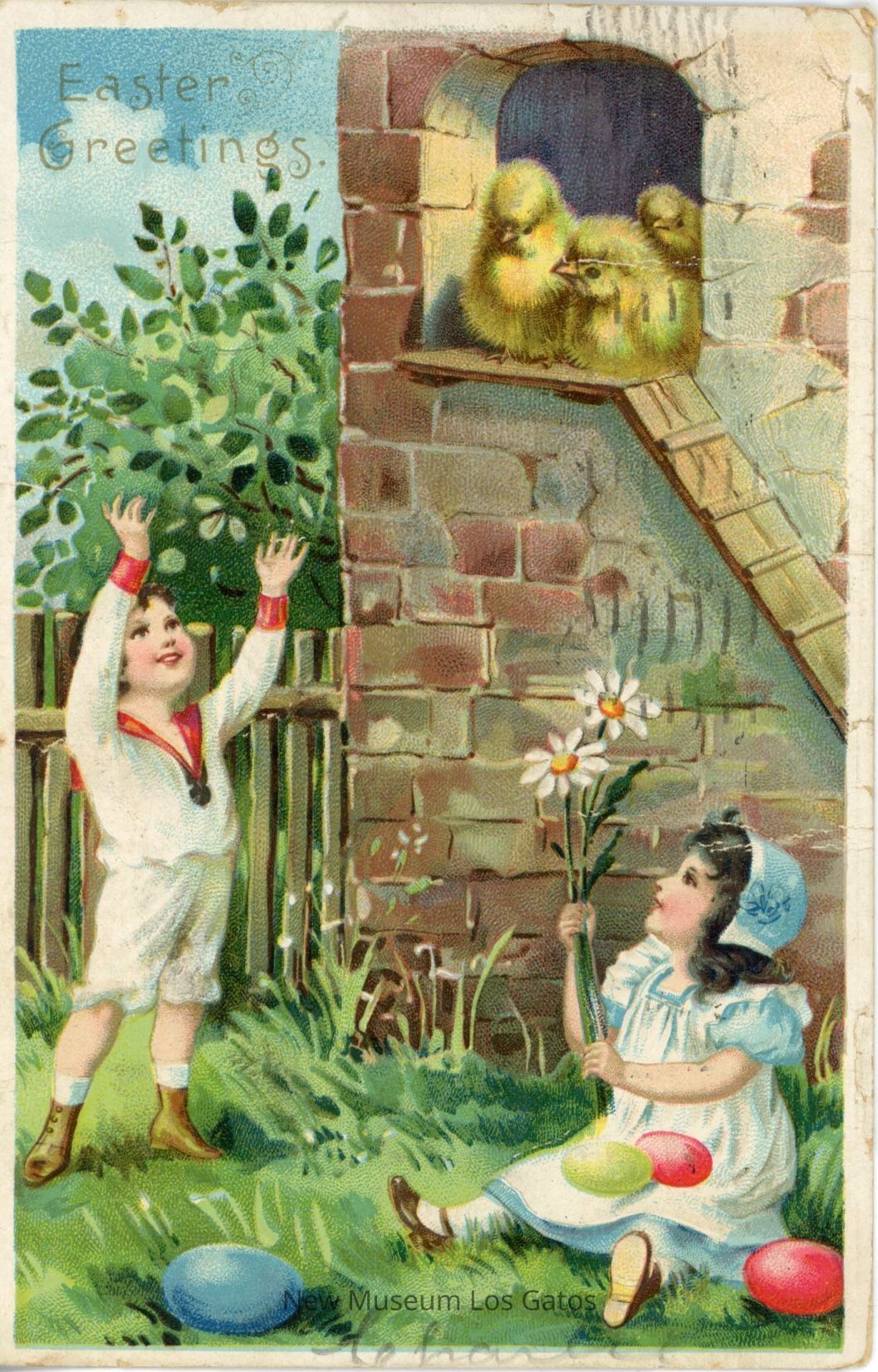 A postcard featuring an illustration of two children playing outdoors, with three baby chicks perched inside a brick structure, at the top of wooden ramp.Subject