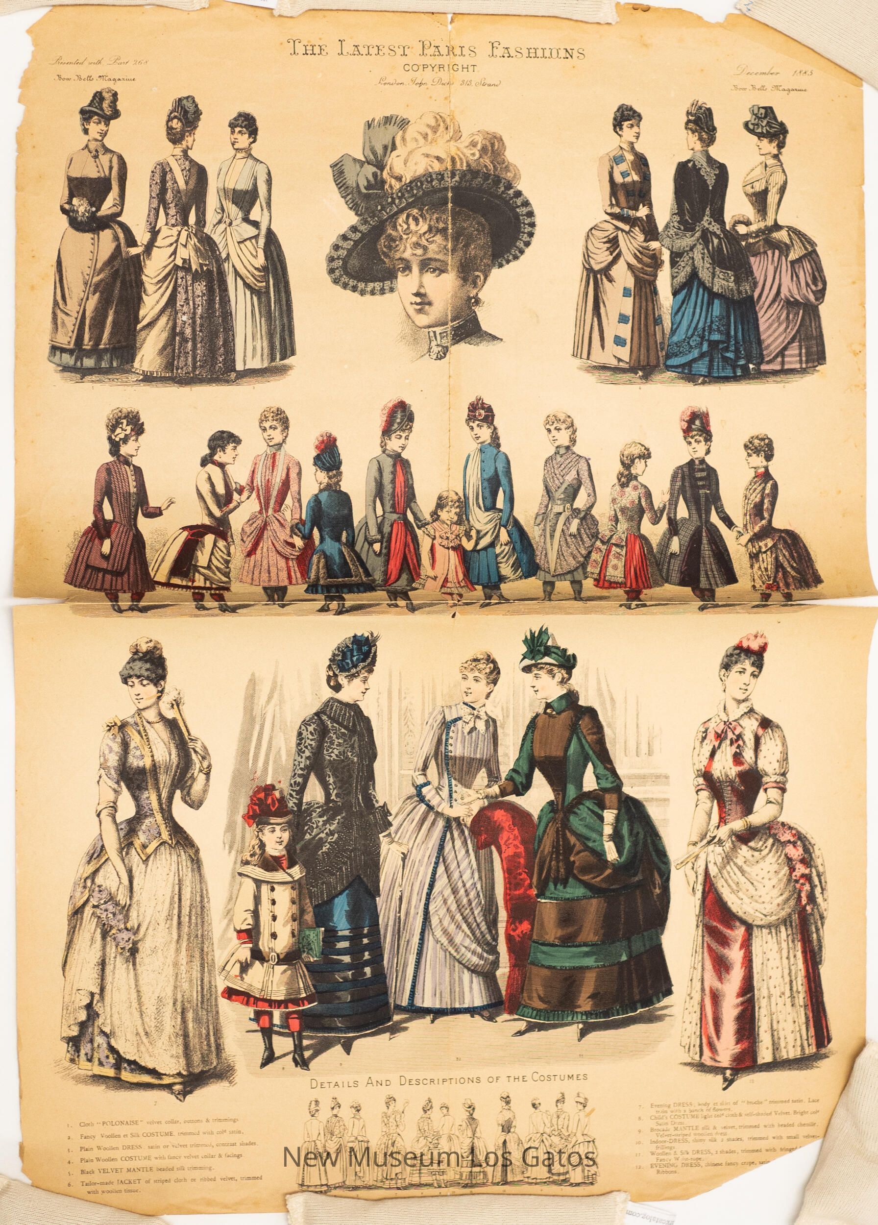 A hand-illustrated fashion insert from Bow Bells Magazine, featuring colorful illustrations of women and children in fashionable clothing, along with detailed descriptions of each outfit.