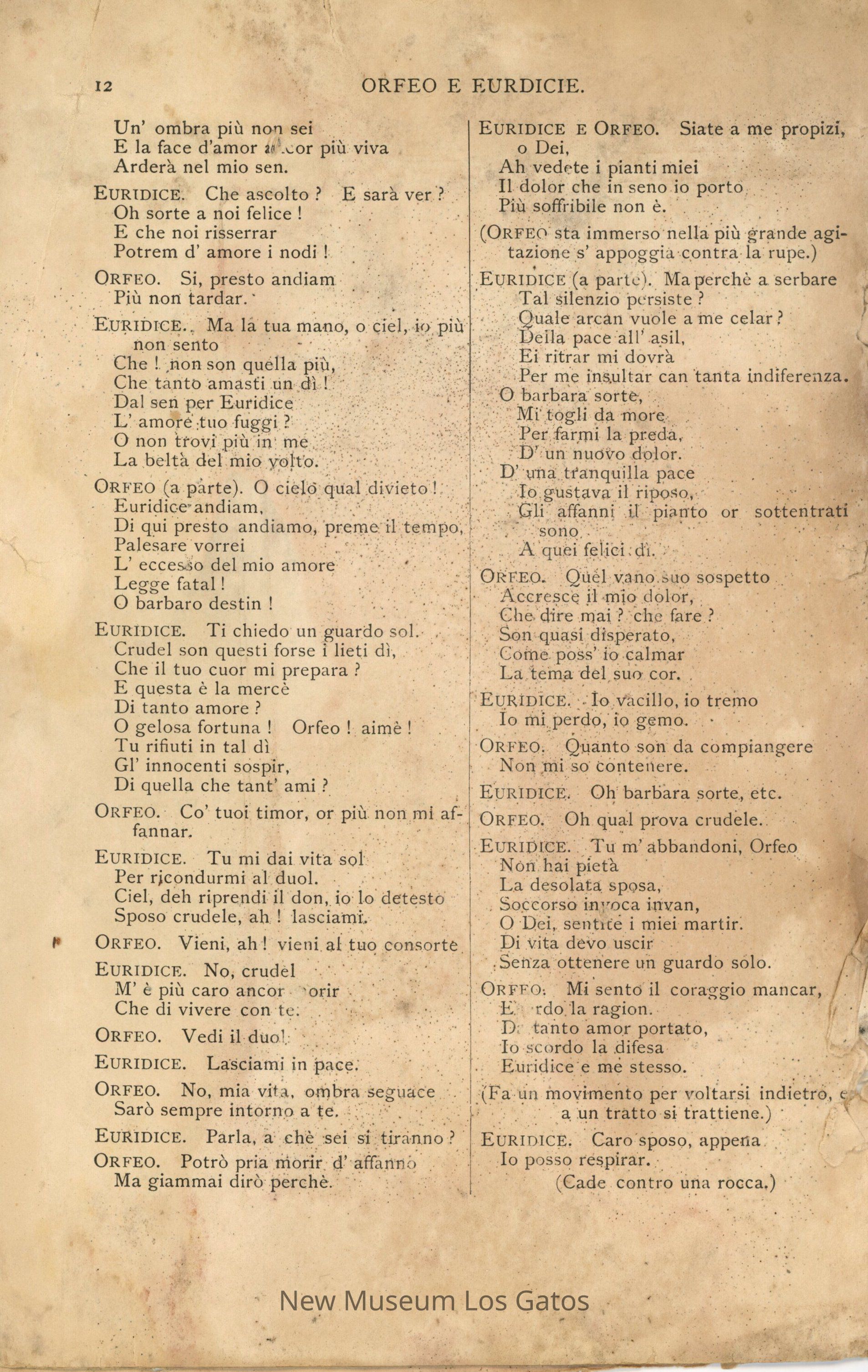 A few pages from a booklet with the script of the opera "Orfeo ed Euridice," by Christoph Willibald Gluck. The booklet is incomplete, with only pages 3-12 are present. The booklet includes the argument, script, and scene settings; in English as well as Italian.Collection