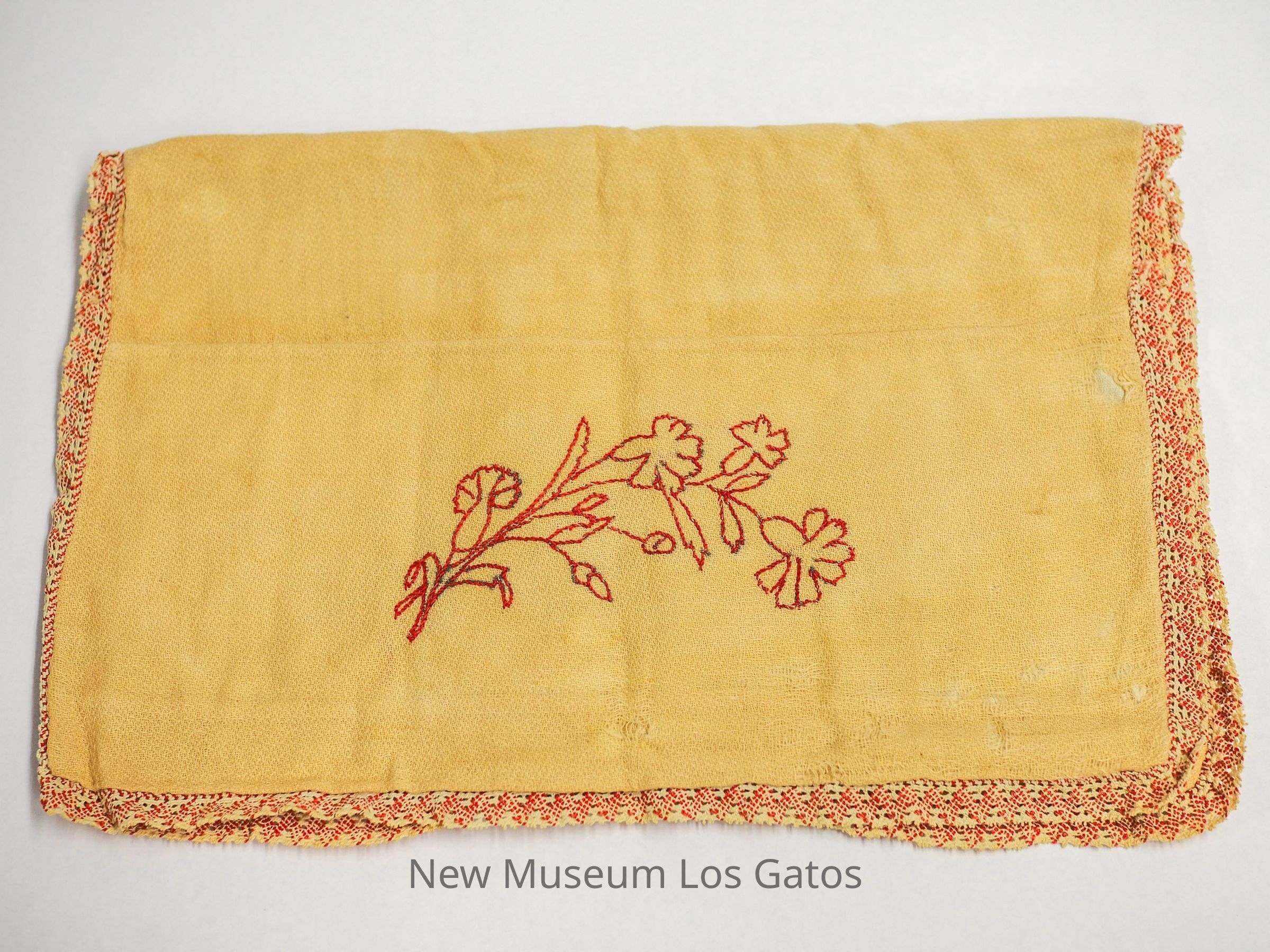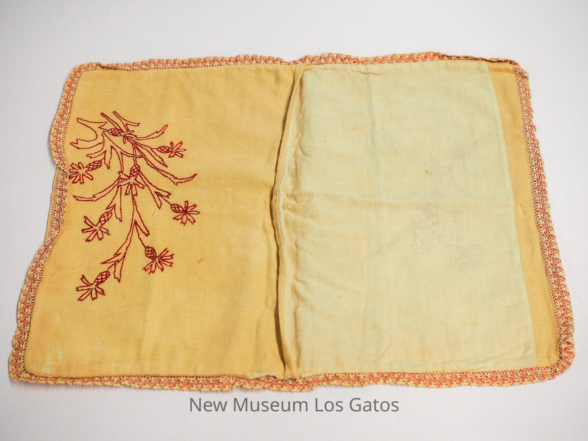 An ecru cloth folder with red embroidered flowers and red and white trim.Collection
