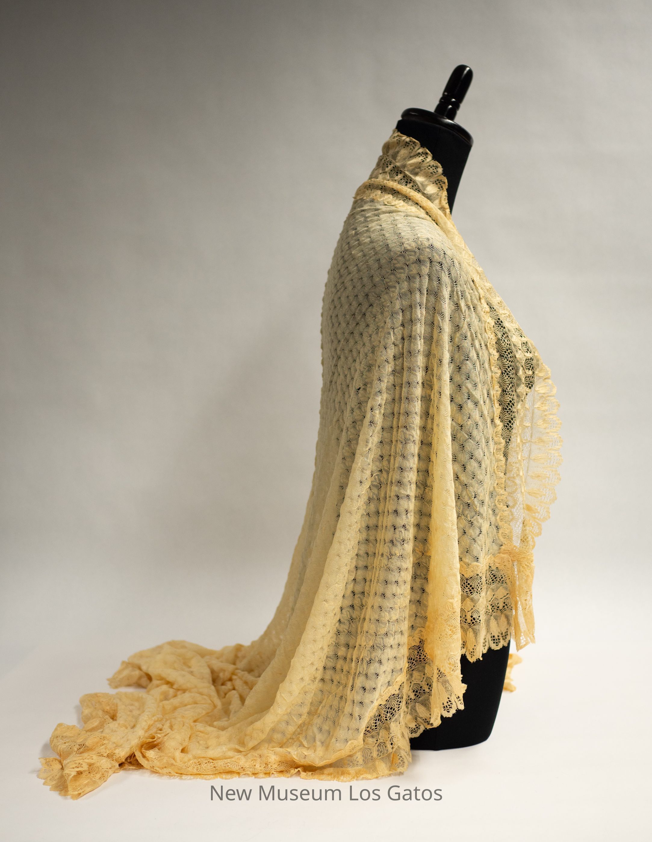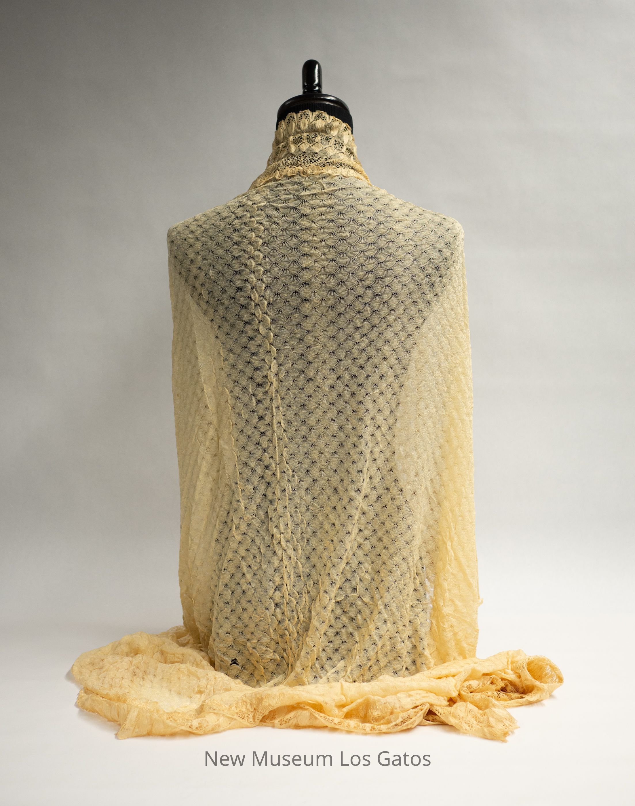 A large, lace, ecru-colored shawl. The center of the shawl features a scallop-like pattern, while the border of the shawl is looser, and features a more wavy pattern.Collection