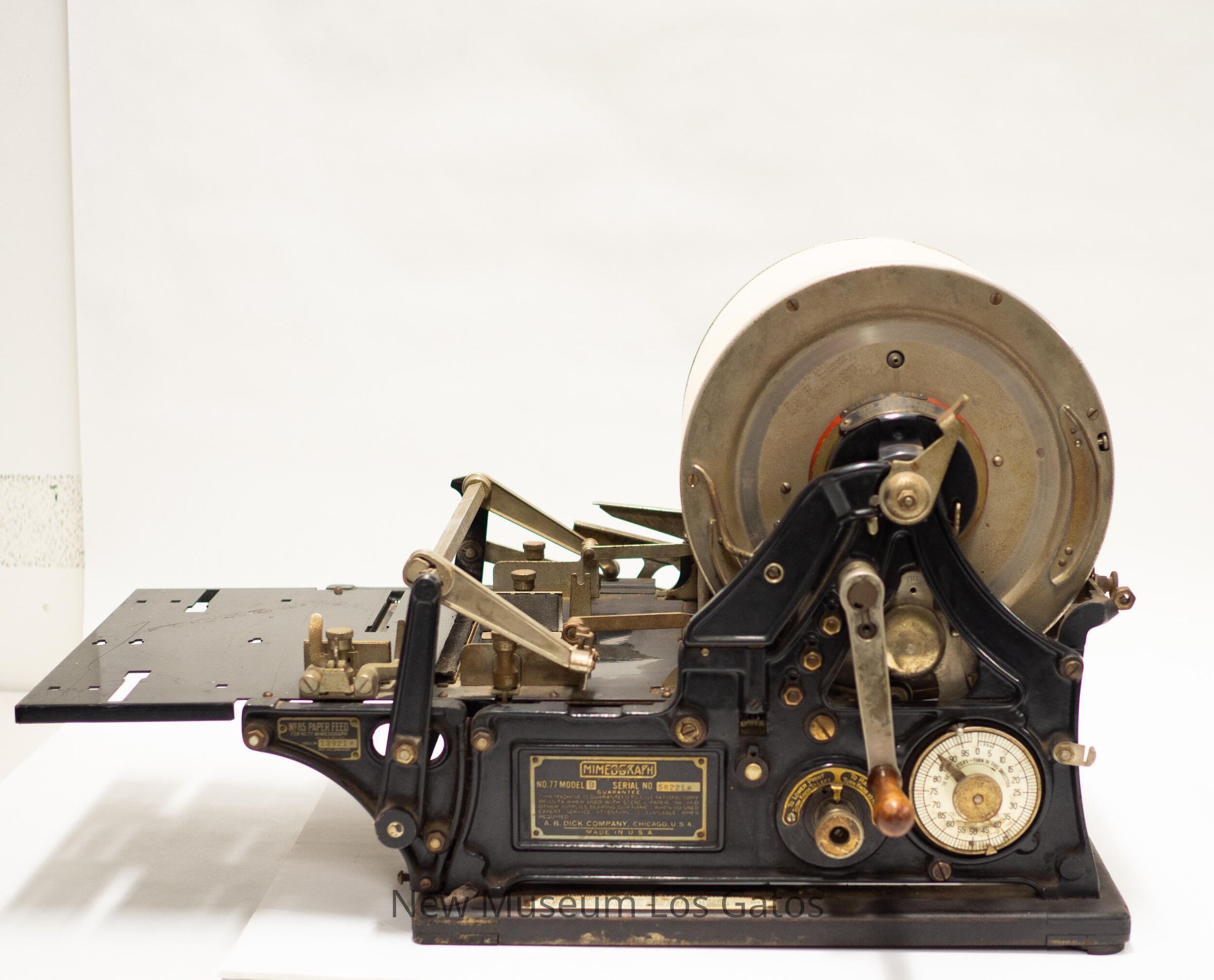 EDISON-DICK MIMEOGRAPH / REG. IN U.S. PATENT OFFICE / NO. 77 MODEL B SERIAL NO. 58221[star] / GUARANTEE / THIS MACHINE IS GUARANTEED TO GIVE SATISFACTORY RESULTS WHEN USED WITH STENCIL PAPER, INK AND OTHER SUPPLIES BEARING OUR NAME. WHEN SO USED EXPERT SERVICE ATTENTION IS AVAILABLE WHEN REQUIRED. / A. B. DICK COMPANY, CHICAGO, U.S.A. / MADE IN U.S.A.Language