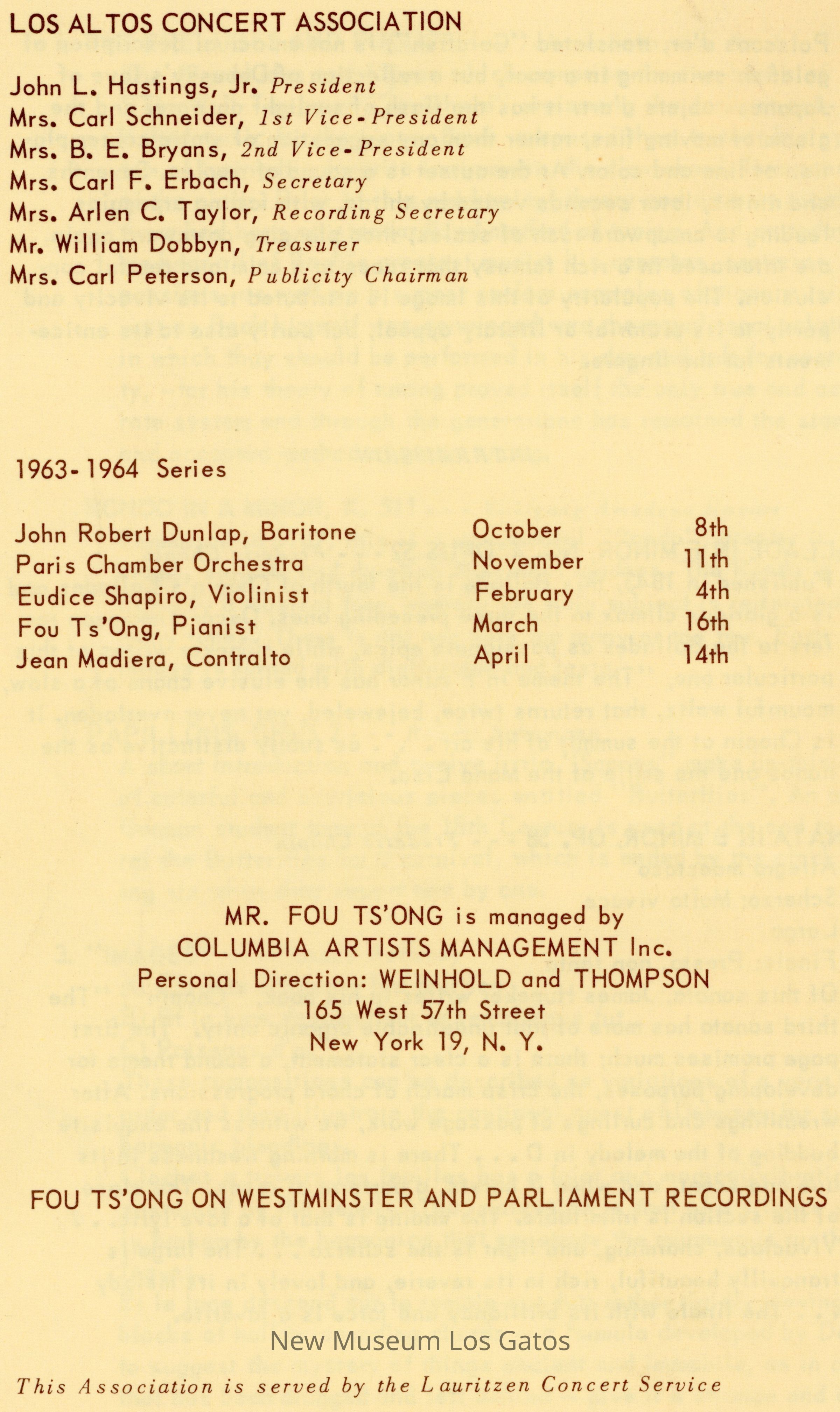 A program for pianist, Fou Ts'ong, with the Los Altos Concert Association.Collection