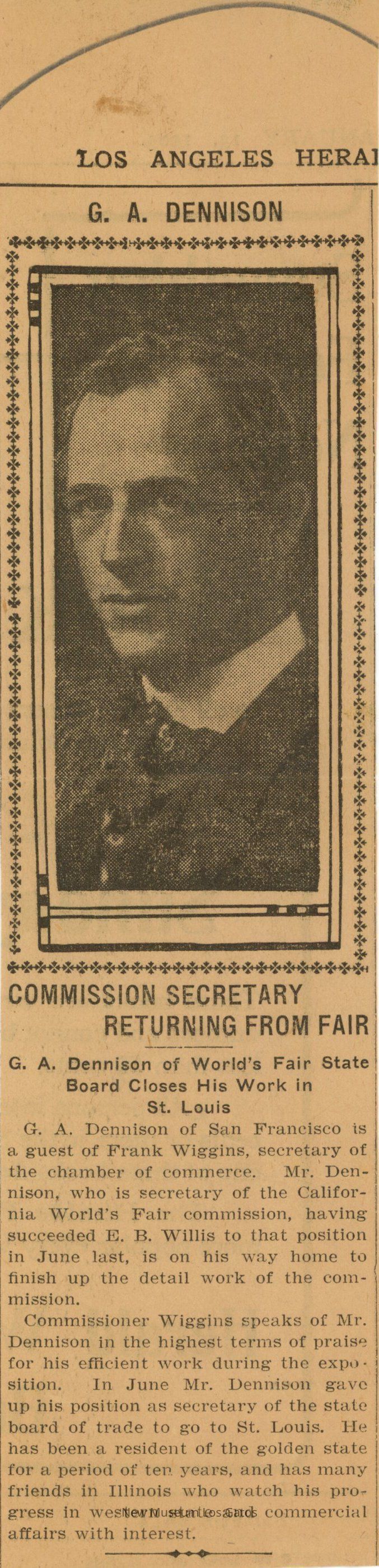 G. A. Dennison of San Francisco is a guest of Frank Wiggins, secretary of the chamber of commerce. Mr. Dennison, who is secretary of the California World's Fair commission, having succeeded E.B. Willis to that position in June last, is on his way home to finish up the detail work of the commission.
