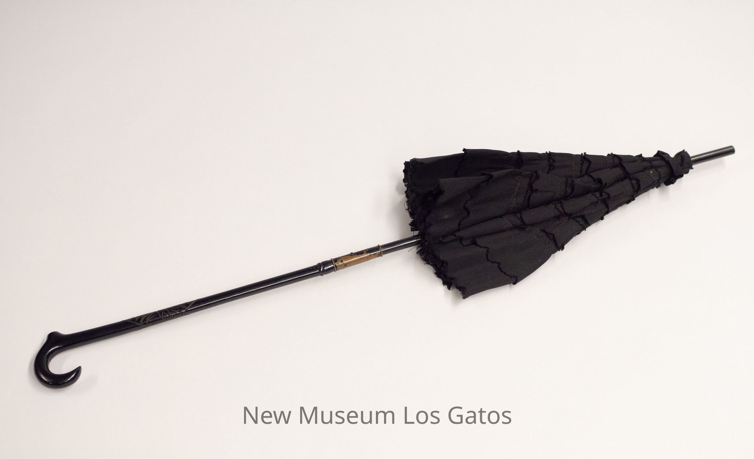 A small black parasol with gathered silk ruffles on the exterior of the umbrella. The thin black shaft has a curved handle. There are geometric etchings on the shaft, near the handle. The umbrella shaft is also able to fold.Collection