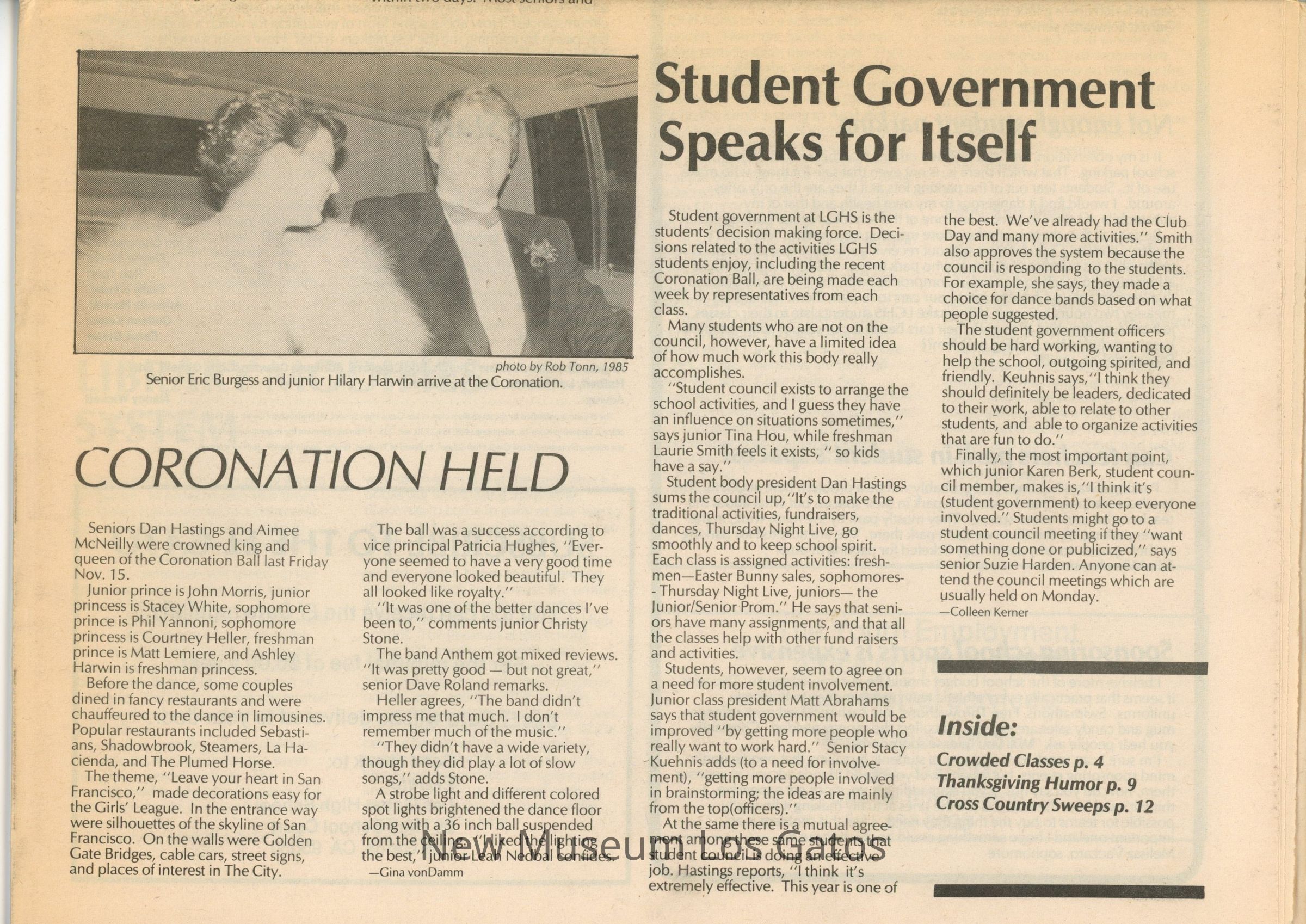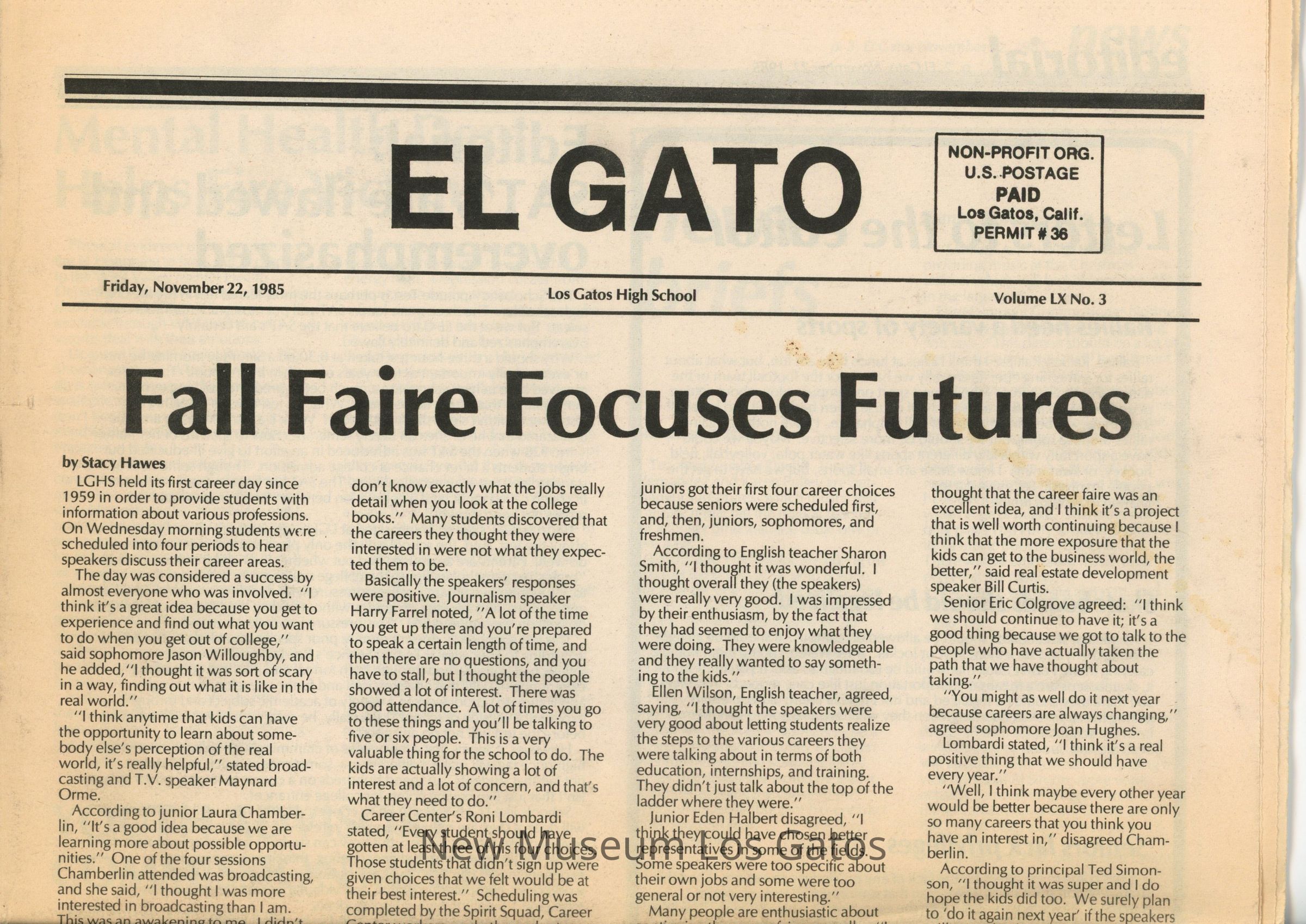 A copy of the November 22, 1985 edition of El Gato, Los Gatos High School's newspaper.Collection