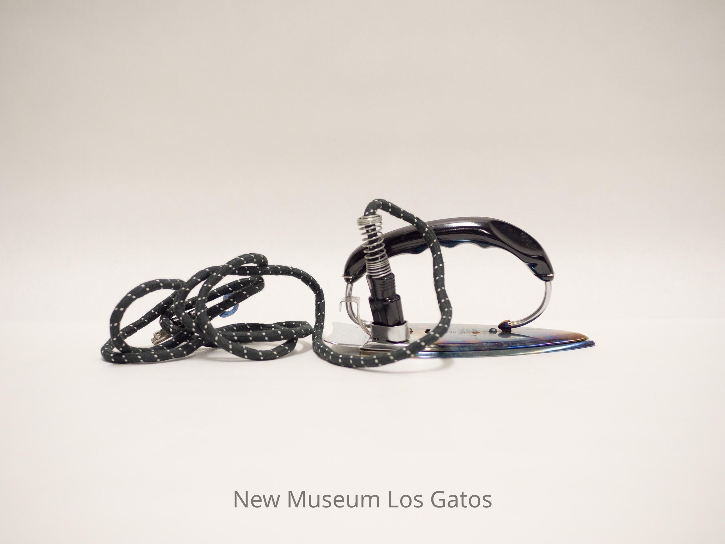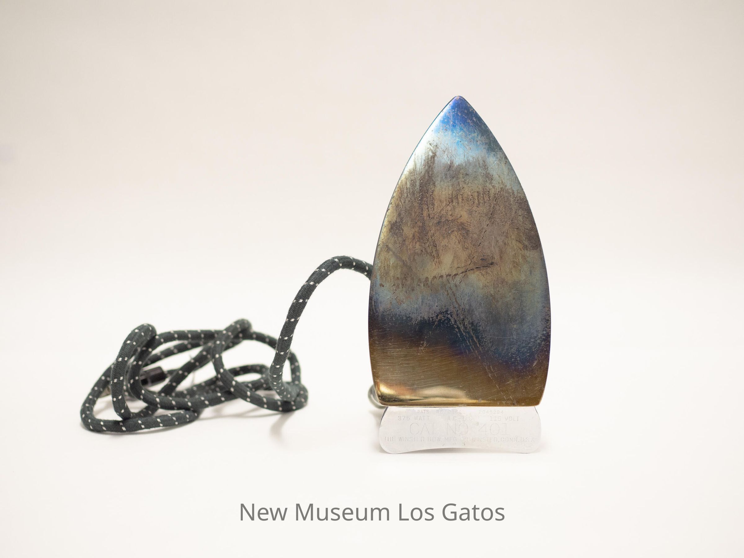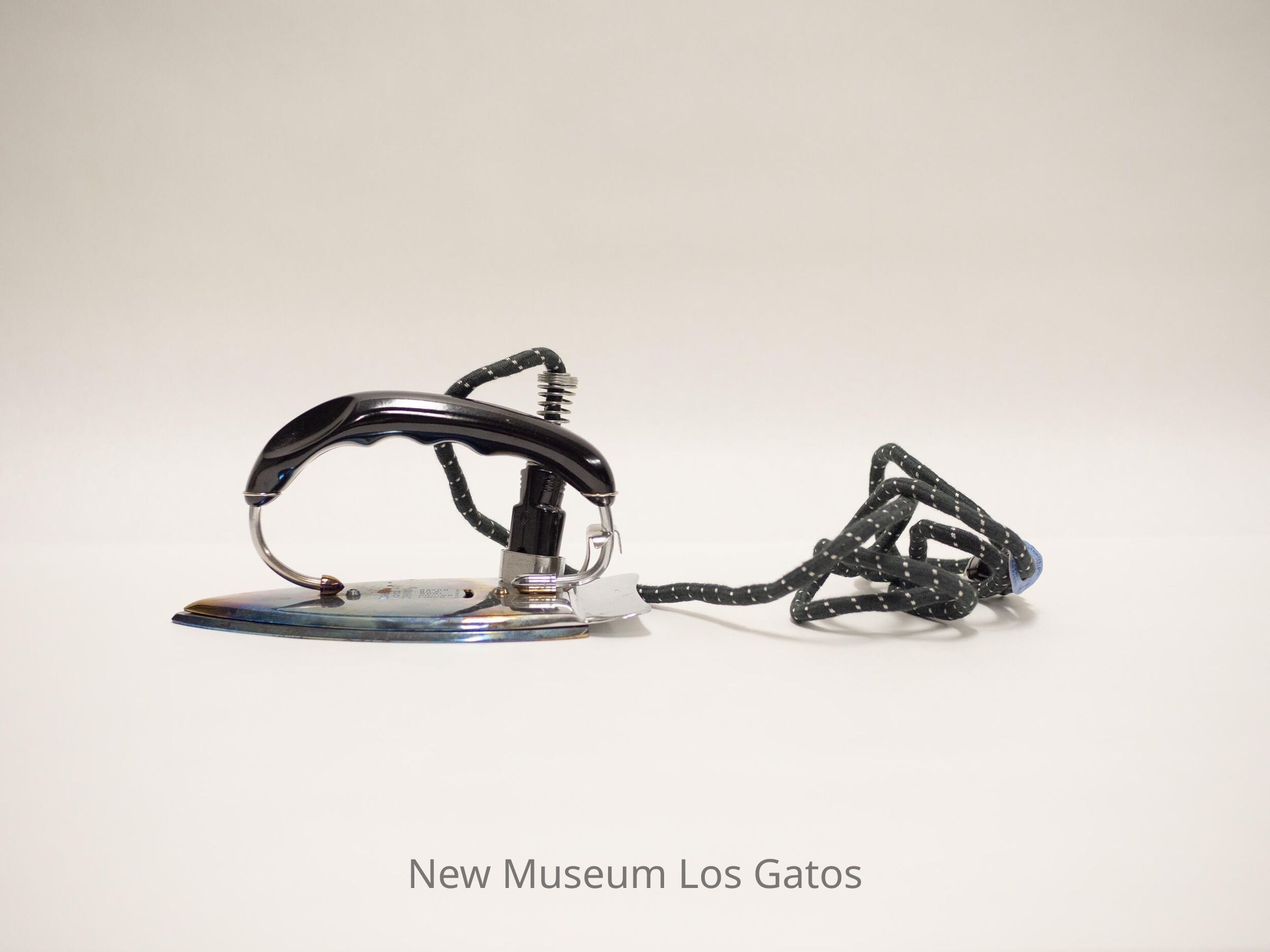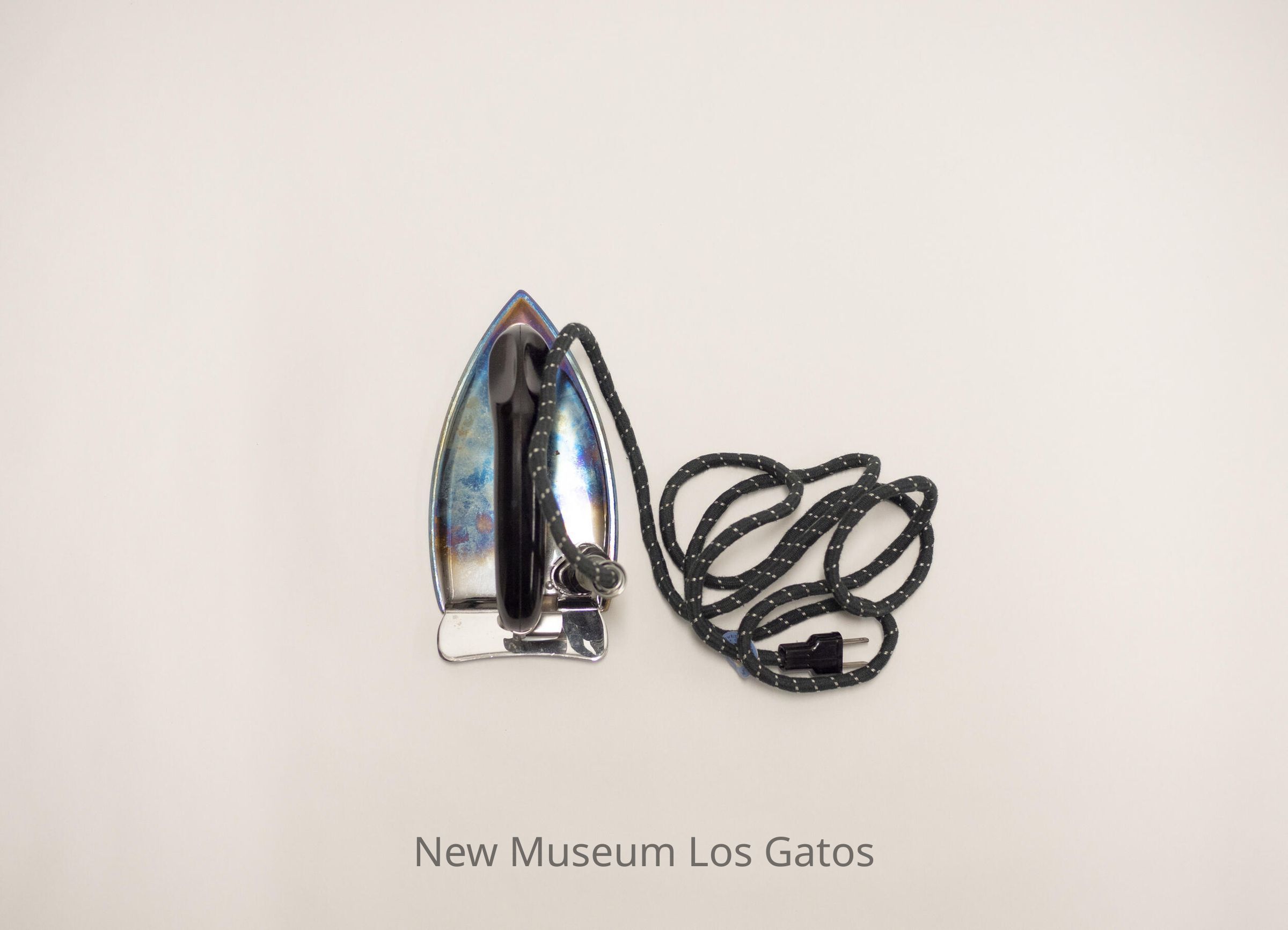An electric travel iron, with a metal base, a black enameled handle, and a green and white cloth power cord. The handle folds down to allow for easy packing when traveling.Collection