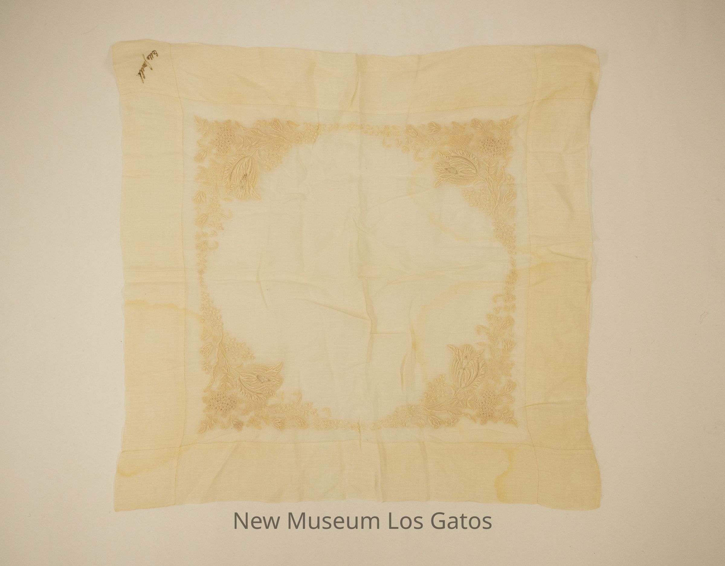 A square, white handkerchief with white embroidered flowers, possibly tulips, in each corner, with smaller embroidered flowers and leaves connecting each corner.Collection
