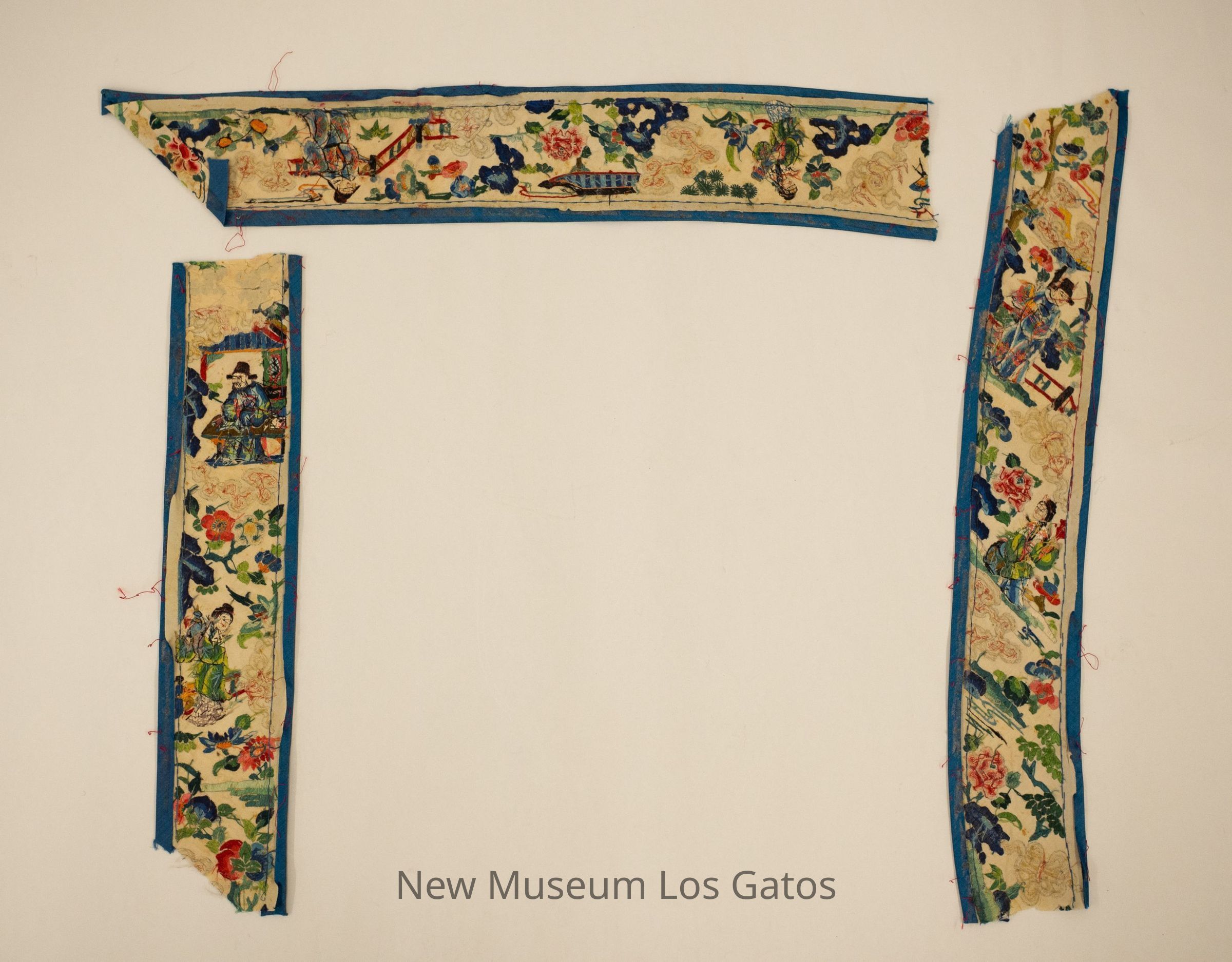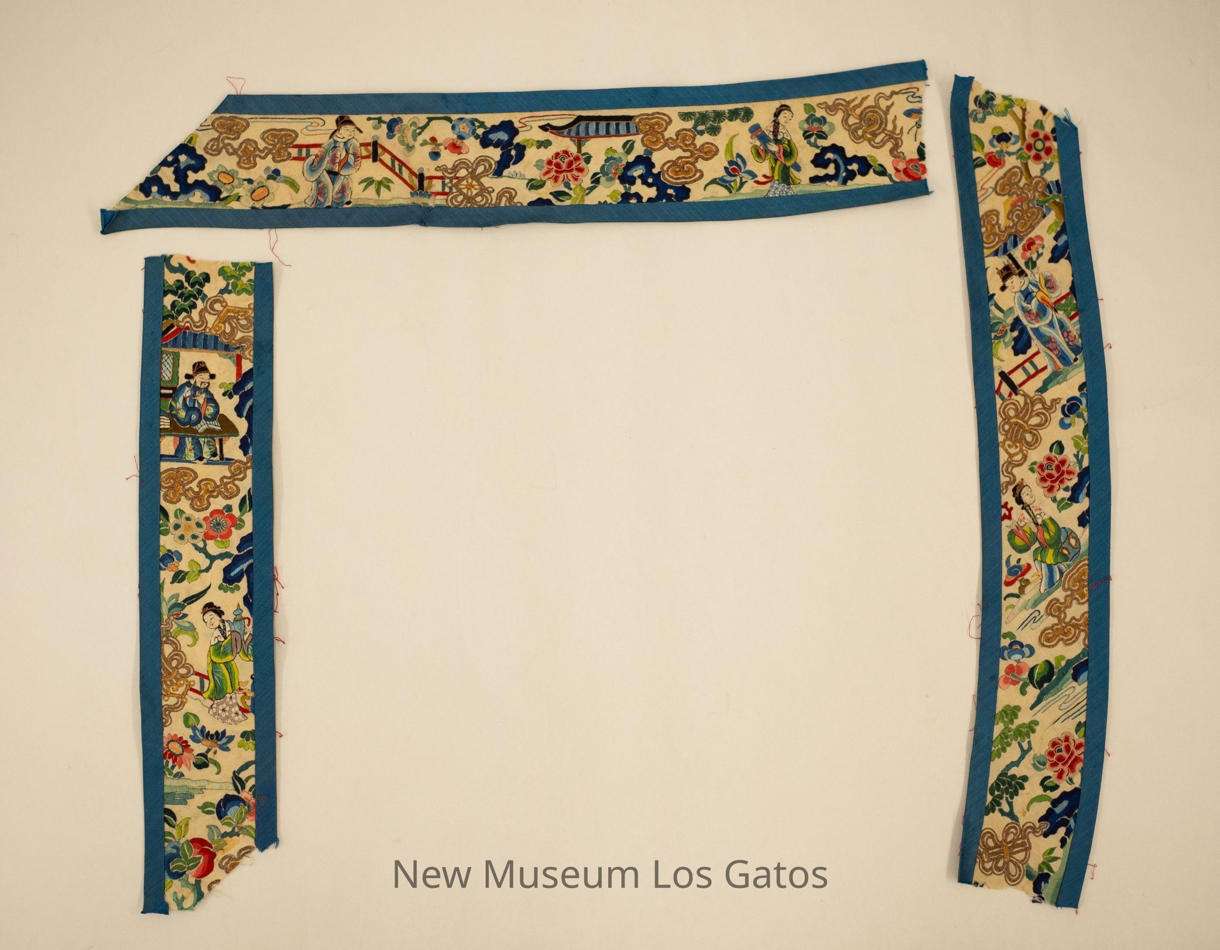 Three fabric strips featuring intricate decorative embroidery, one with a horizontal pattern and two with a vertical pattern. For all three pieces, the base color is beige, with thick blue edges. Each strip features a Chinese man and a Chinese woman in bright clothing, as well as vibrantly colored flowers and decorative metal patterns.Collection