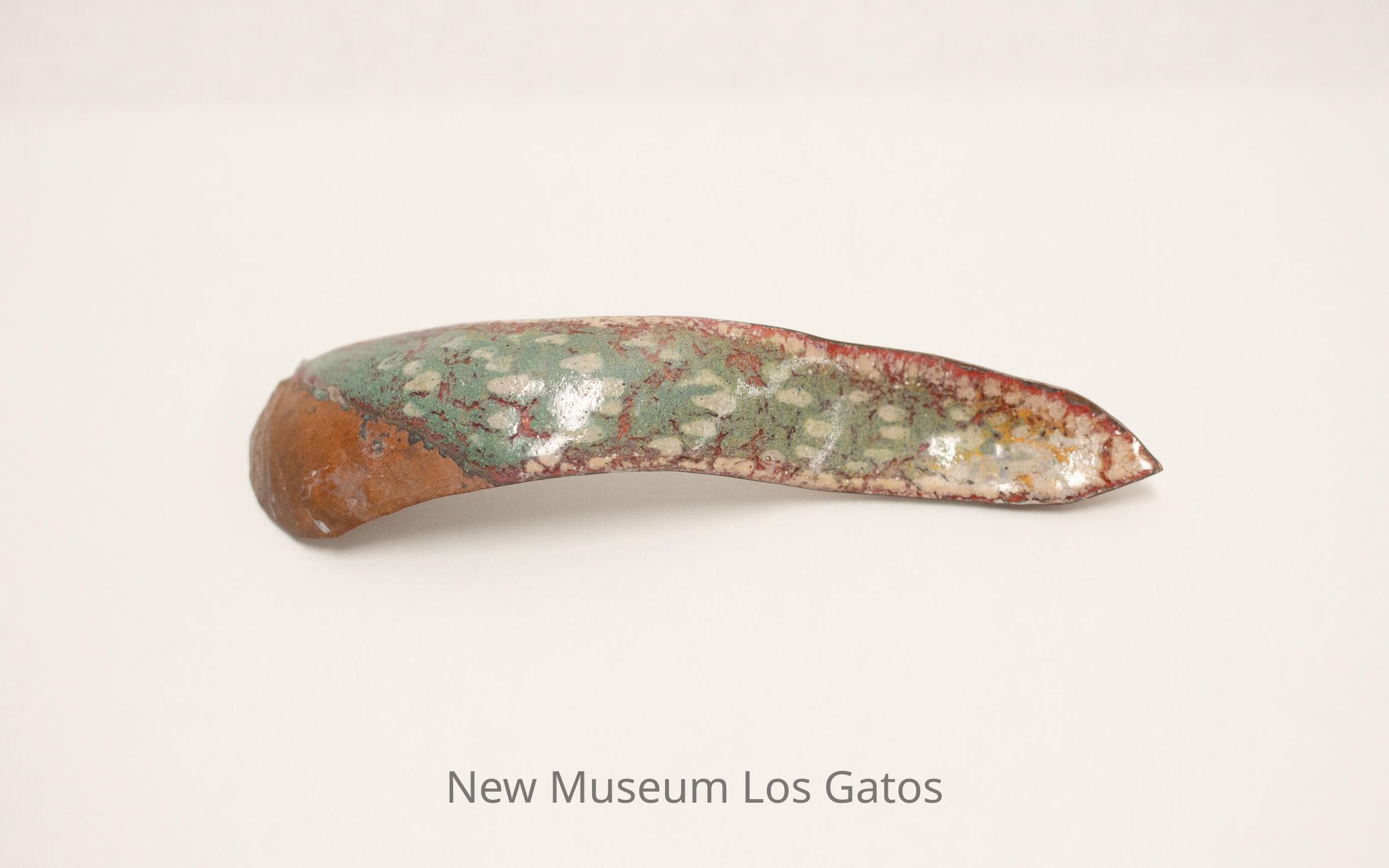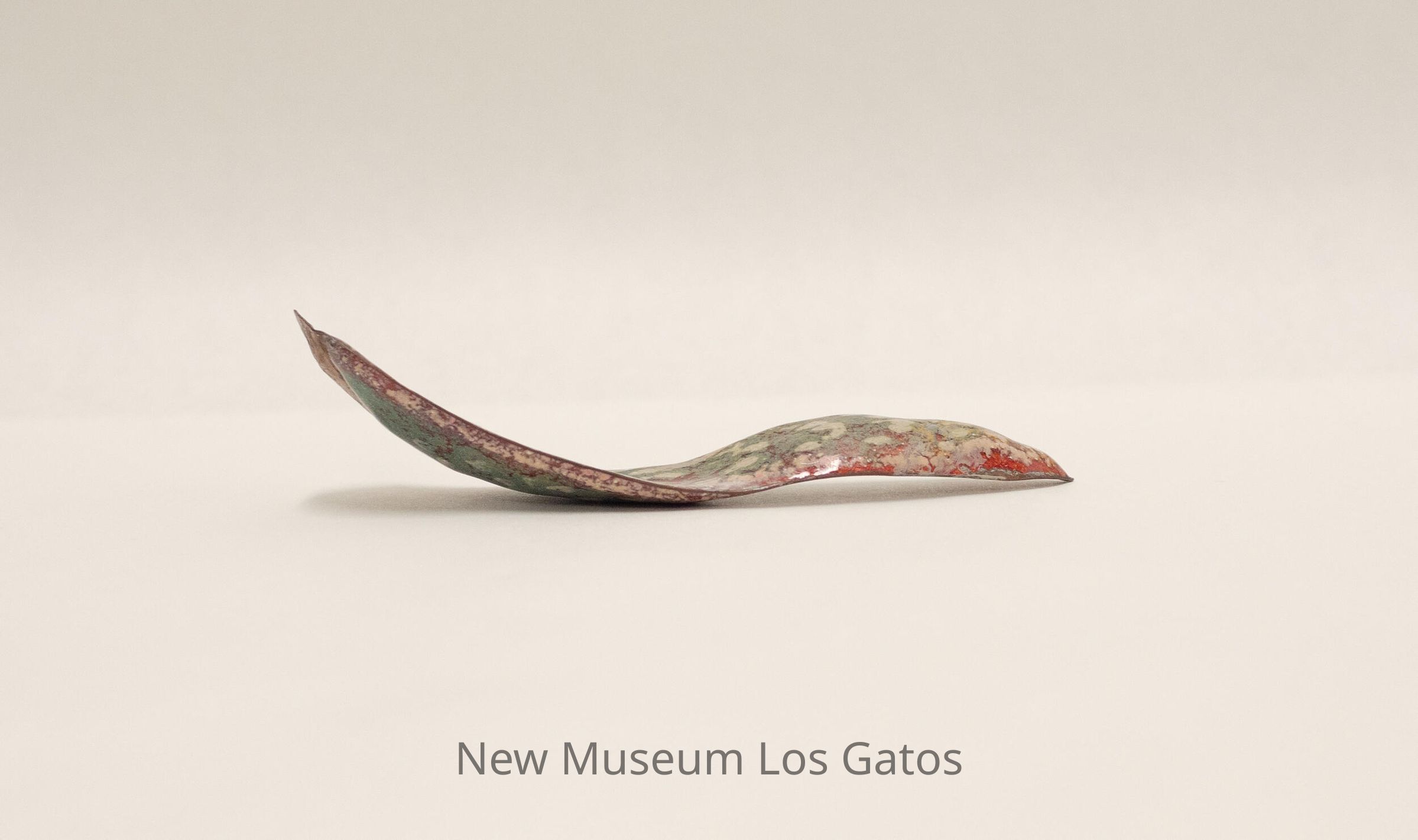 A skinny, curved piece of copper that is almost completely covered in colorful enamel. The enameled portions are green, red, pink, yellow, and white.Collection