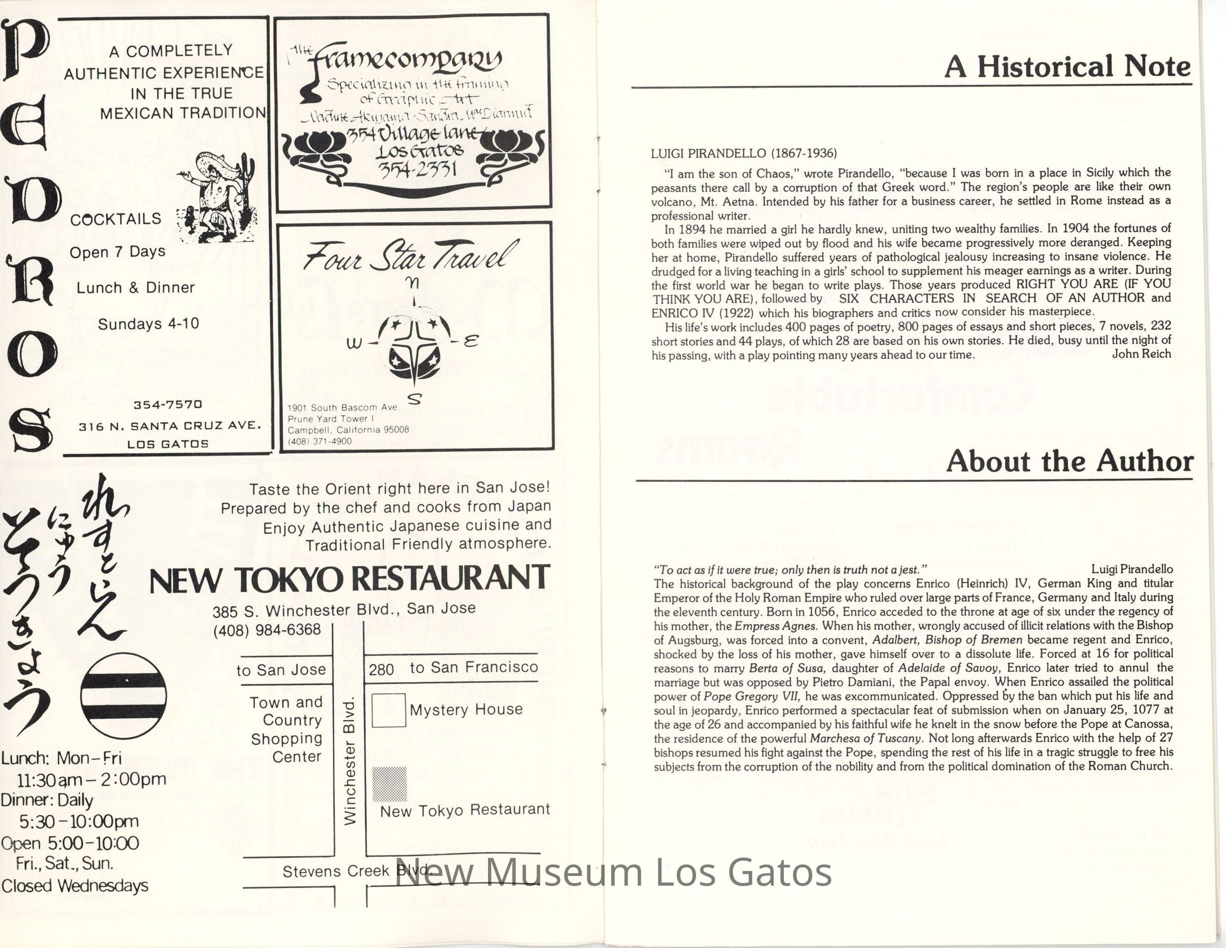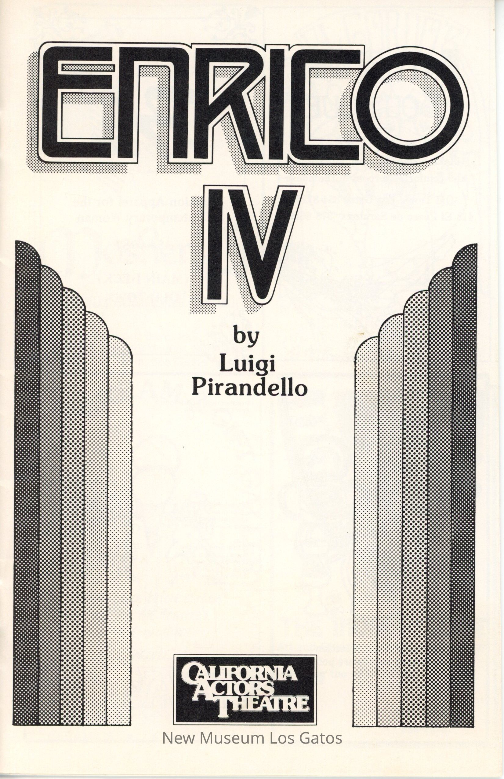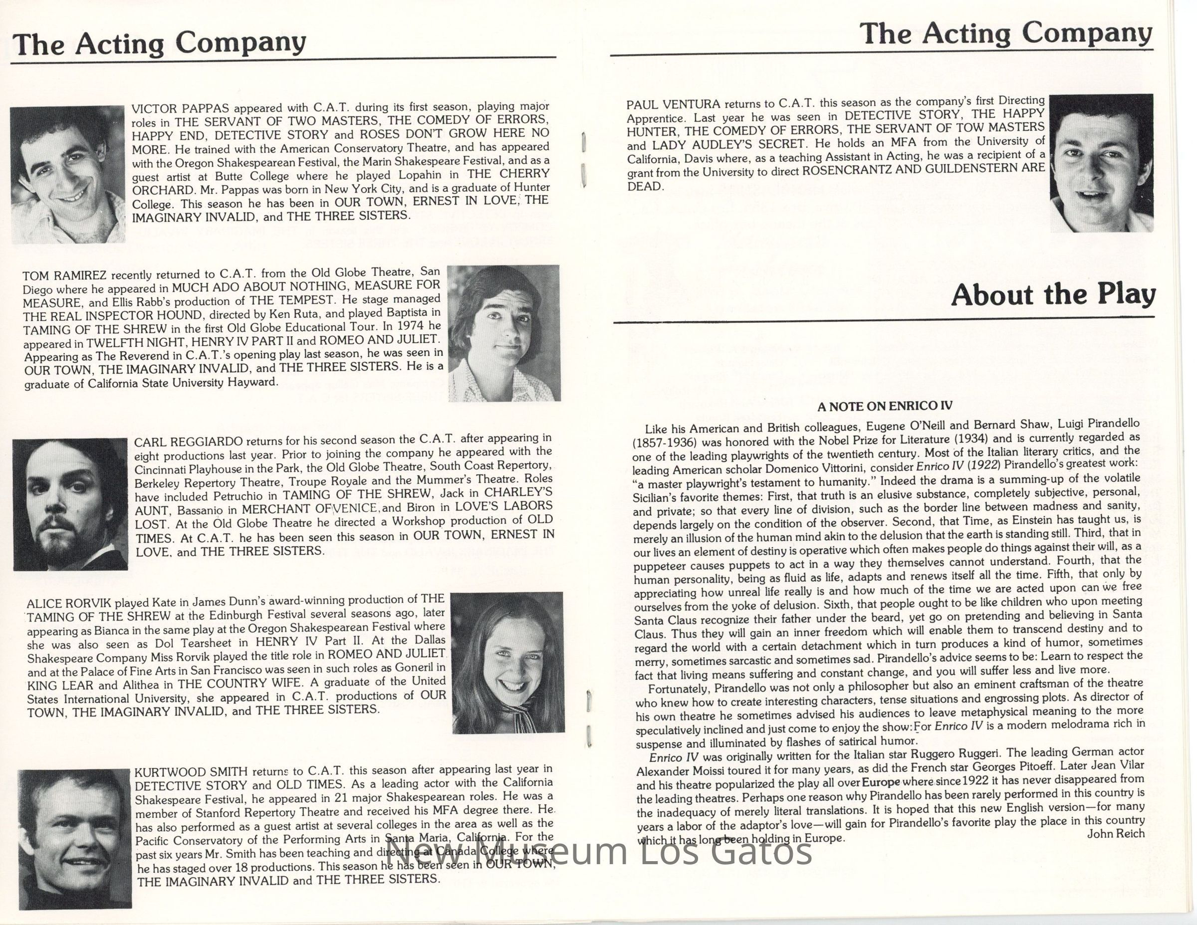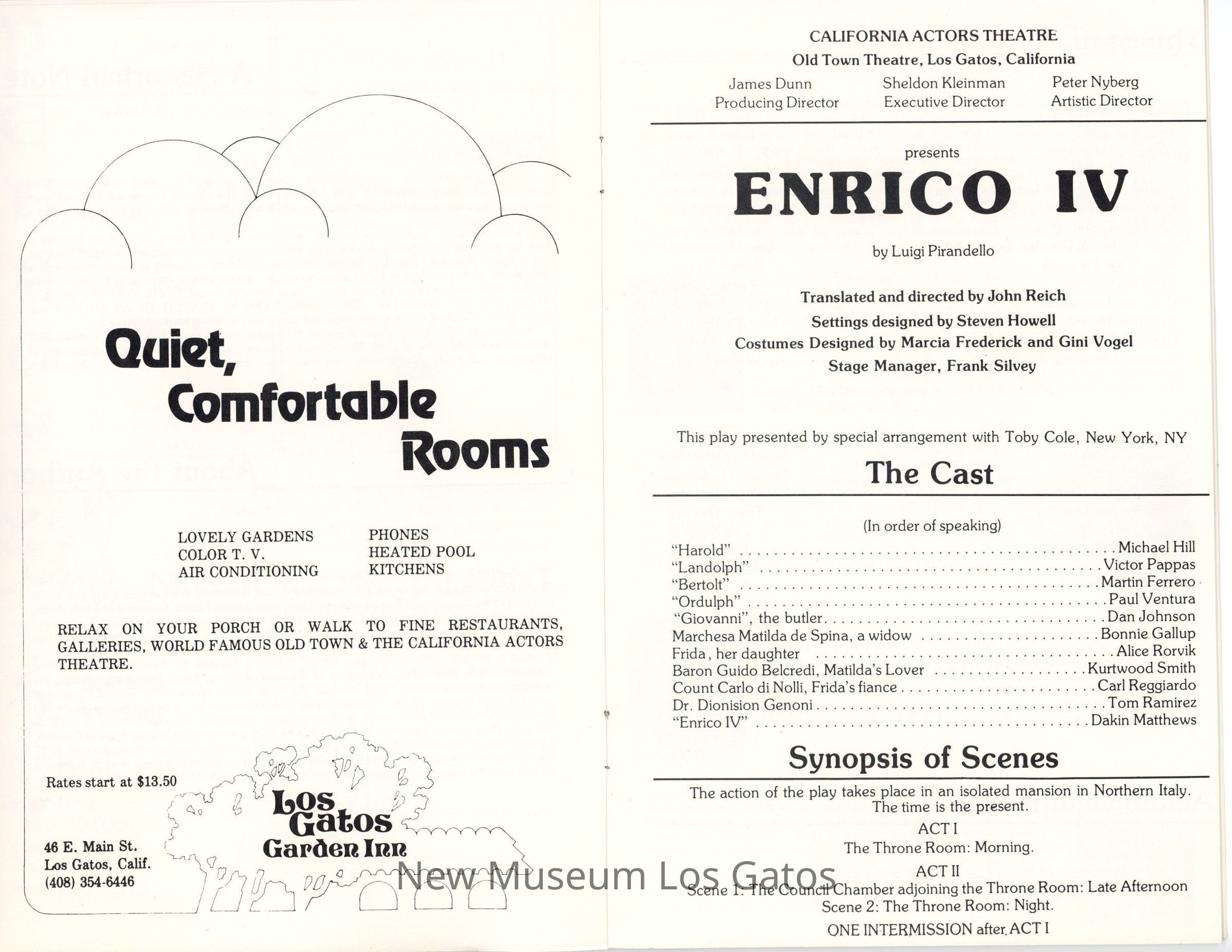 The show program/playbill for the California Actors Theatre 1976 production of "Enrico." The program includes advertisements, a full cast list, bios and headshots of the company, information on the upcoming production, as well as historical notes about the time period, author, and play itself.Collection