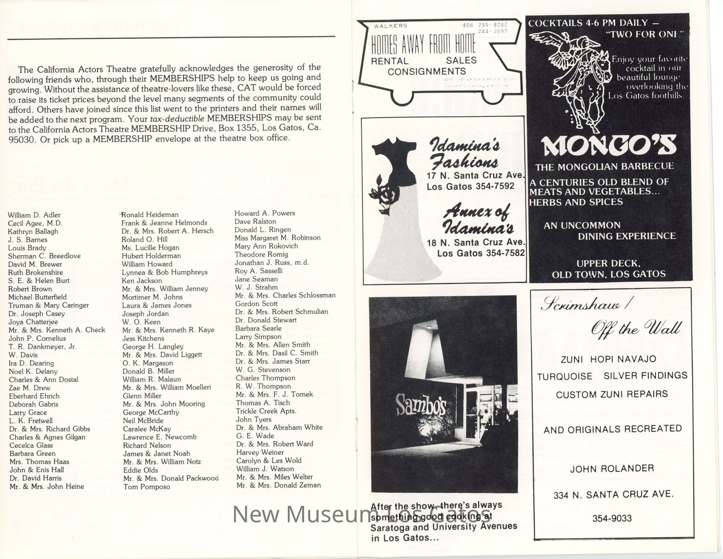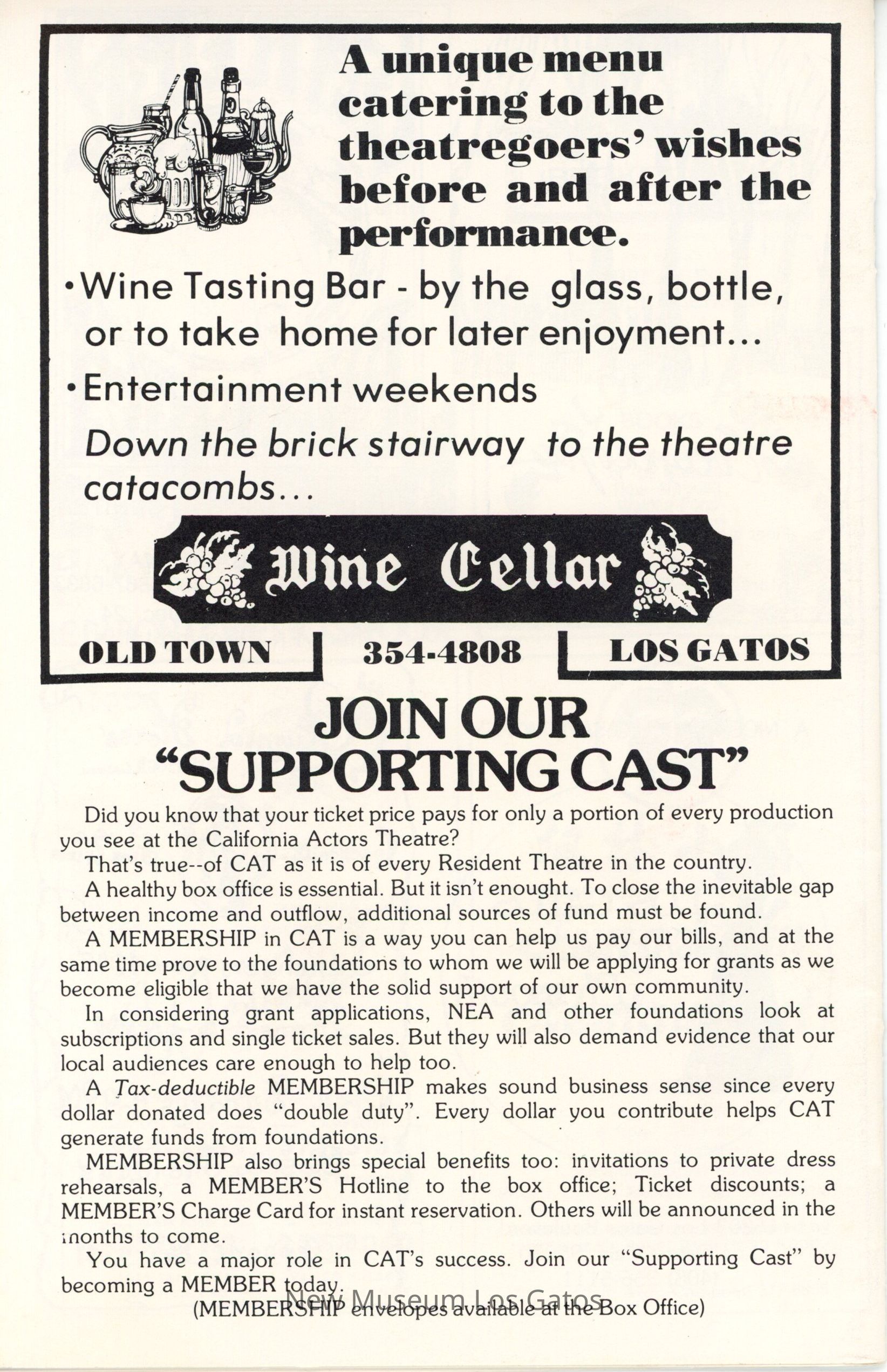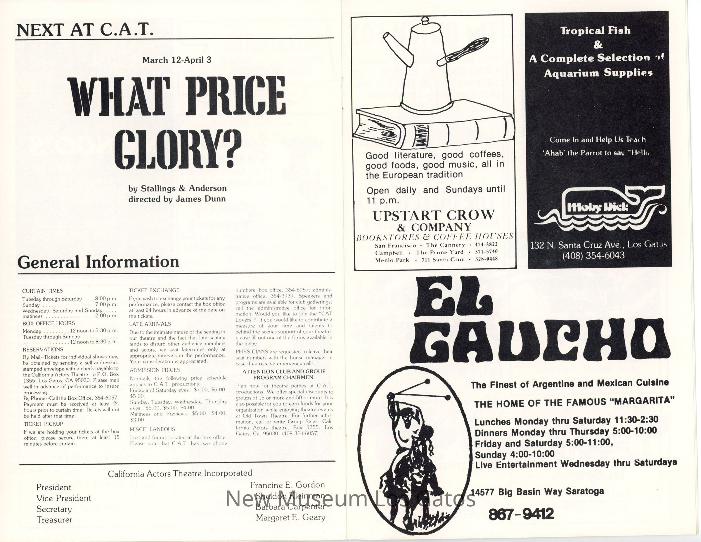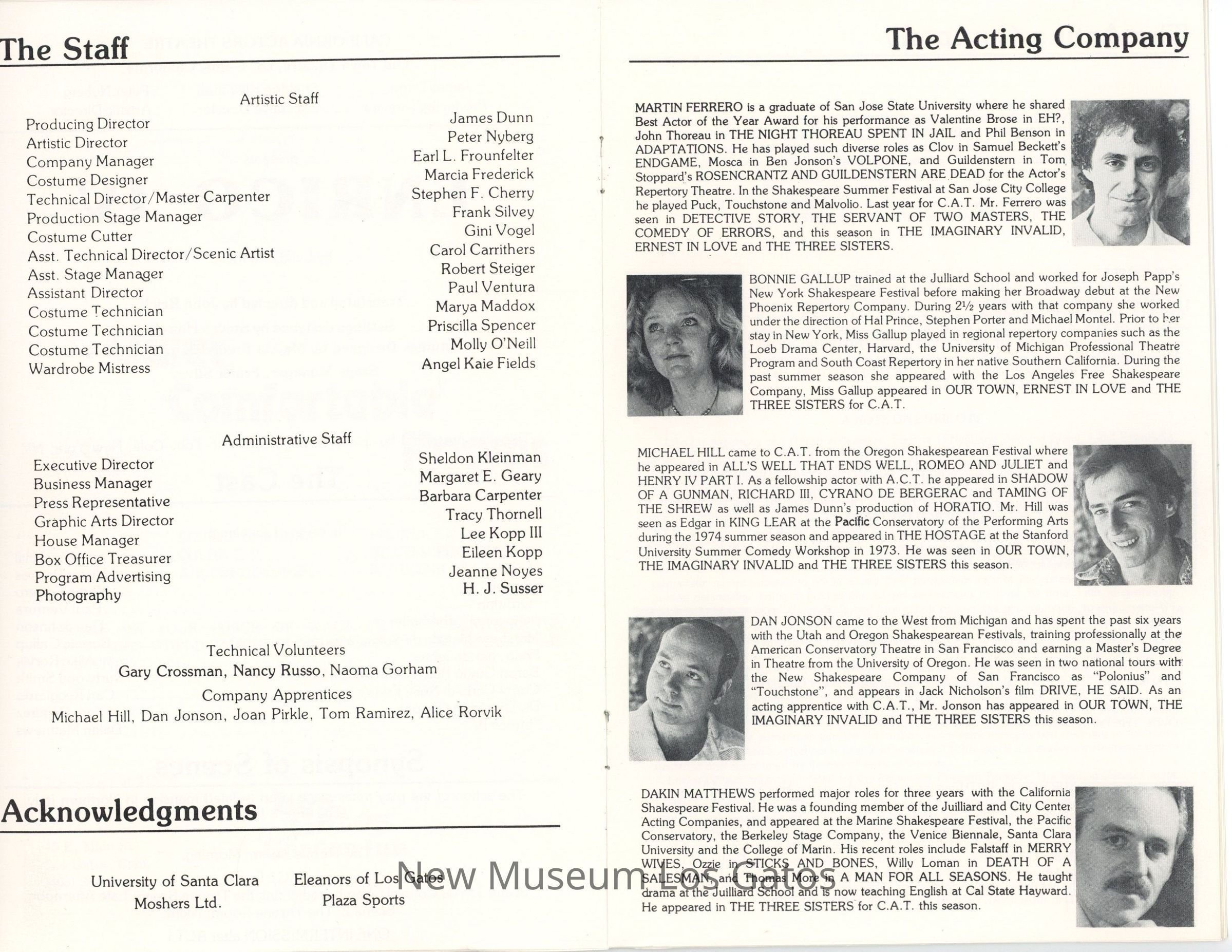 The show program/playbill for the California Actors Theatre 1976 production of "Enrico." The program includes advertisements, a full cast list, bios and headshots of the company, information on the upcoming production, as well as historical notes about the time period, author, and play itself.Collection