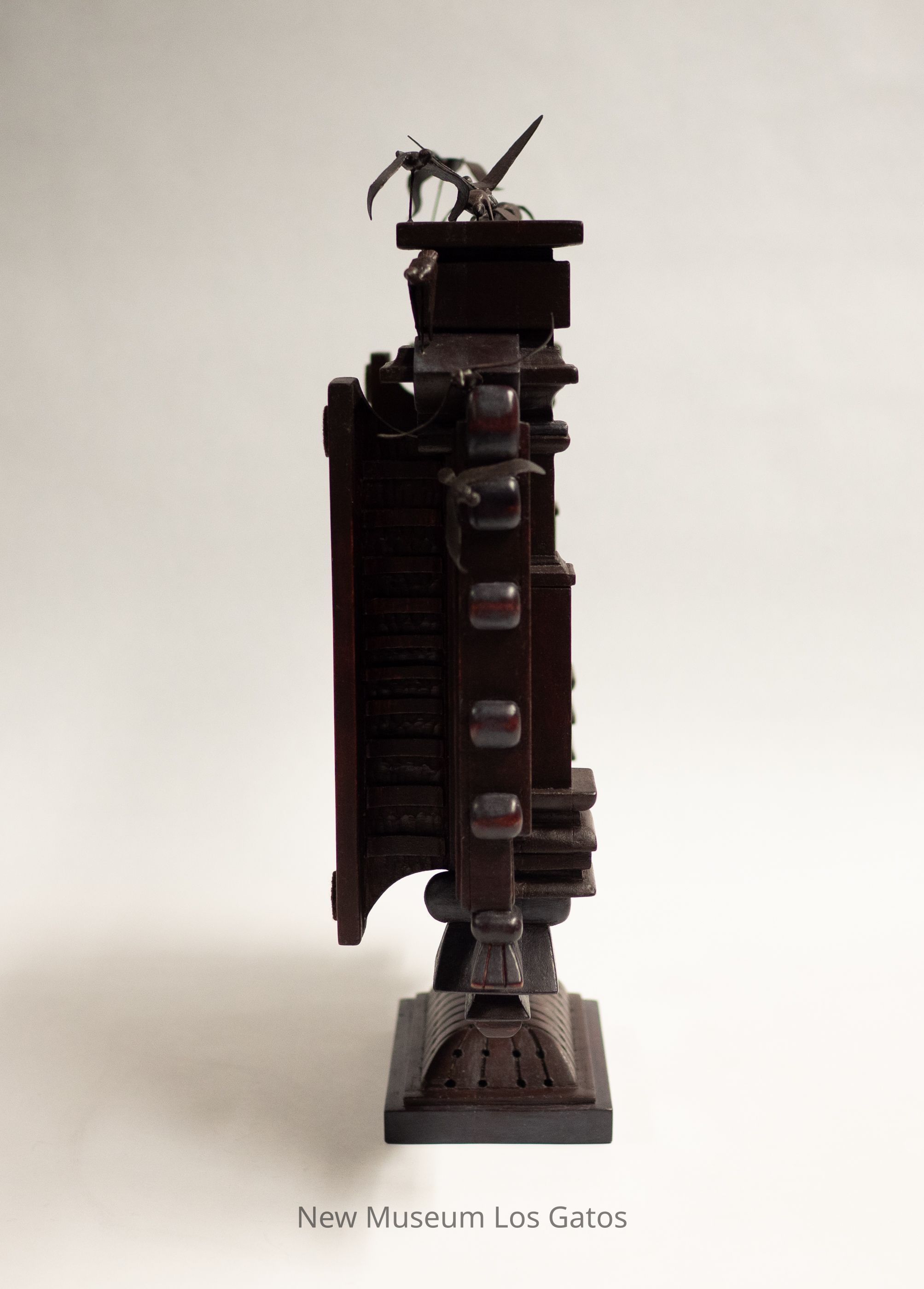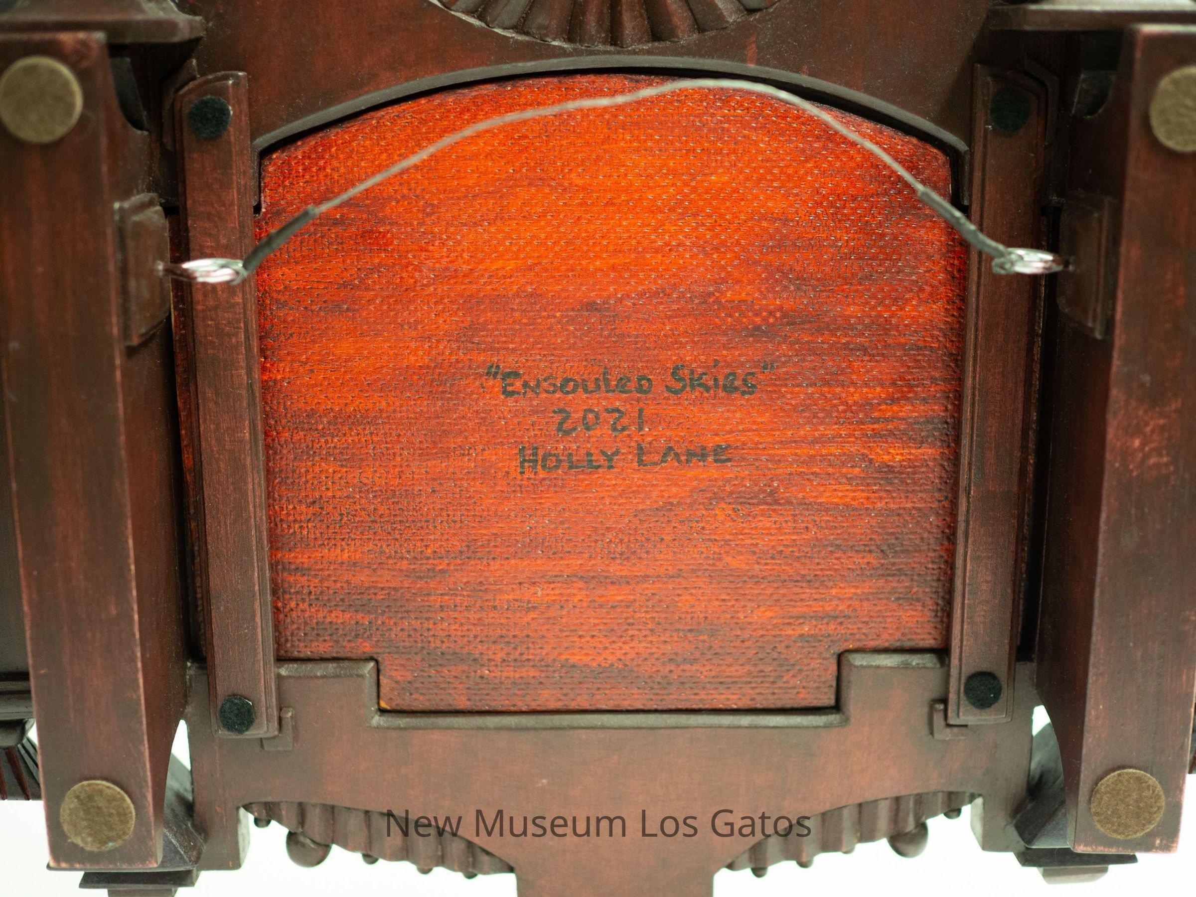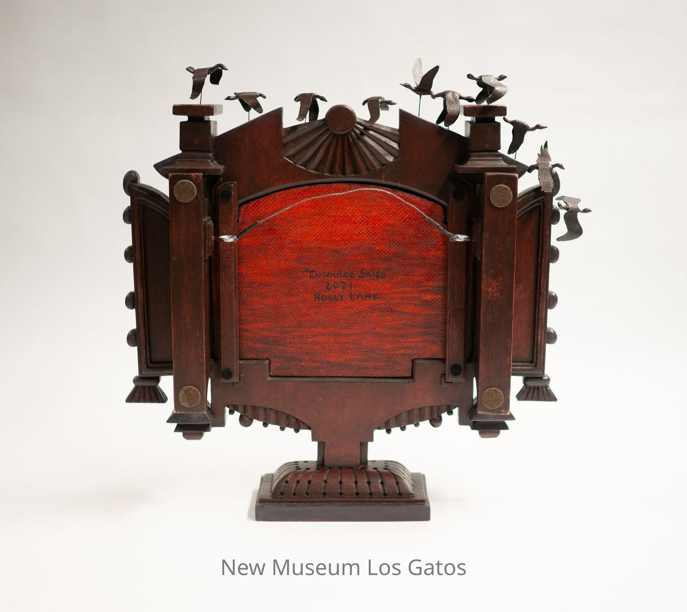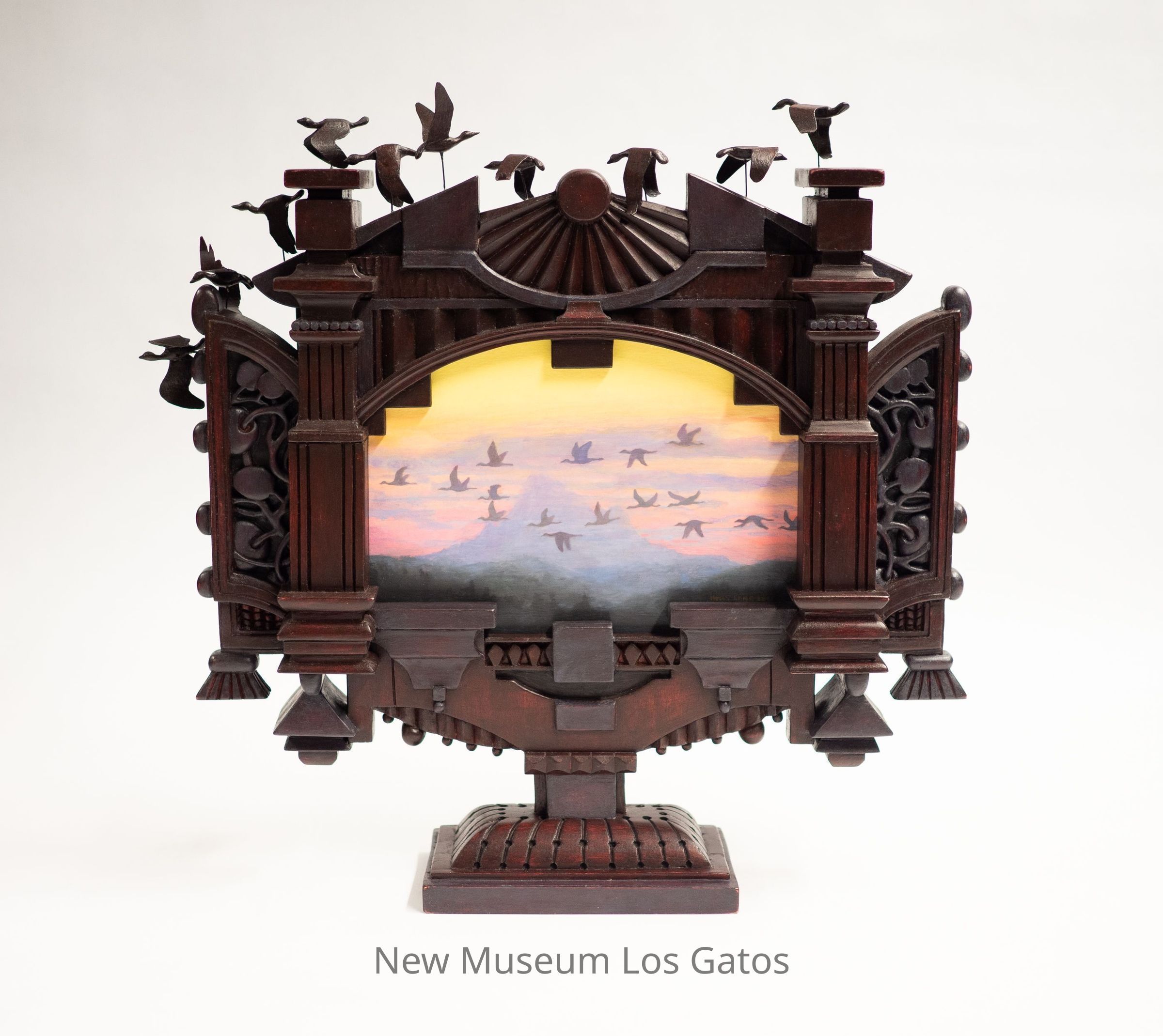 A mixed media sculpture, consisting of an acrylic painting surrounded by an intricately carved wooden frame. The painting features geese flying over trees, with a brilliant red, orange, and yellow sunset behind them. Surrounding the painting is a carved wooden frame, with linear and geometric motifs, as well as a vine and fruit motif at the left and right sides, and a sun at the top above the painting. Attached to the very top of the frame are ten carved wooden geese in various stages of flight.Type of Sculpture
