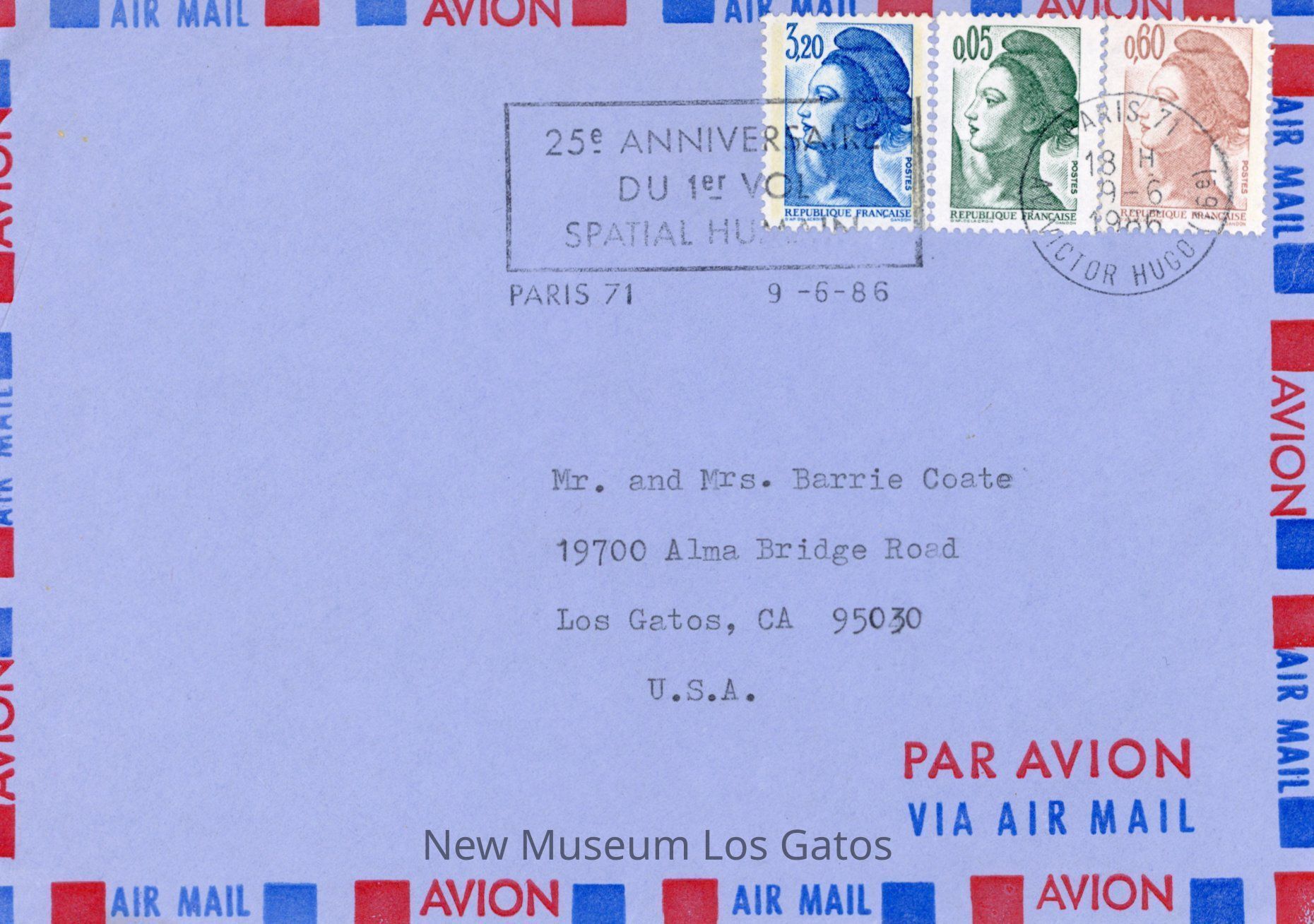 Small blue envelope, with a red and blue border around the edges. Envelope was mailed from France to the Coates. There are three stamps in the upper right corner, one blue, one green, and one red. The envelope is opened along the top edge, and there is nothing inside.Collection
