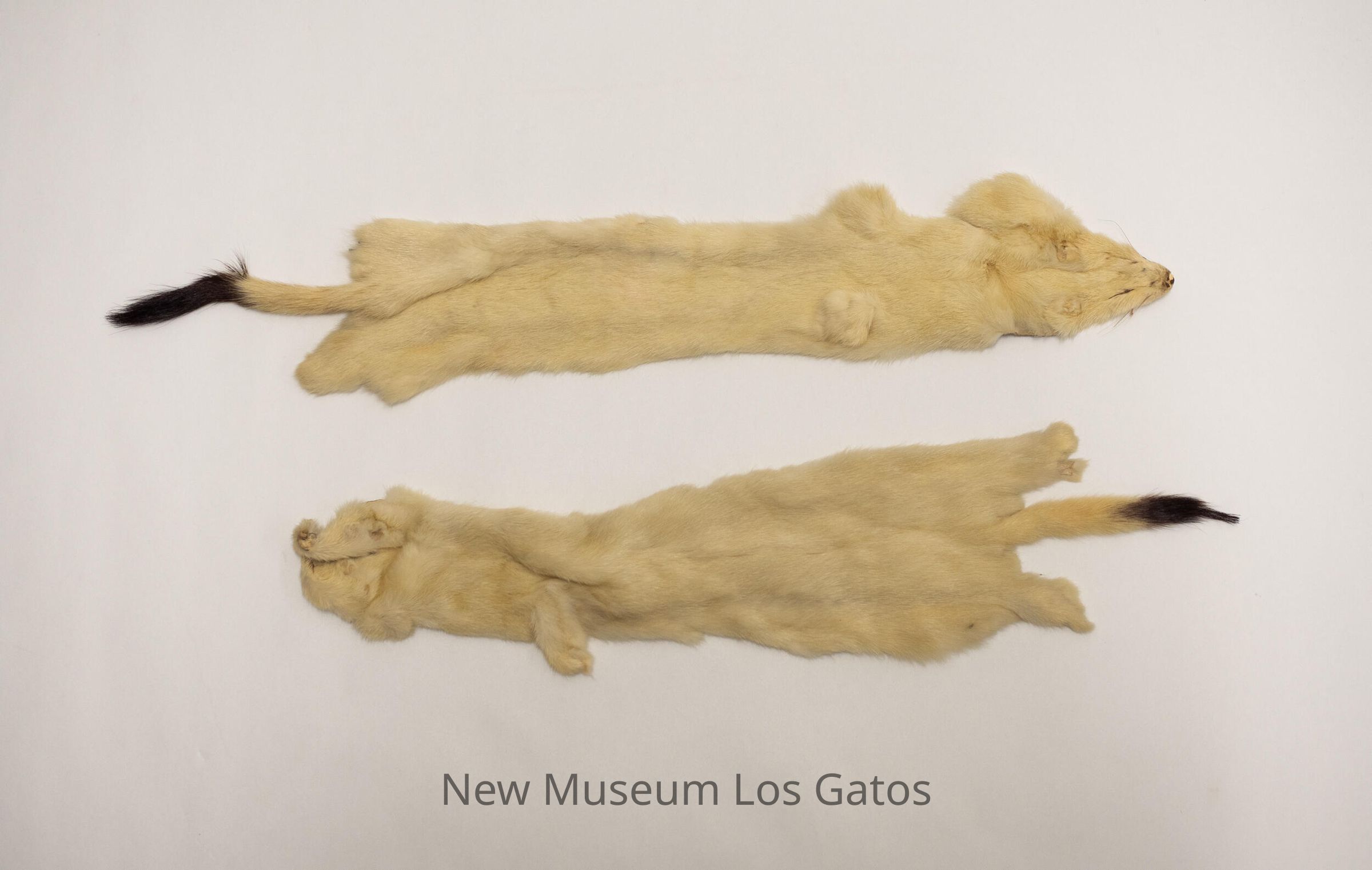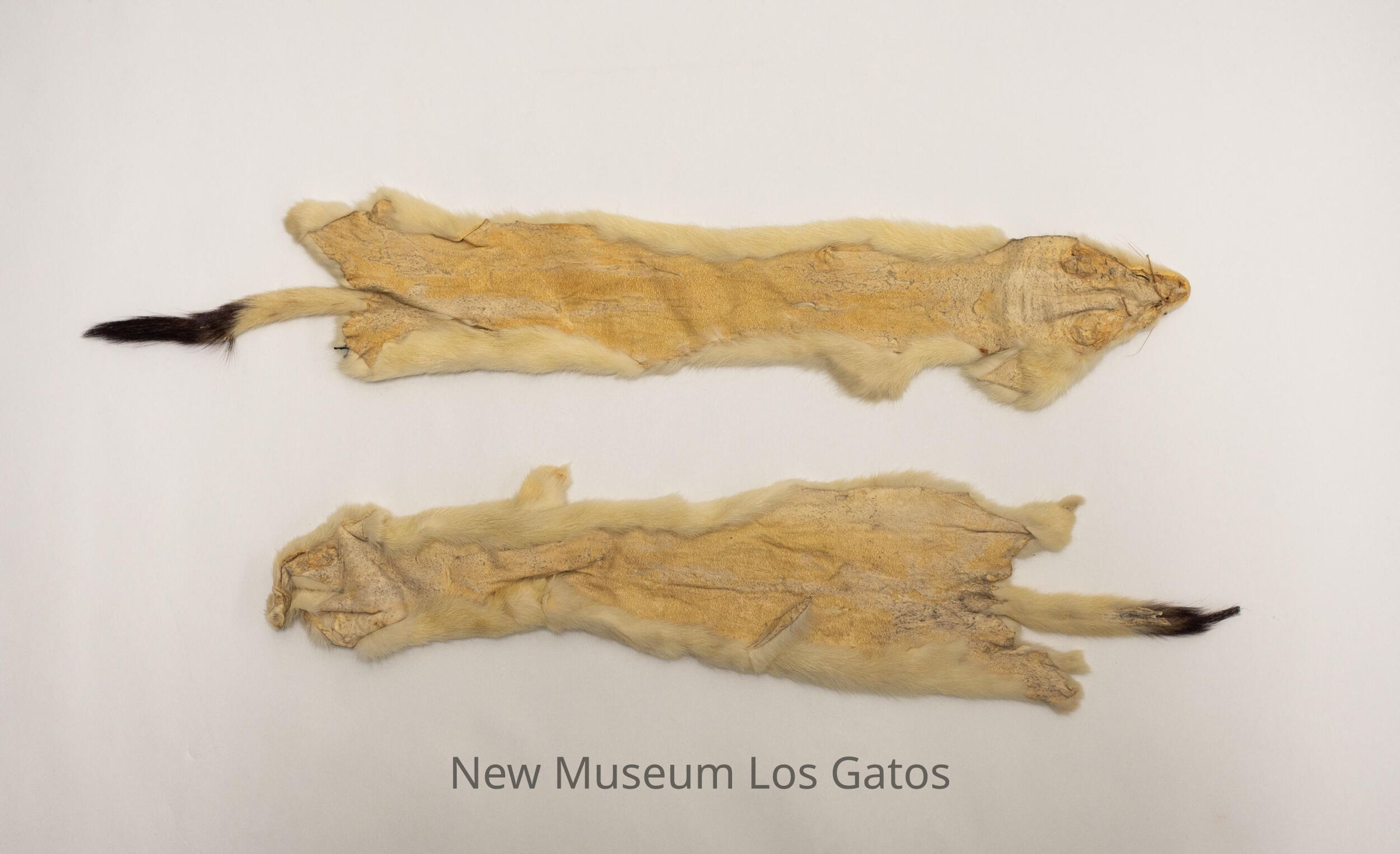 Two flattened animal skins. The majority of the coats are white, with brown-tipped tails.