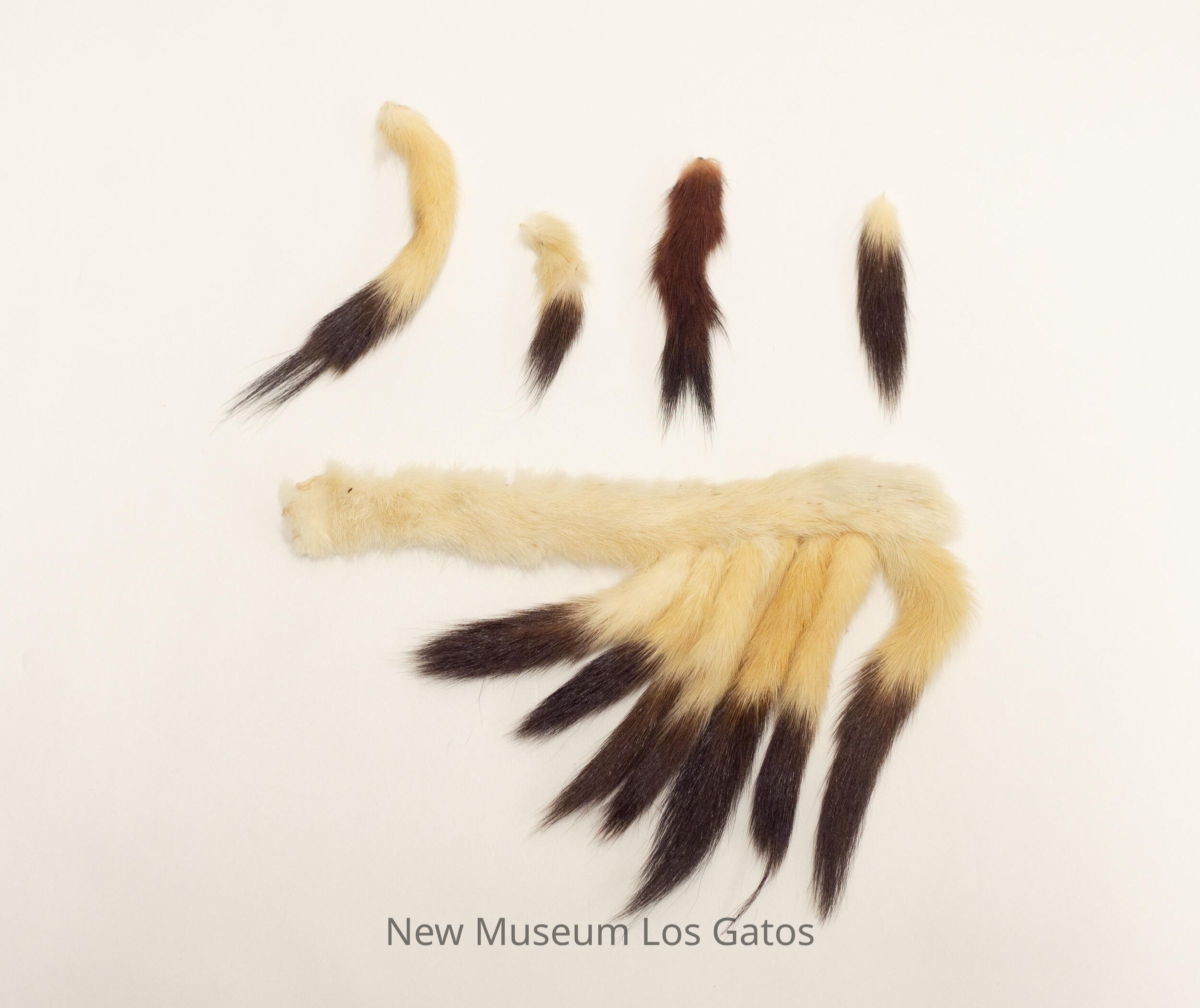 Twelve ermine tails; eight of the tails are attached to a seperate strip of ermine fur, and the other four ermine tails are individual. Eleven of the tails are white with brown tips, and one tail is light brown with a darker brown tip.Collection