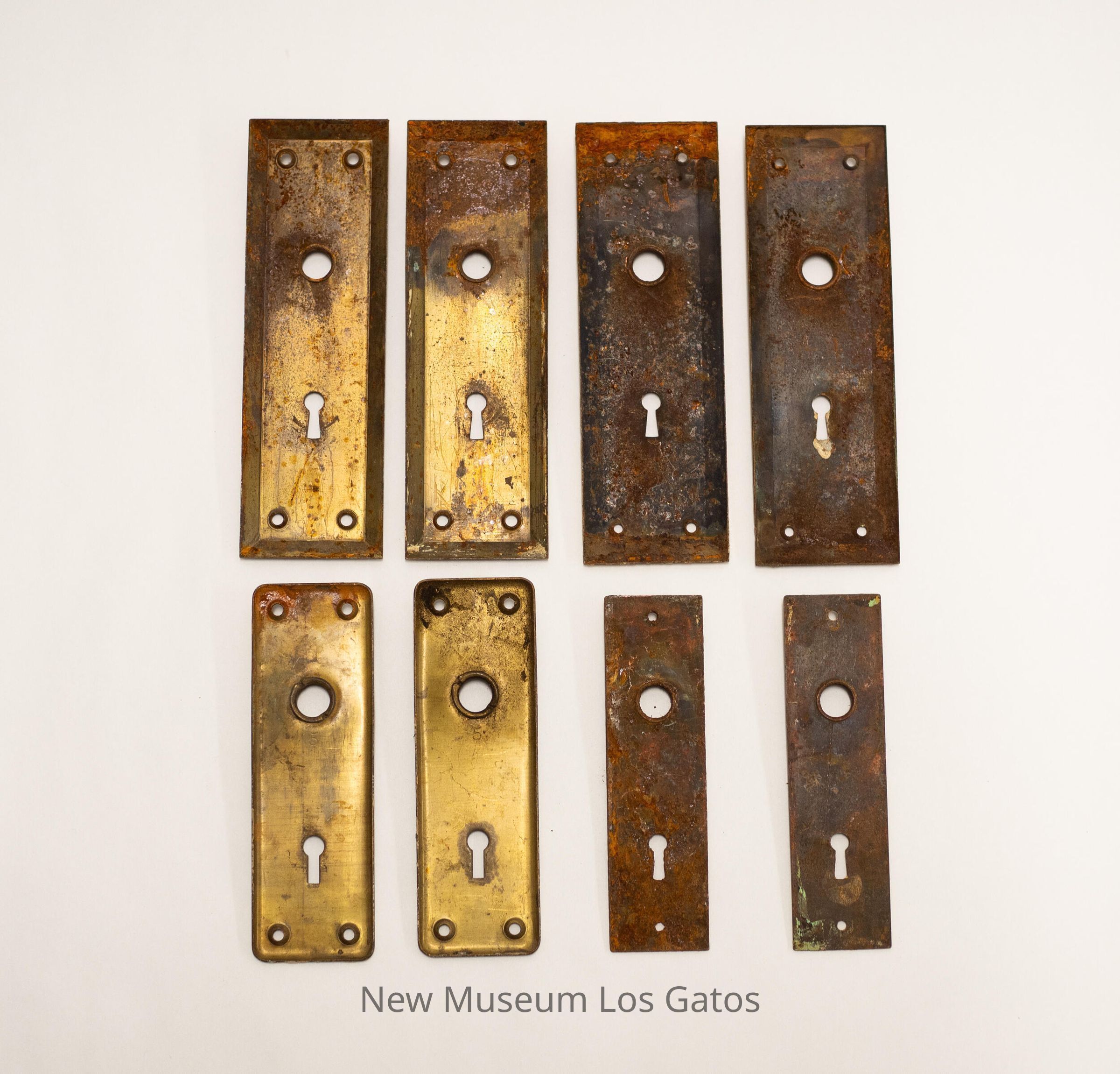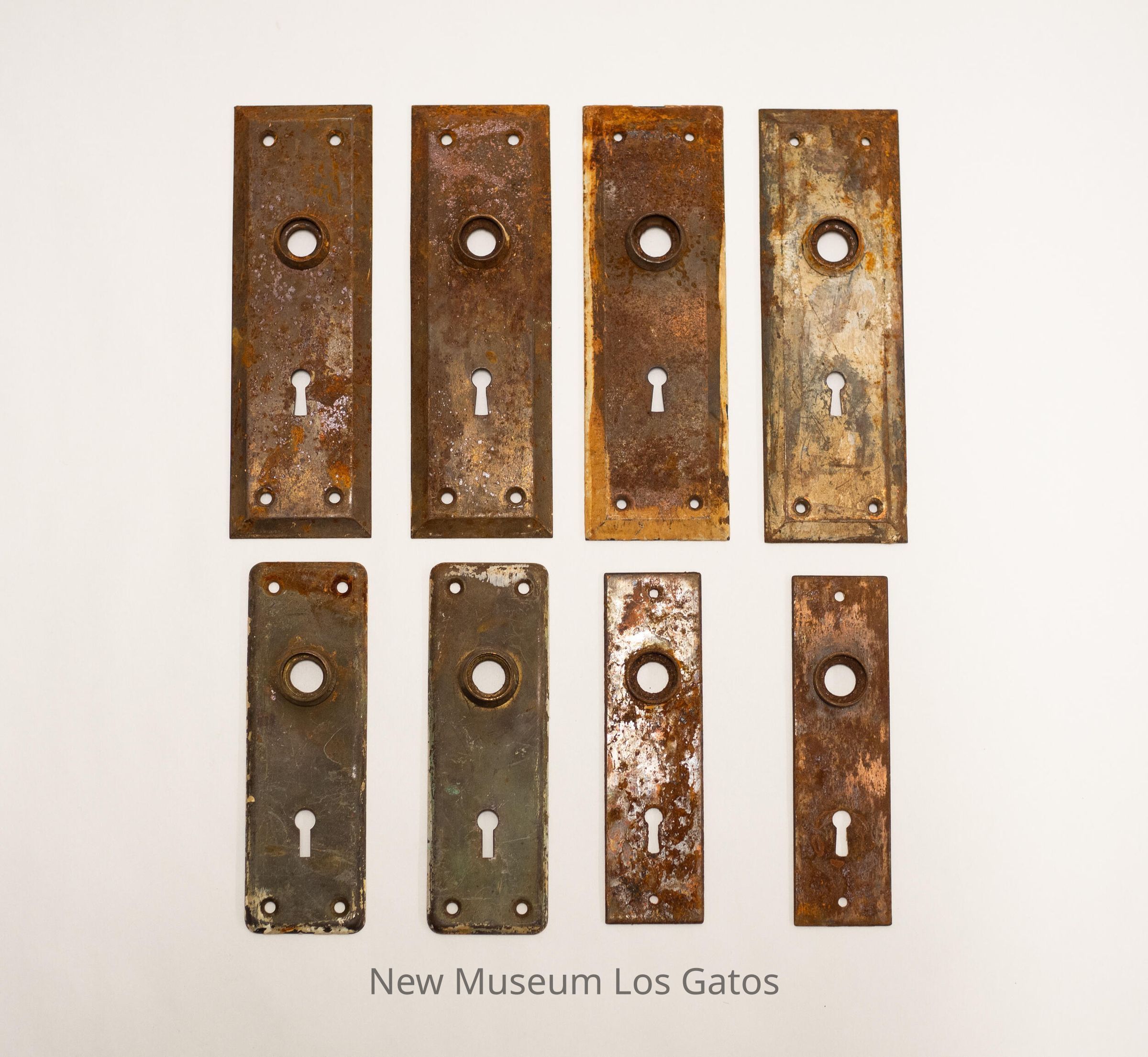 Eight rectangular escutcheons of varying sizes. Each escutcheon has a circular hole towards one end, and a keyhole towards the other end. Six escutcheons have four small holes, one in each corner, for securing to the door; the other two escutcheons have two small holes, one centered at each end.Collection