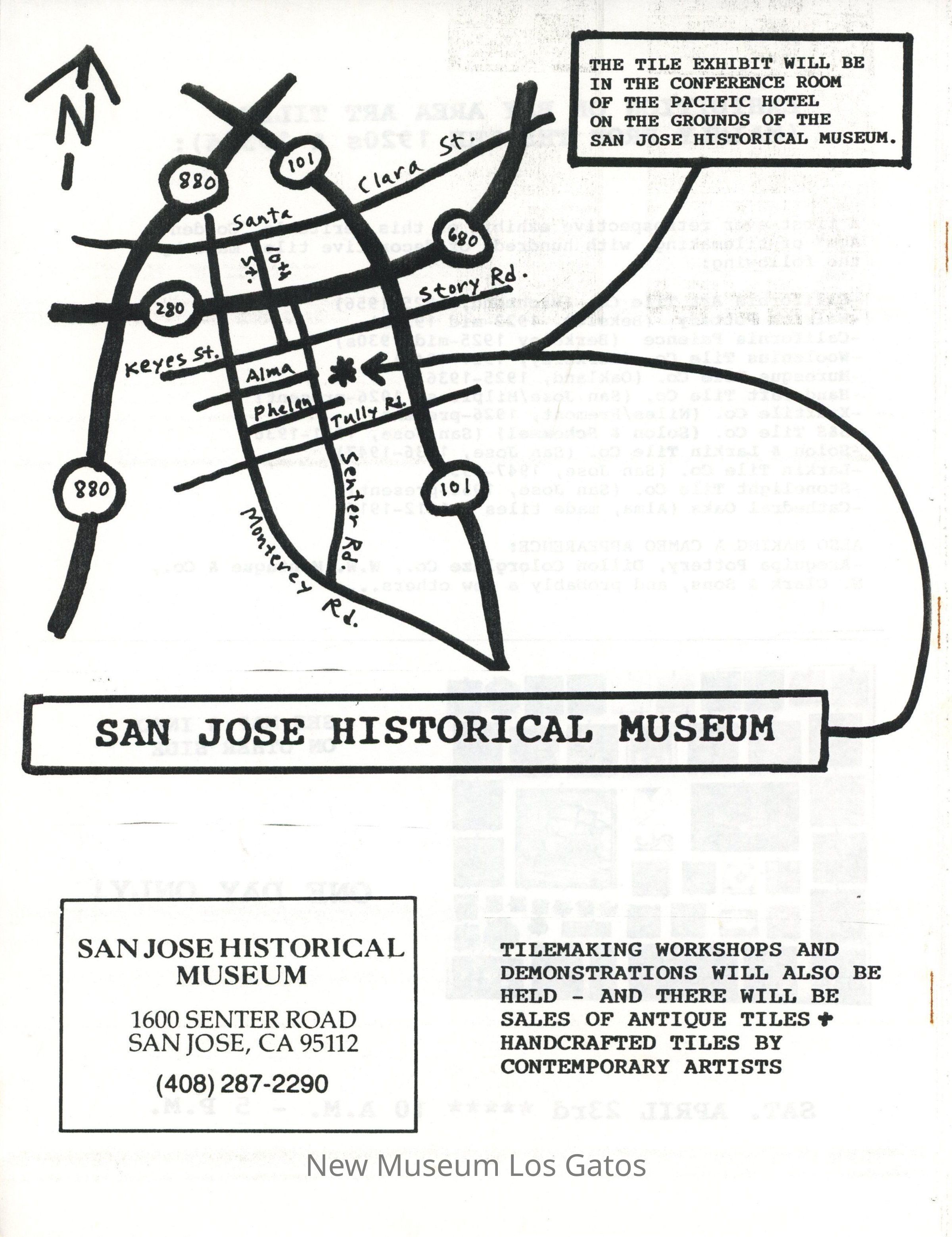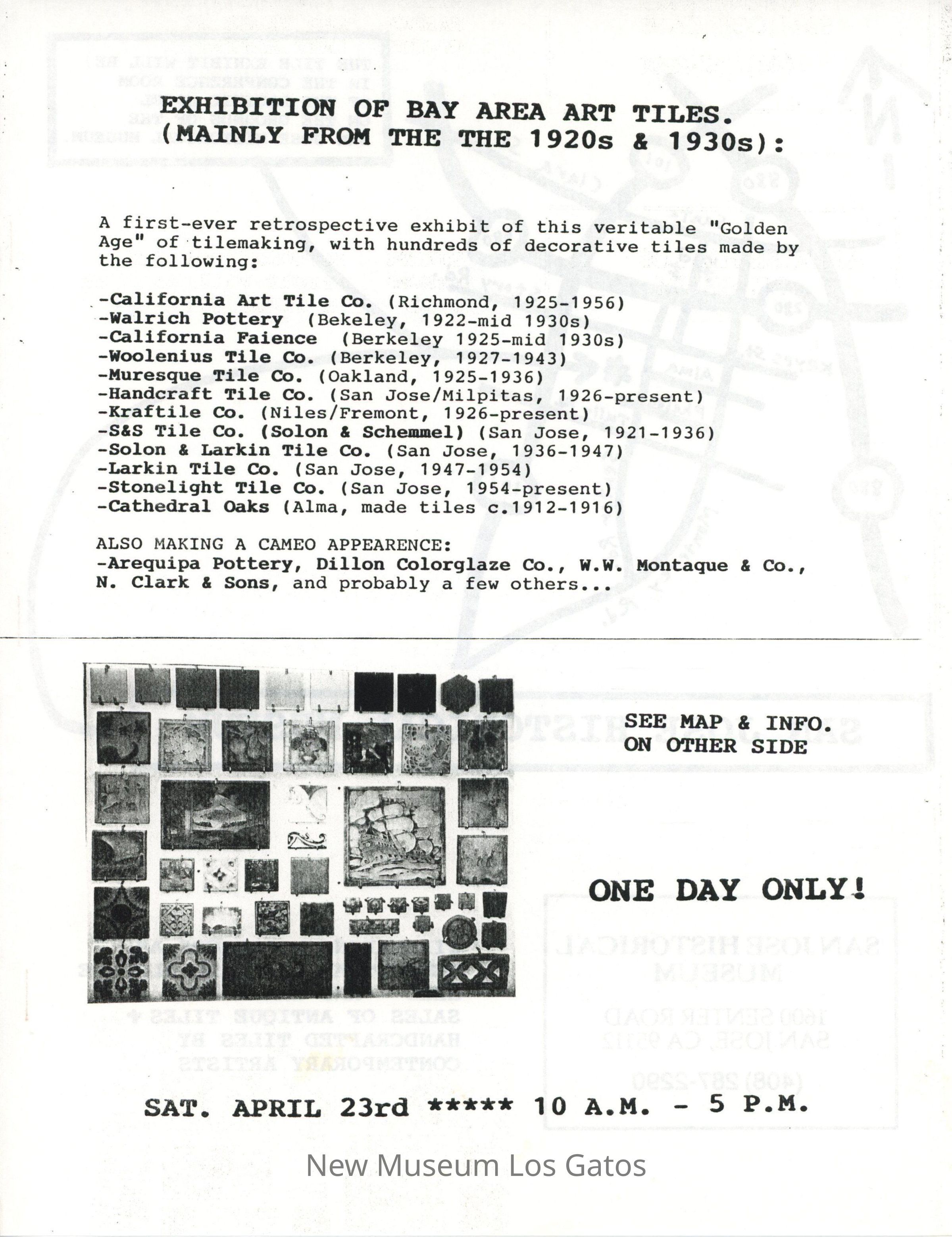 Black and white flyer for San Jose Historical Museum's exhibit, "Exhibition of Bay Area Art Tiles (mainly from the 1920's & 1930s)." The flyer has a list of exhibited artists, a map with directions on how to get to the museum, and information on workshops and demonstrations. The exhibition is dated Saturday, April 23rd.Collection