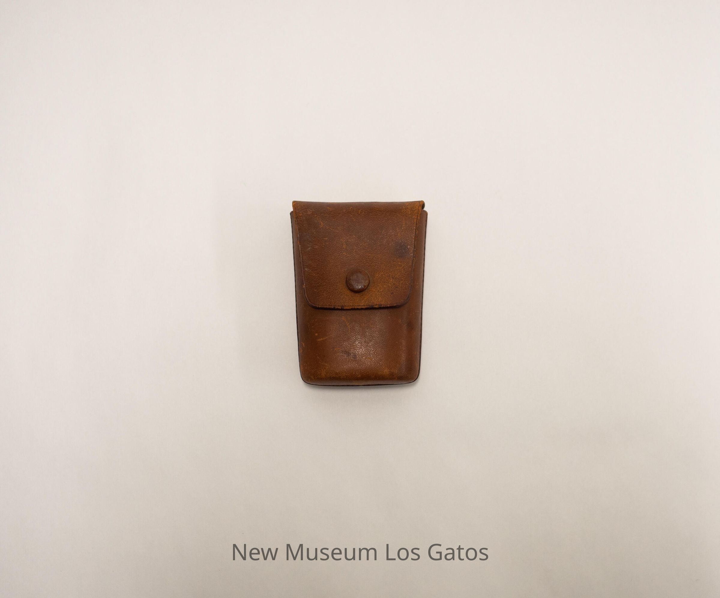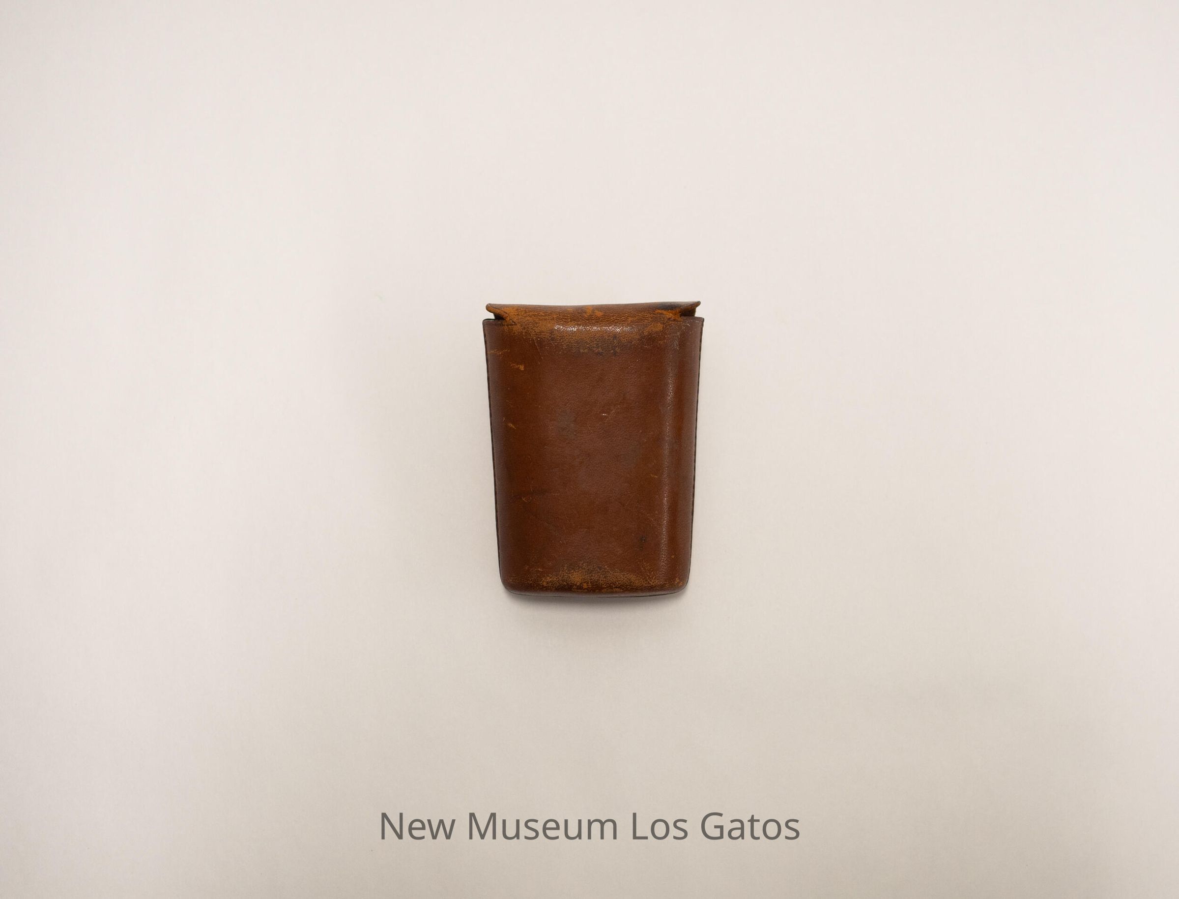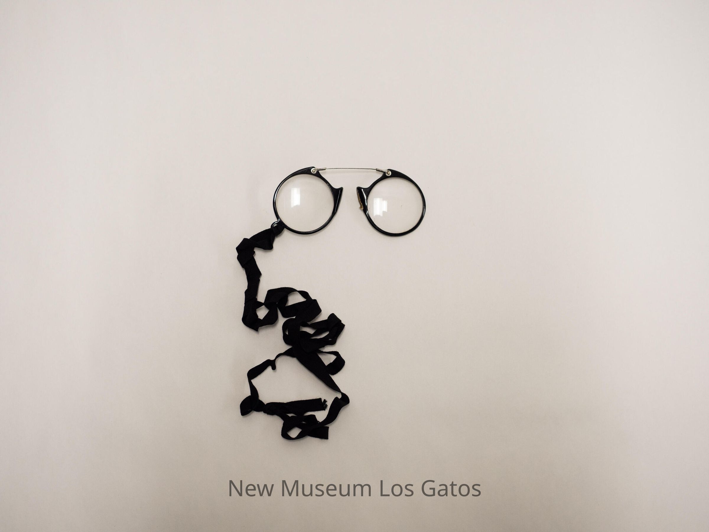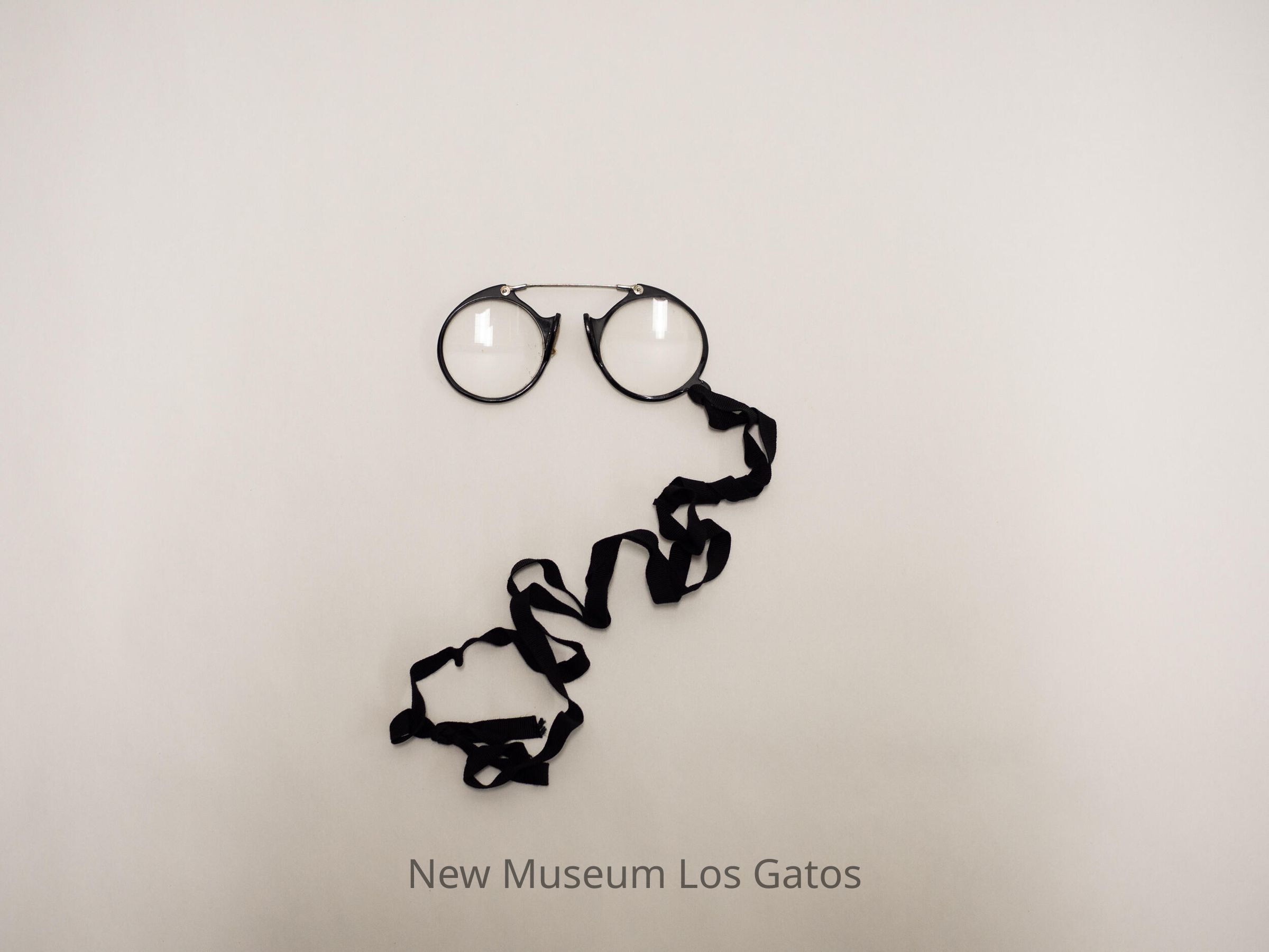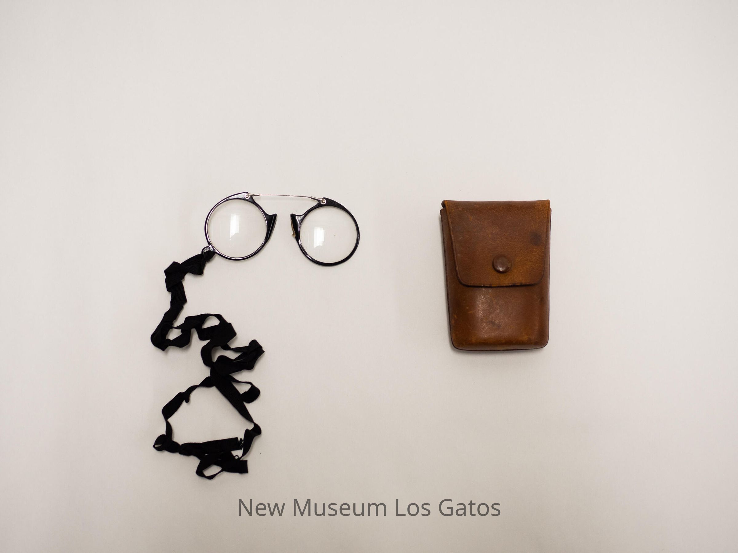 A pair of small, black eyeglasses with an attached black ribbon. The glasses are accompanied by a small, brown leather carrying case, with a glass liner inside.