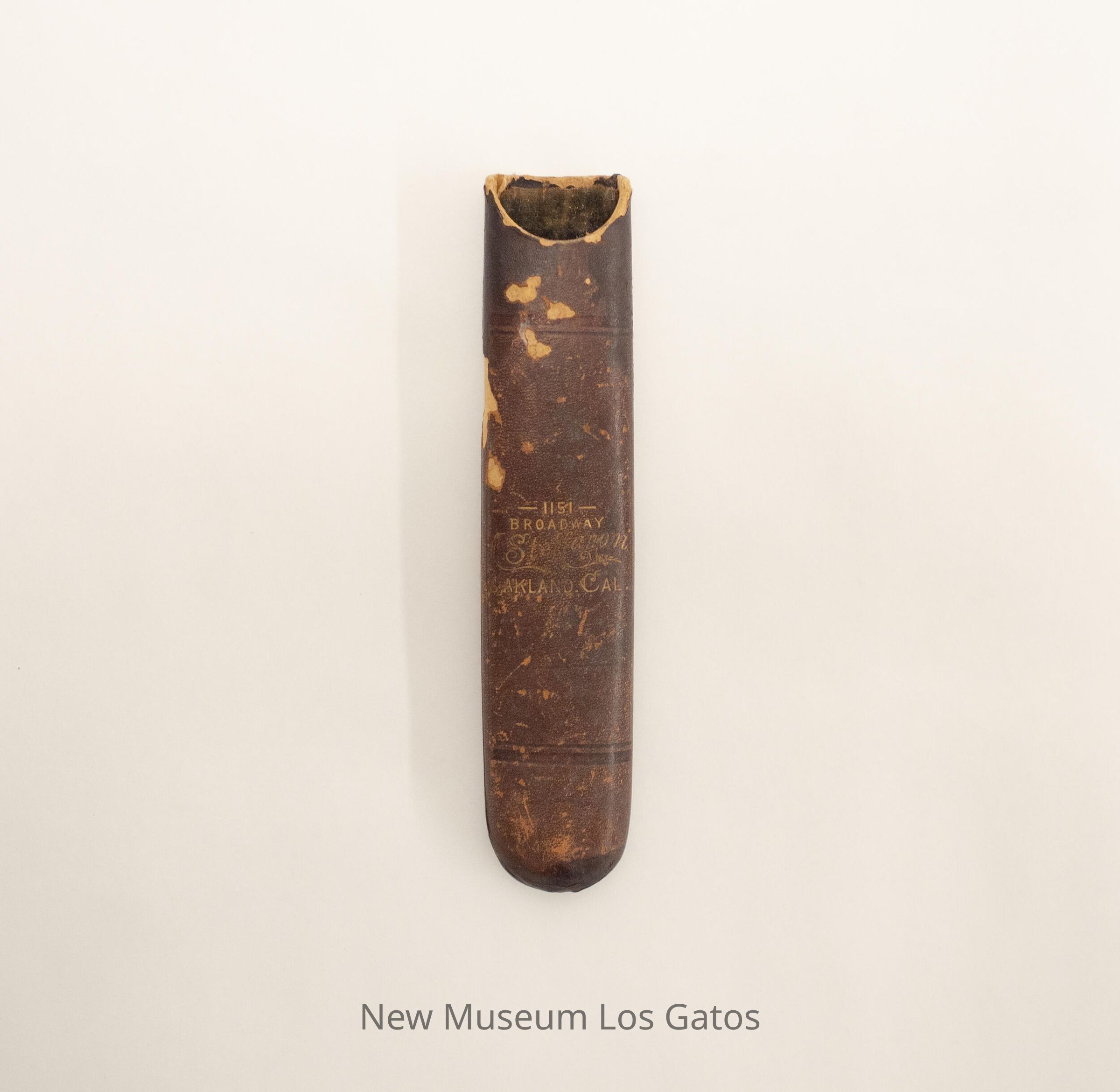A pair of wire-framed glasses with accompanying case. The lenses are circular in shape, and the wire is silver. The case is covered in brown leather and open on one side, with the information of the shop inscribed on one side in gold.