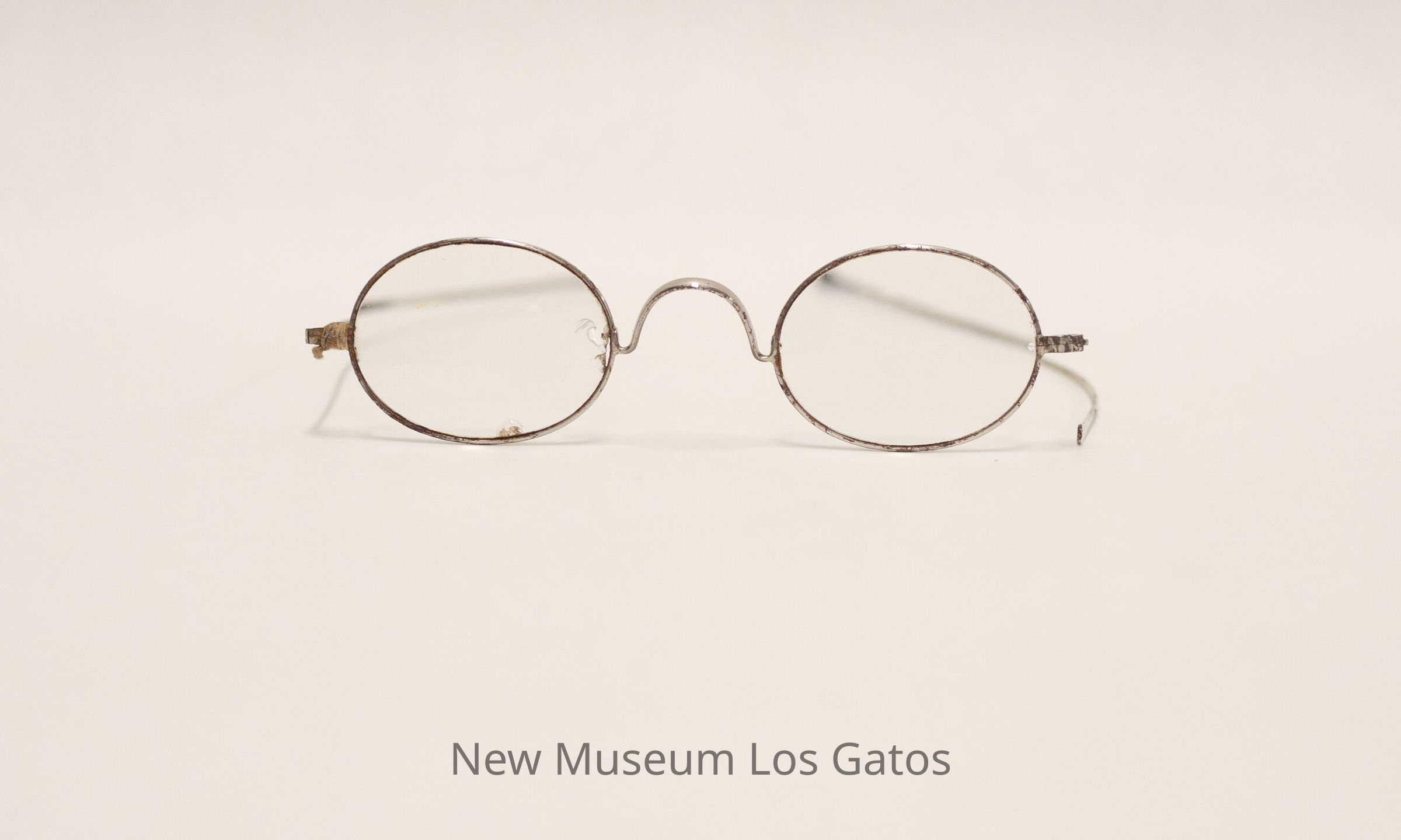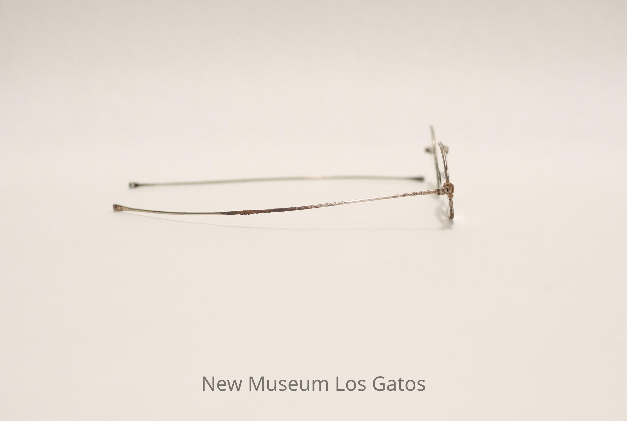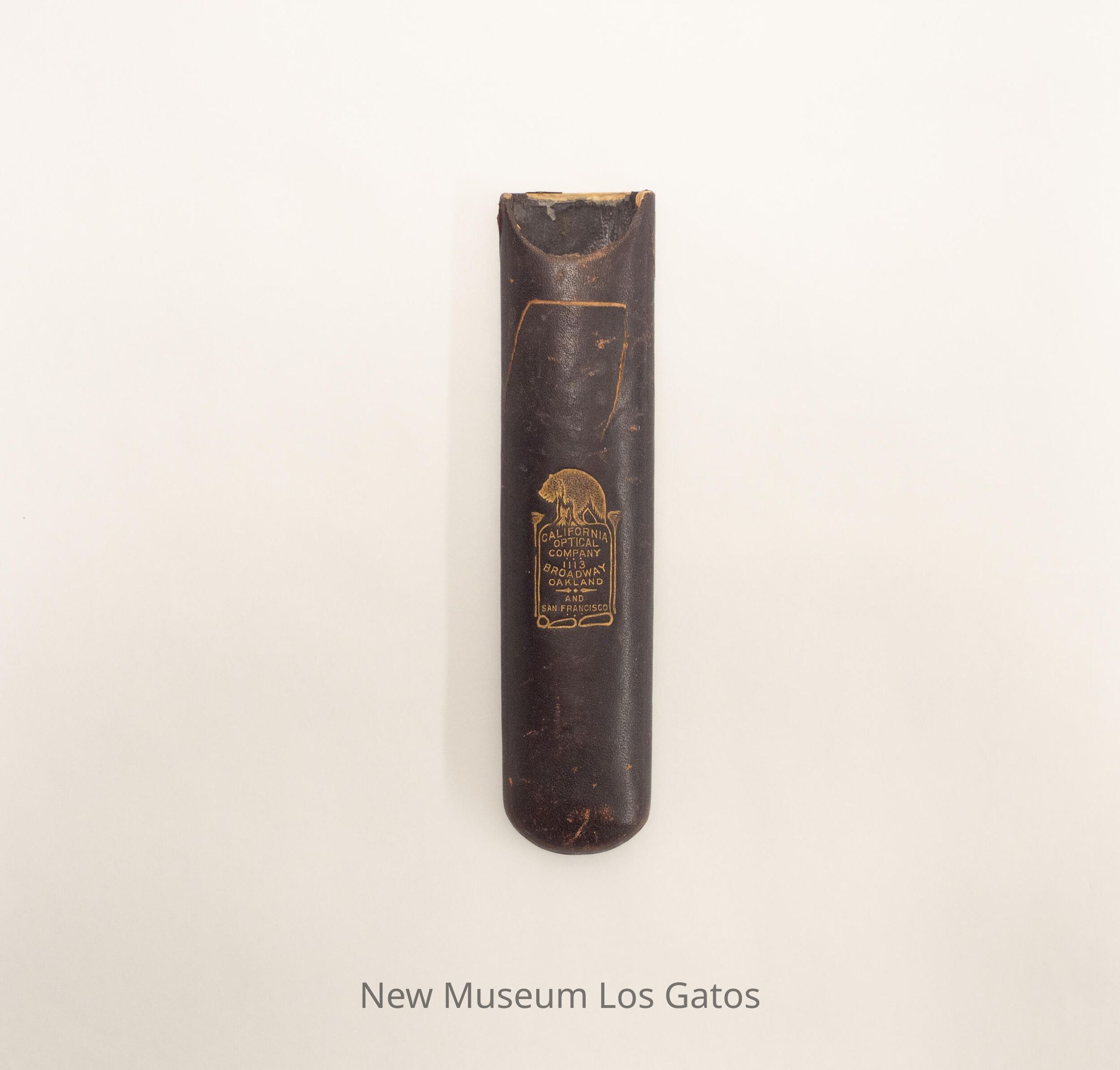 A pair of wire-framed glasses with accompanying case. The lenses are circular in shape, and the right (viewer's) temple arm has broken off. The case is made out of brown leather and open on one side, with the information of the maker inscribed on one side in gold.