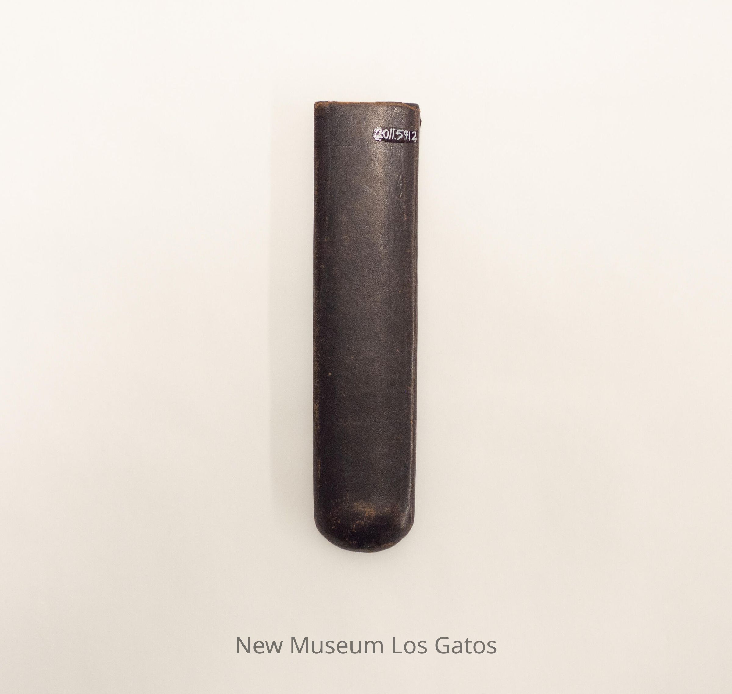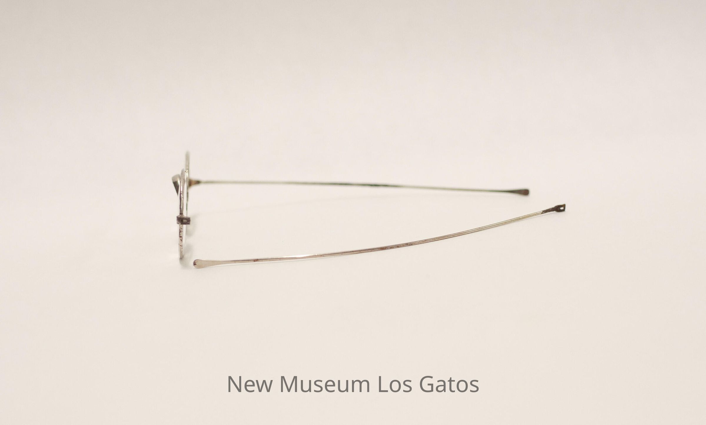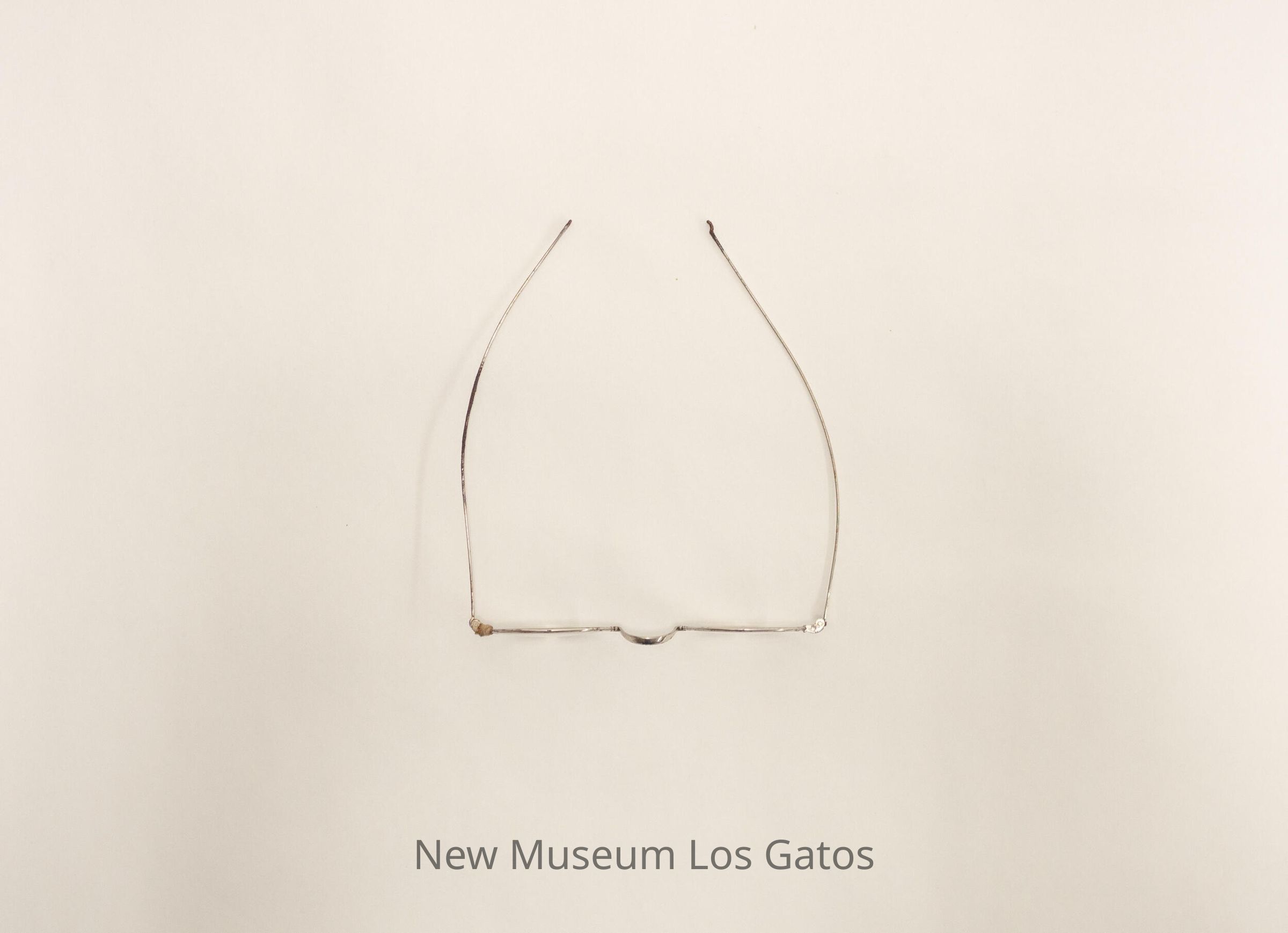 A pair of wire-framed glasses with accompanying case. The lenses are circular in shape, and the right (viewer's) temple arm has broken off. The case is made out of brown leather and open on one side, with the information of the maker inscribed on one side in gold.