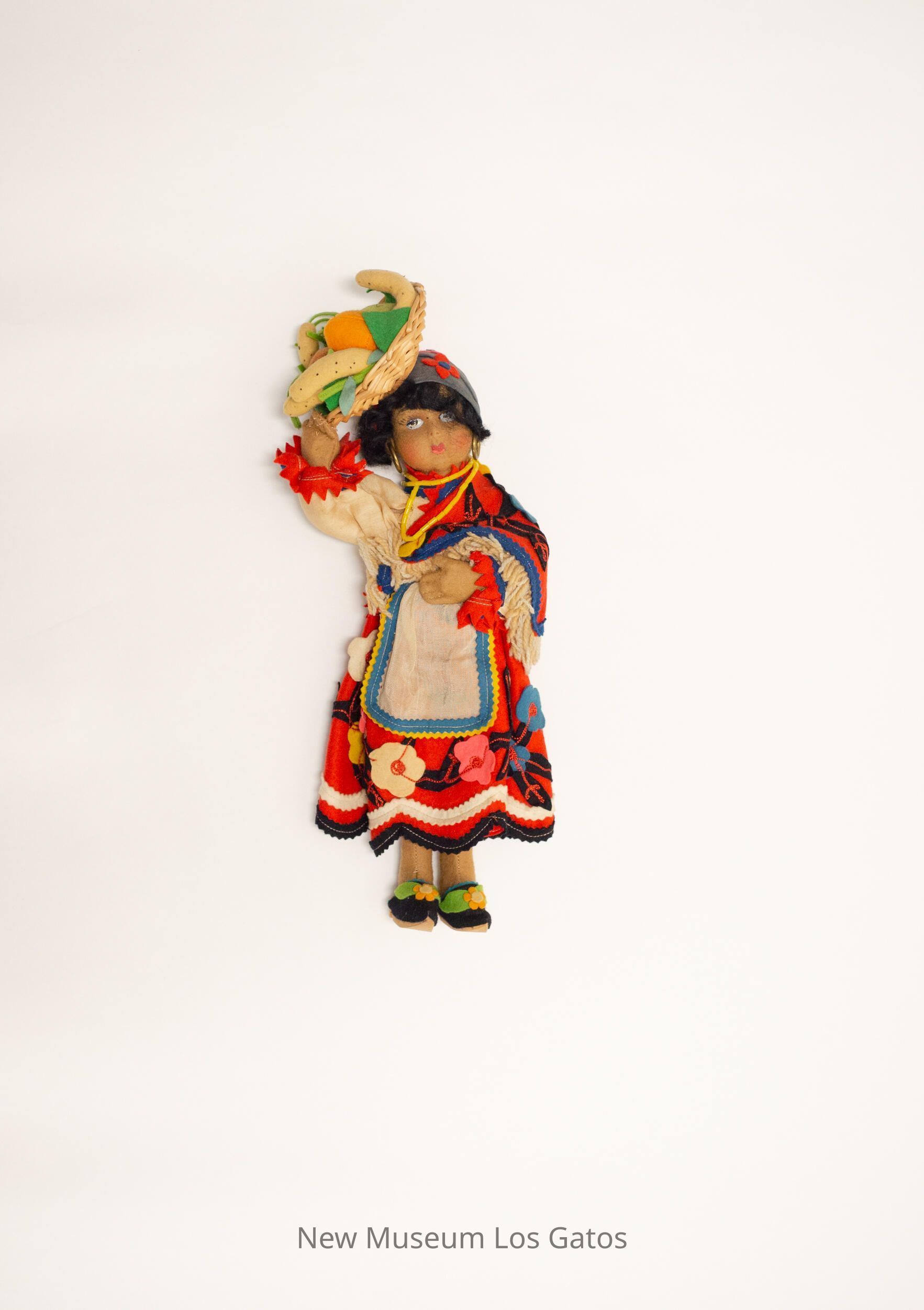 Female doll carrying a basket of fruit on her head, supported with her left (viewer's) arm. Her dress is red, with black and white trim, and blue, tan, and pink flowers. Her shoes are black clogs, trimmed in turquoise, with an orange flower and green petals decorating them. Her apron is white, trimmed in blue and red. Her shawl is the same pattern as her dress, but trimmed in blue with yarn fringe. She has black hair, gold hoop earrings, and her head covering is blue/gray with white, pink, red, and blue flowers. She also has a necklace made out of yellow beads. On the back of the doll is a label with the address of the donor, as well as a taped-on piece of paper labeled "Box 105."Collection
