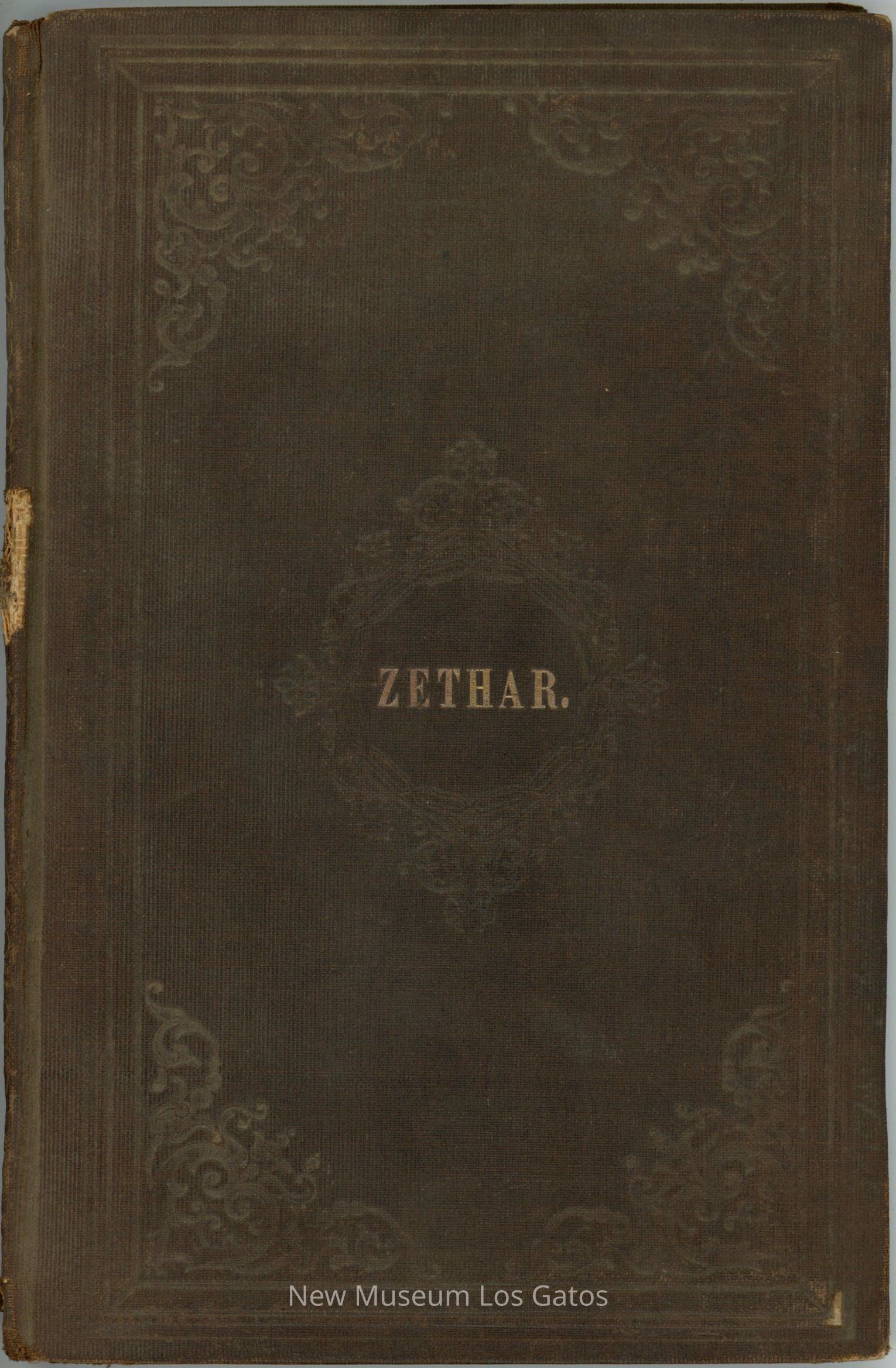A thin, brown, fabric-bound devotional poem with gilded lettering on the cover and gilded decorations on the spine. There is also etched decorative elements on the front and back cover. The poem is about about an extraterrestrial being named Zethar, who visits Earth.Collection