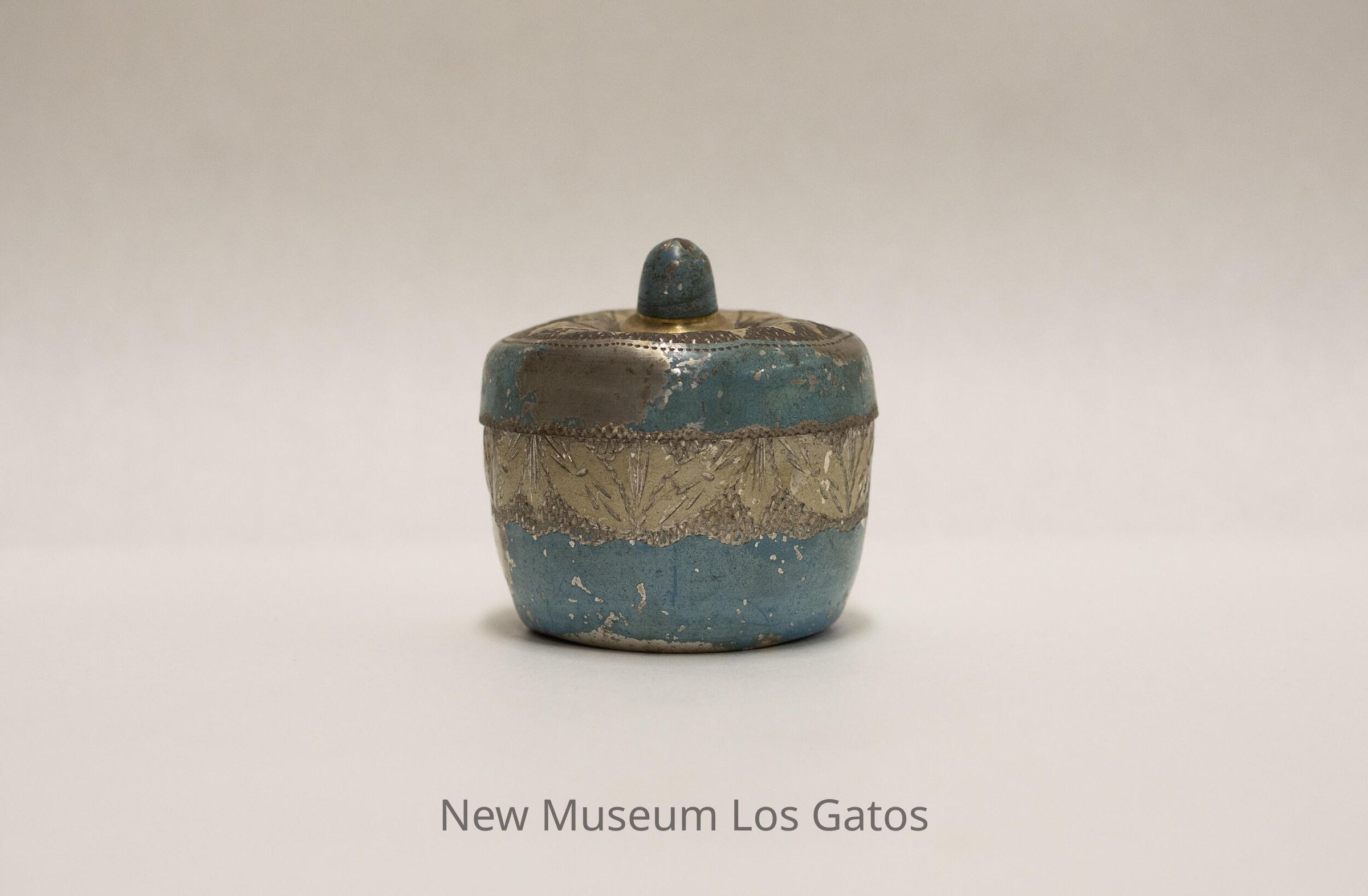 A small, round metal box and lid, with an etched flower pattern on the lid and etched leaves on the box. The box and lid are painted light blue and white. There is a strip of pink tape on the bottom of the box with three Chinese characters on it.