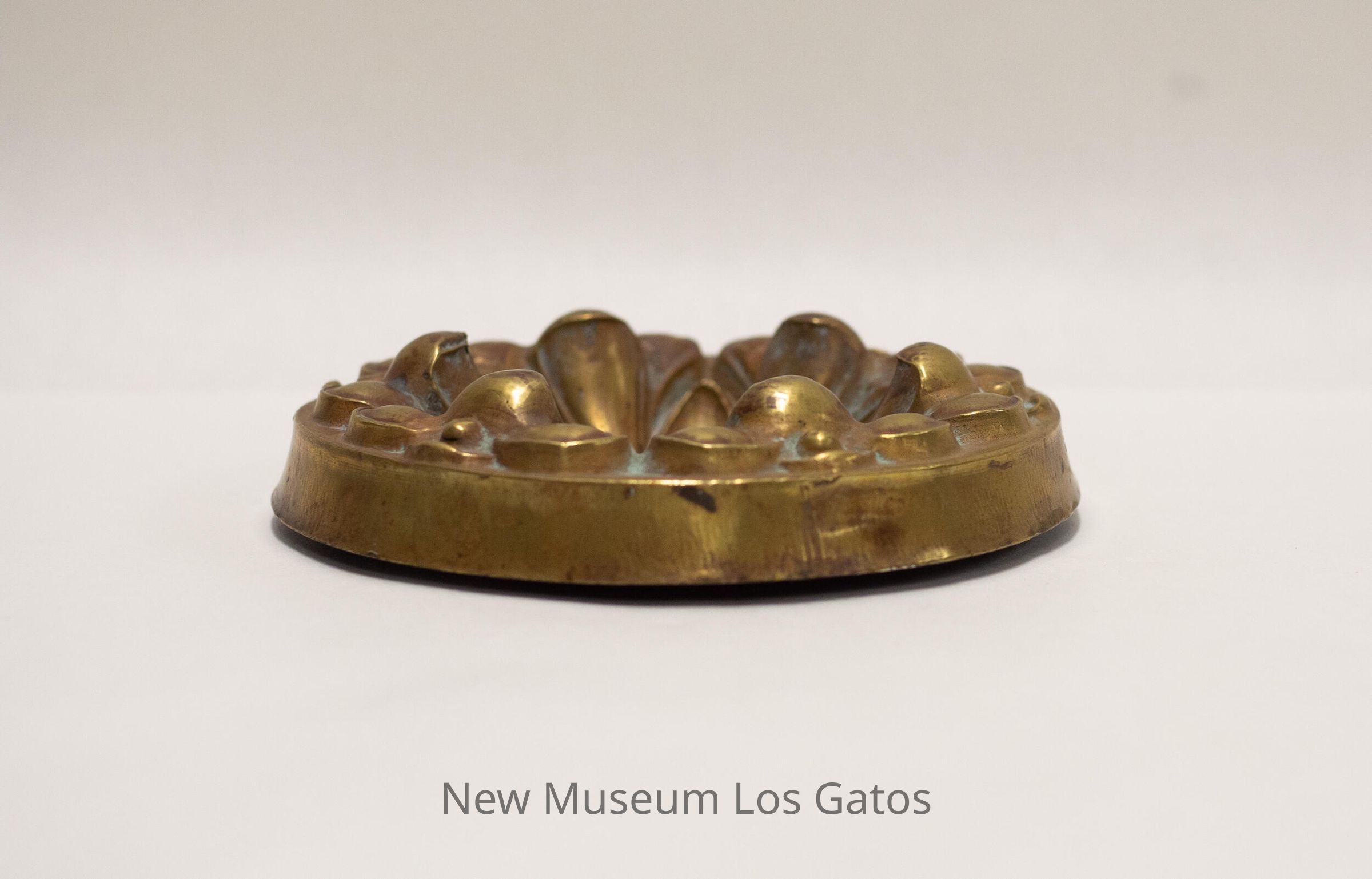 A circular, hand-hammered brass medallion, depicting a floral pattern. The flower has six large and six small petals. The medallion is raised around the edges, and dips in the center.Collection