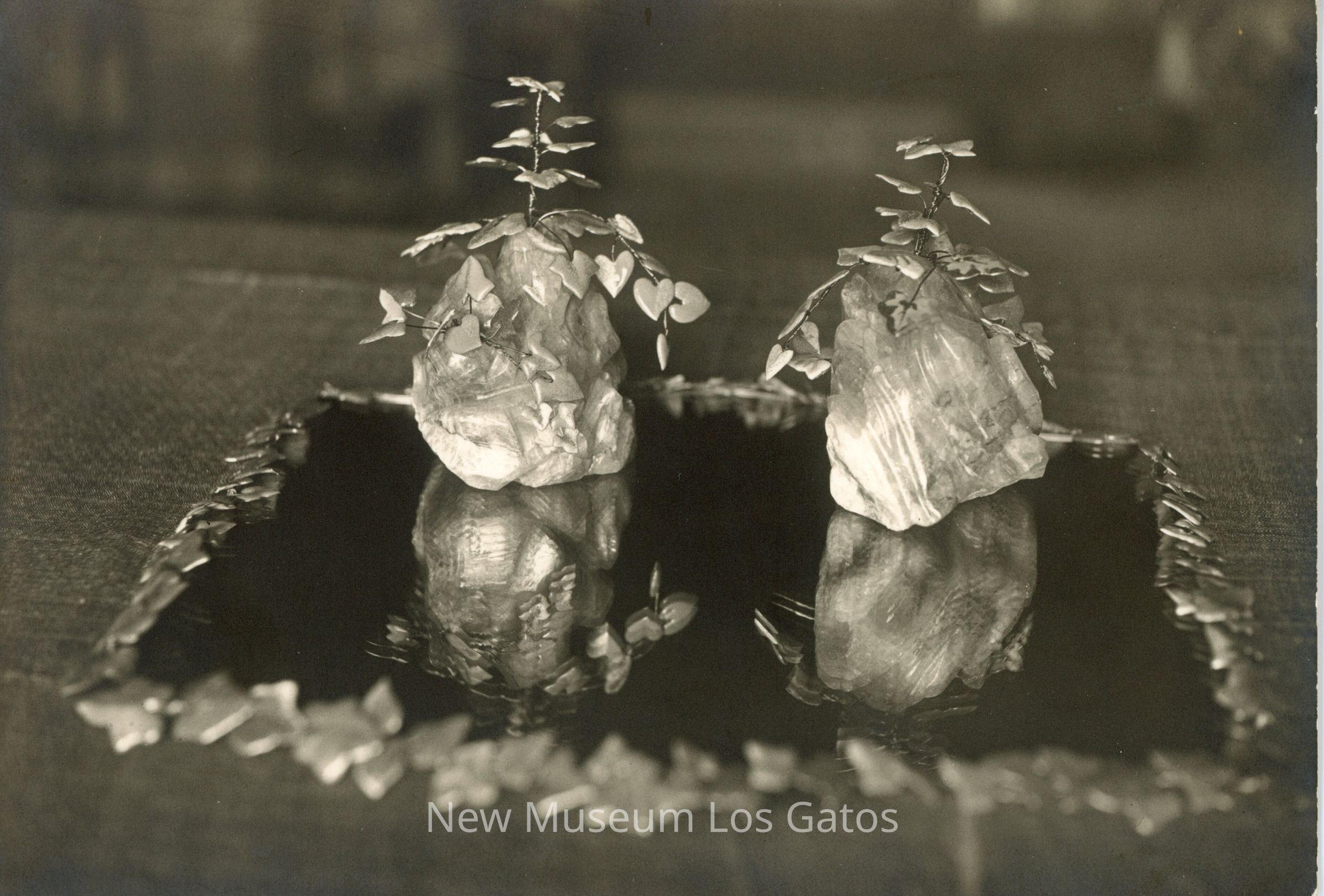 Black and white photograph of a miniature sculptural piece that appears to depict two land masses on a mirrored surface.