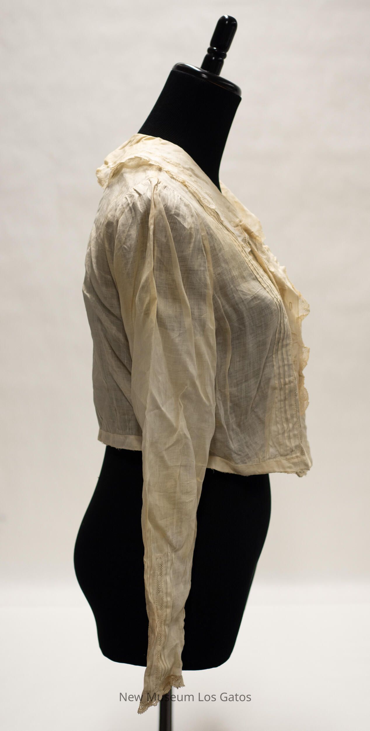 A cream-colored, batiste long-sleeved blouse. The blouse opens down the center front, and closes with six small, white iridescent buttons and two snaps, one at each end. There are three bands of vertical pin tucks on each side of the blouse, with a band of lace separating each band of tucks. There is ruffled lace detailing down the center of the blouse and around the edge of the collar. There is lace along the edge of each sleeve, as well as three small white buttons, and two bands of vertical stripes separated by a band of lace.Collection