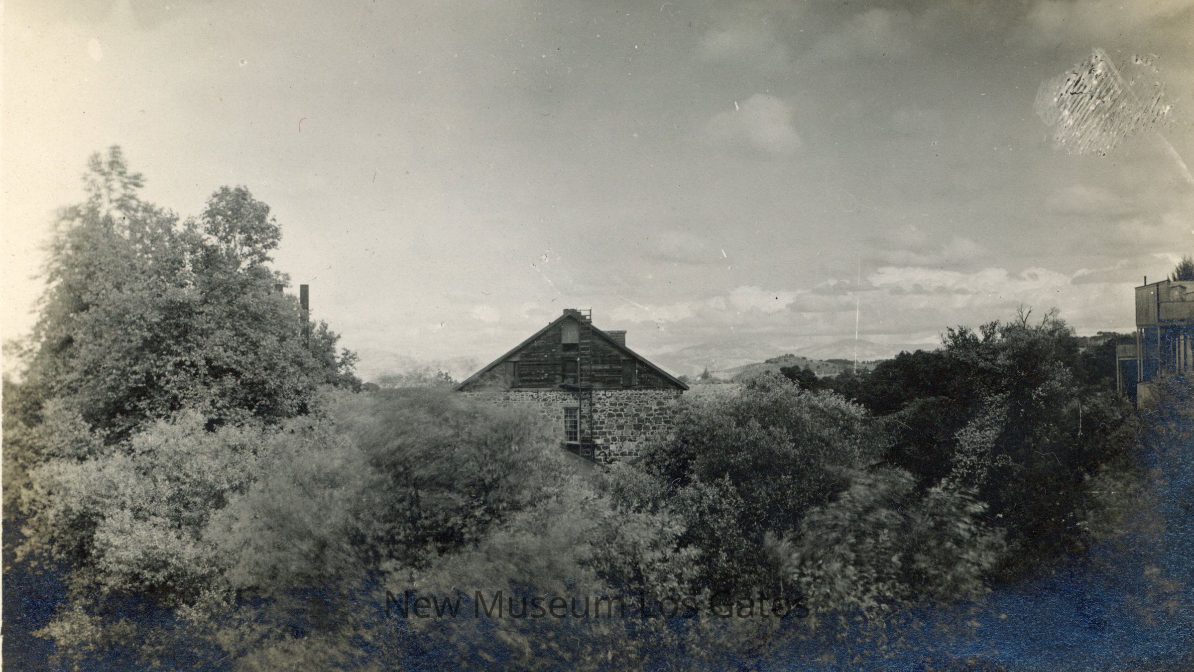 A black and white photograph of Forbes Mill, as it looked in the late 1880s when it was operated as the Los Gatos Manufacturing Company. Only the top of the mill from the south side is visible through the leaves of numerous trees. There is part of another structure visible along the right edge of the image. The photograph is most likely an enlargement, and there is a white border around the entire image.