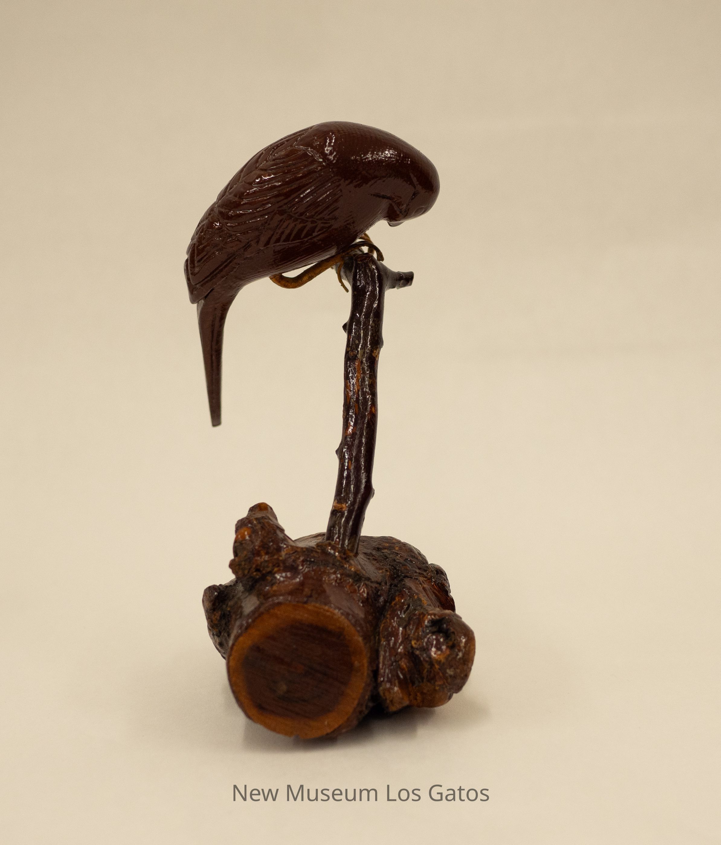 A dark brown hand-carved wooden sculpture of a bird perched over a stick that is standing up from a dark/mottled wooden base that looks like a log.Type of Sculpture