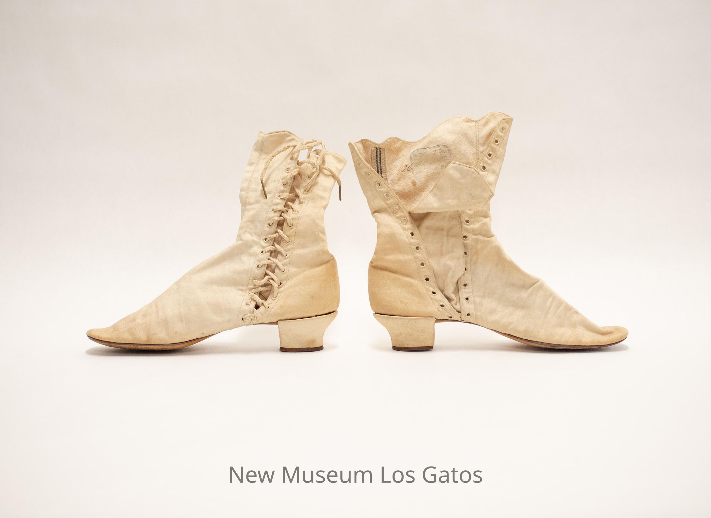 Pair of white, heeled boots, apparently for a wedding. There is lacing along the interior of both boots, but only the left boot has the string.Collection