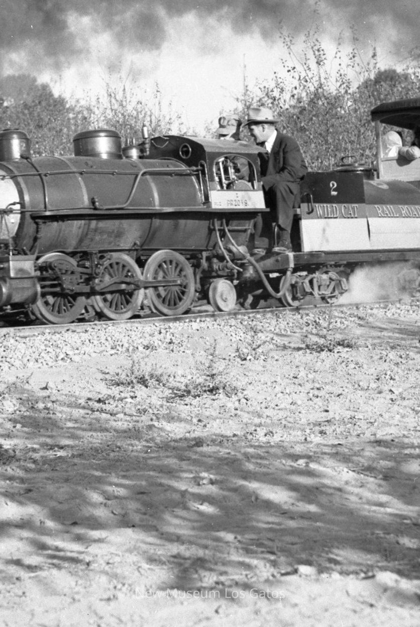 A black and white photograph negative, depicting the train at the golden spike ceremony for the Wildcat Railroad on October 16, 1943. The image features the train running on its track, with a conductor on the steam engine and people in the passenger cars.