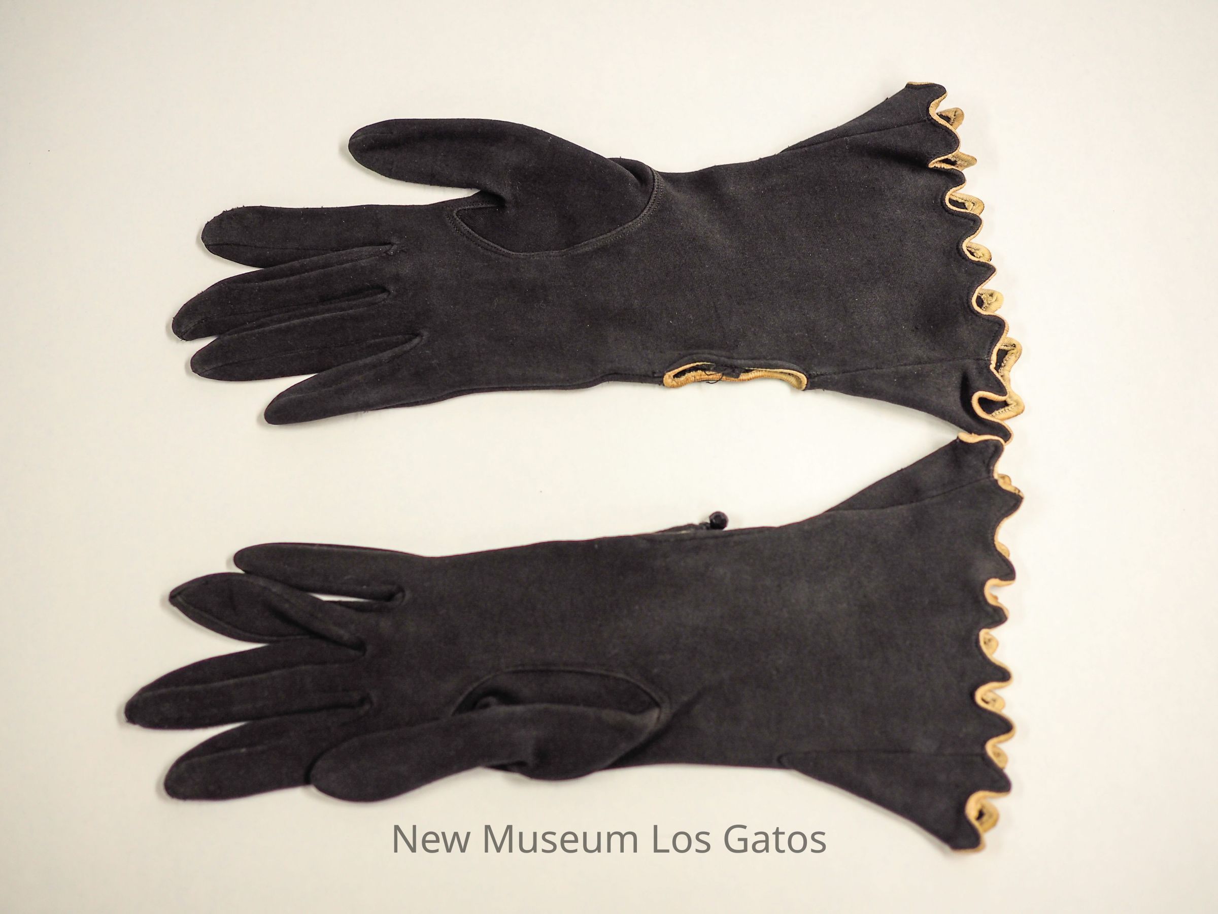 Black cotton gloves with white piping, waved edges, and flared wrists. The gloves would extend past the wrist. There are three black stitched lines along the back of the hands, and a single v-shaped line at wrists.Collection