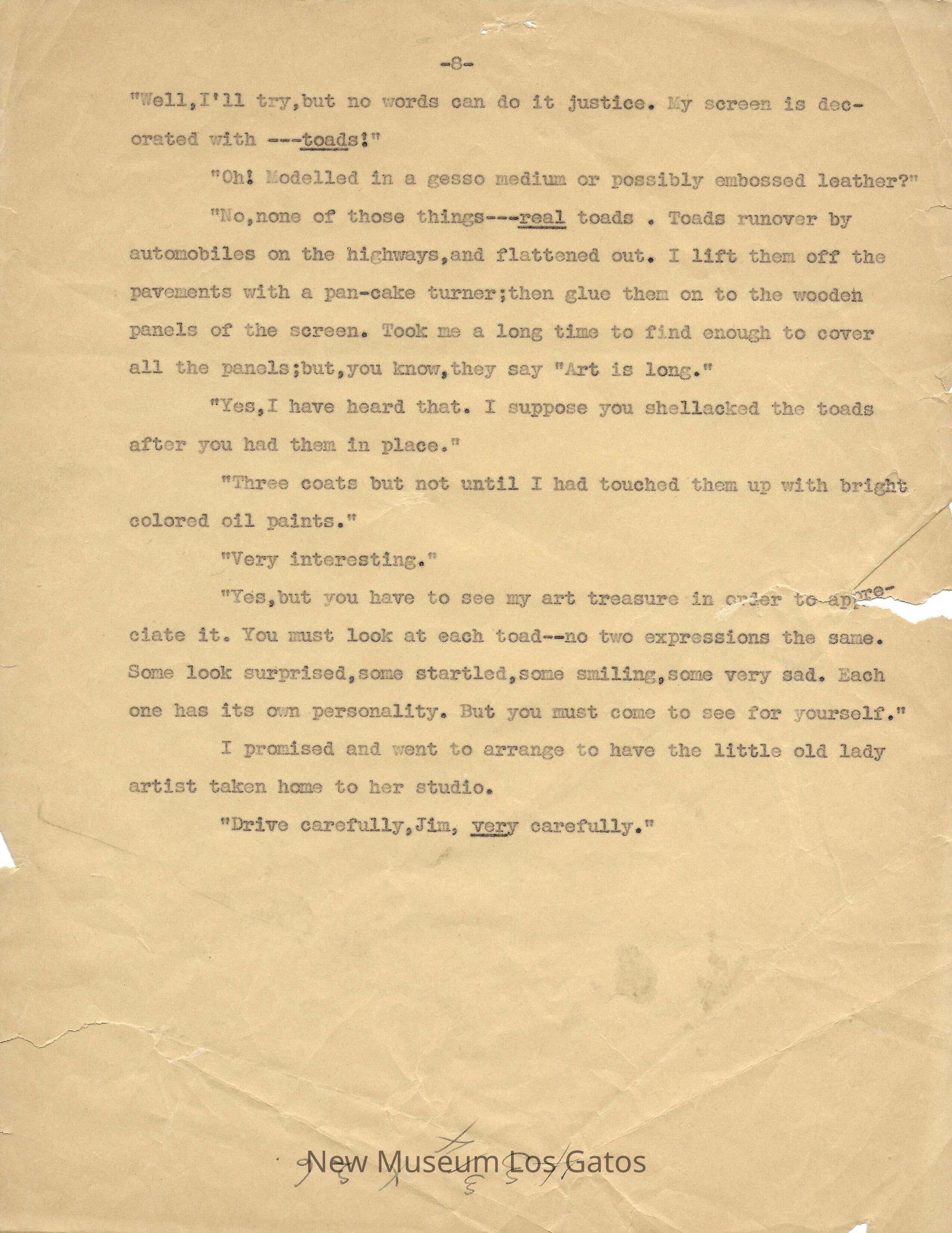 A short story manuscript, possibly written either by Frank Ingerson or George Dennison, but certainly modeled after their life, that is a musing on what the meaning of art is, and how it is different to different people.Cataloged By