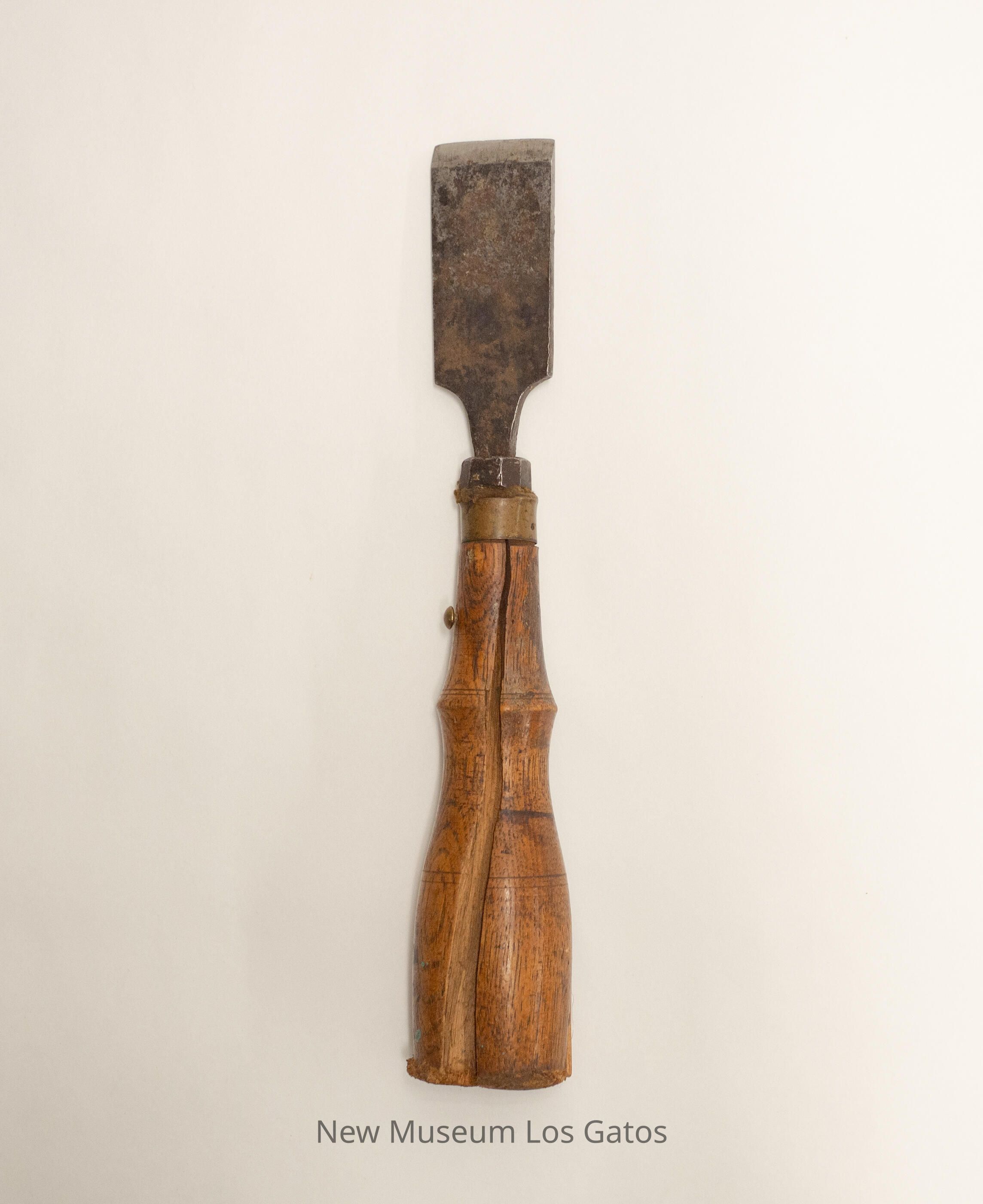 A large, broad metal blade attached to a large wooden handle. There is a strip of brass where the blade attaches to the handle, and two brass screws near the top of the handle.Collection
