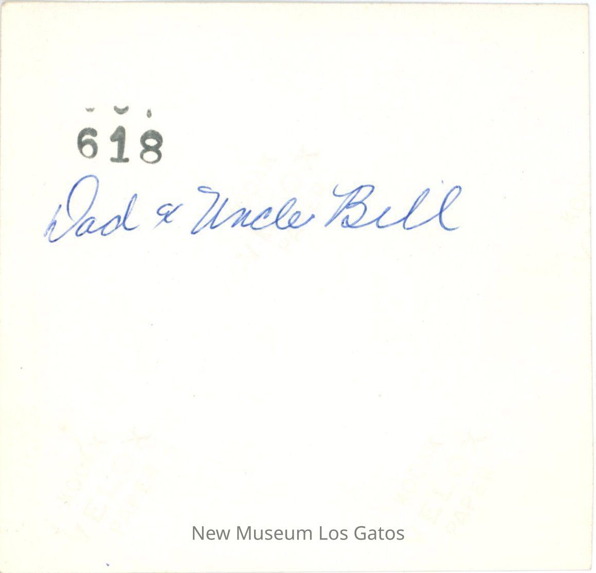 A black and white photograph featuring Billy Jones and his brother. The two men are wearing overalls, work clothes, and hats, and are standing up on a dirt hill. Behind them is the back side of a train engine connected to a flat car. The image is surrounded by a white border.Photograph Details
