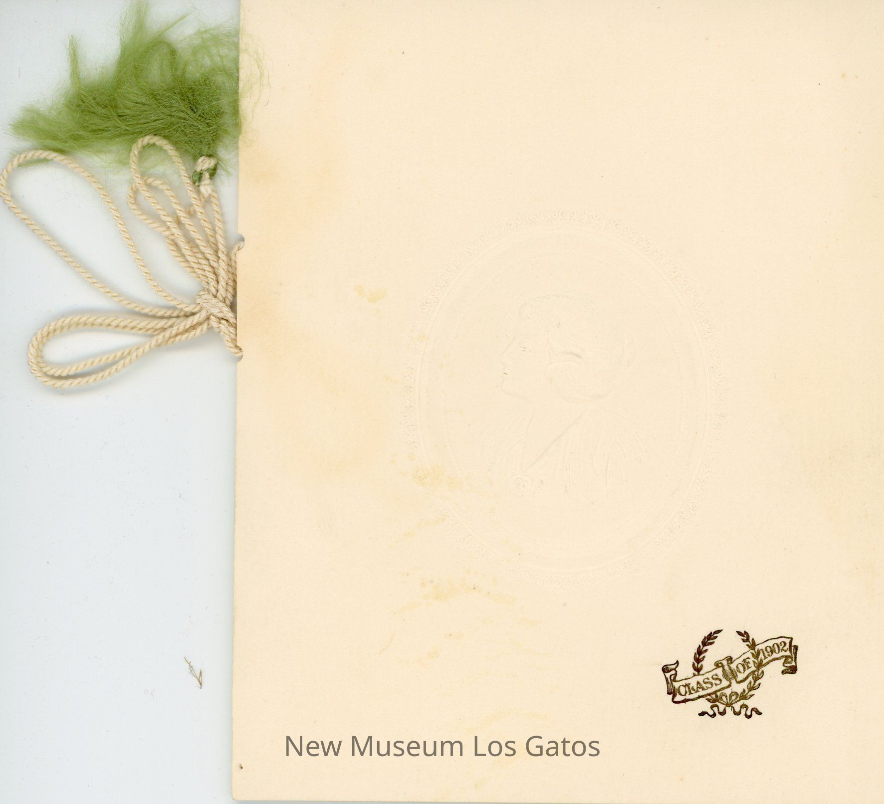 The program for Los Gatos High School's commencement in 1902. Includes the order of the program, as well as a list of graduates. The cover of the program features an embossed cameo in the center, with a "Class of 1902" emblem in the lower right corner, and a white and green string serving as the binding.Collection