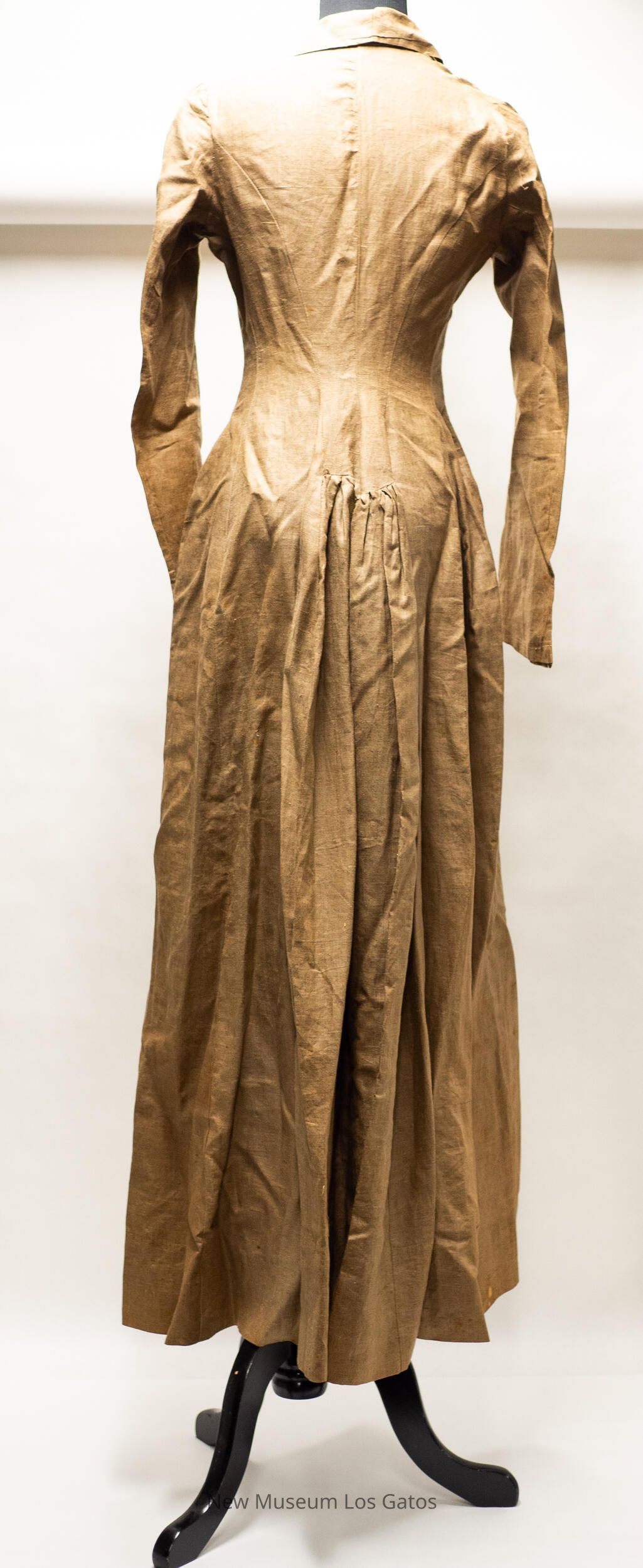 A long, brown, button-up linen duster. There are 13 circular tan-and-brown buttons on the left side of the duster, as well as one on each sleeve, near the cuff. There are two small pockets on each side of the front of the duster.Collection