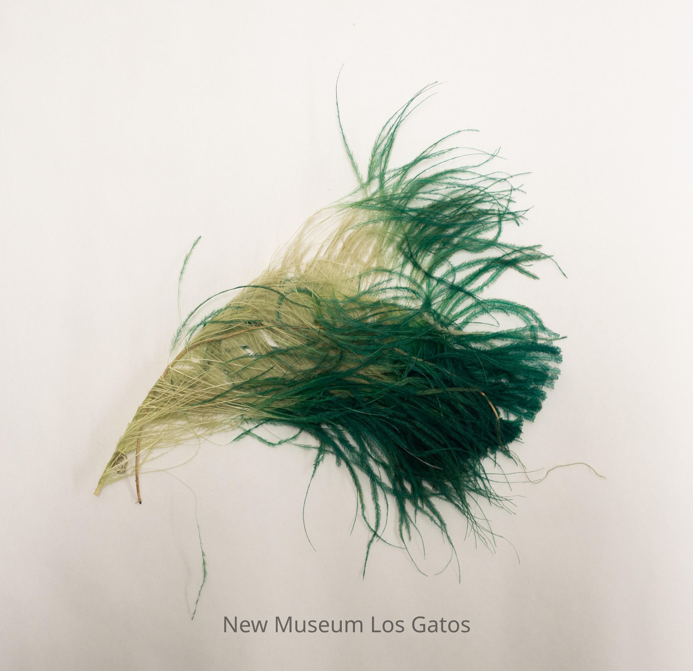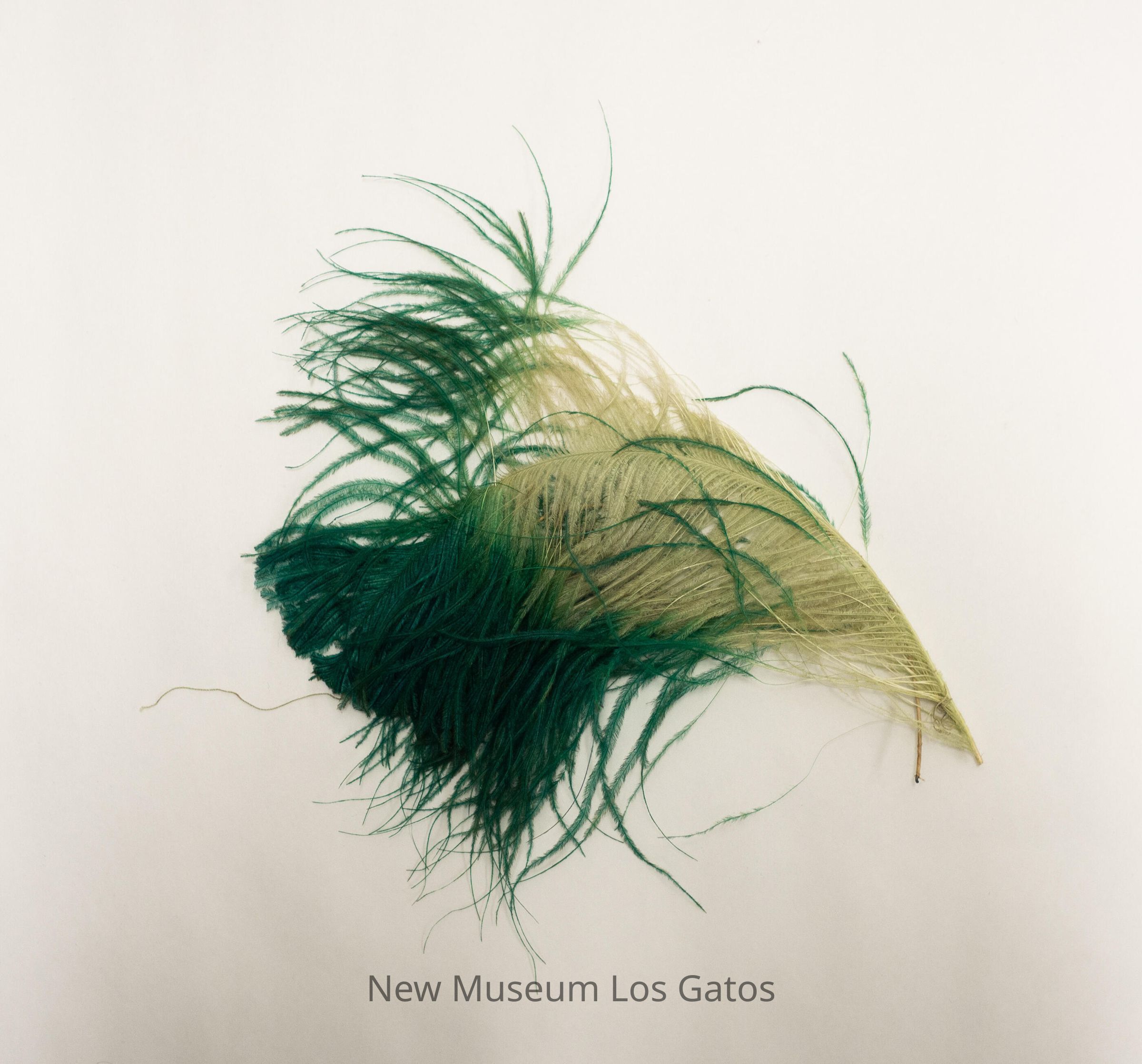 A large, decorative ostrich feather. The feather is light/lime green towards the center, and darker green towards the edges. There is a fabric-wrapped metal wire attached to the feather, loosely guiding its shape.