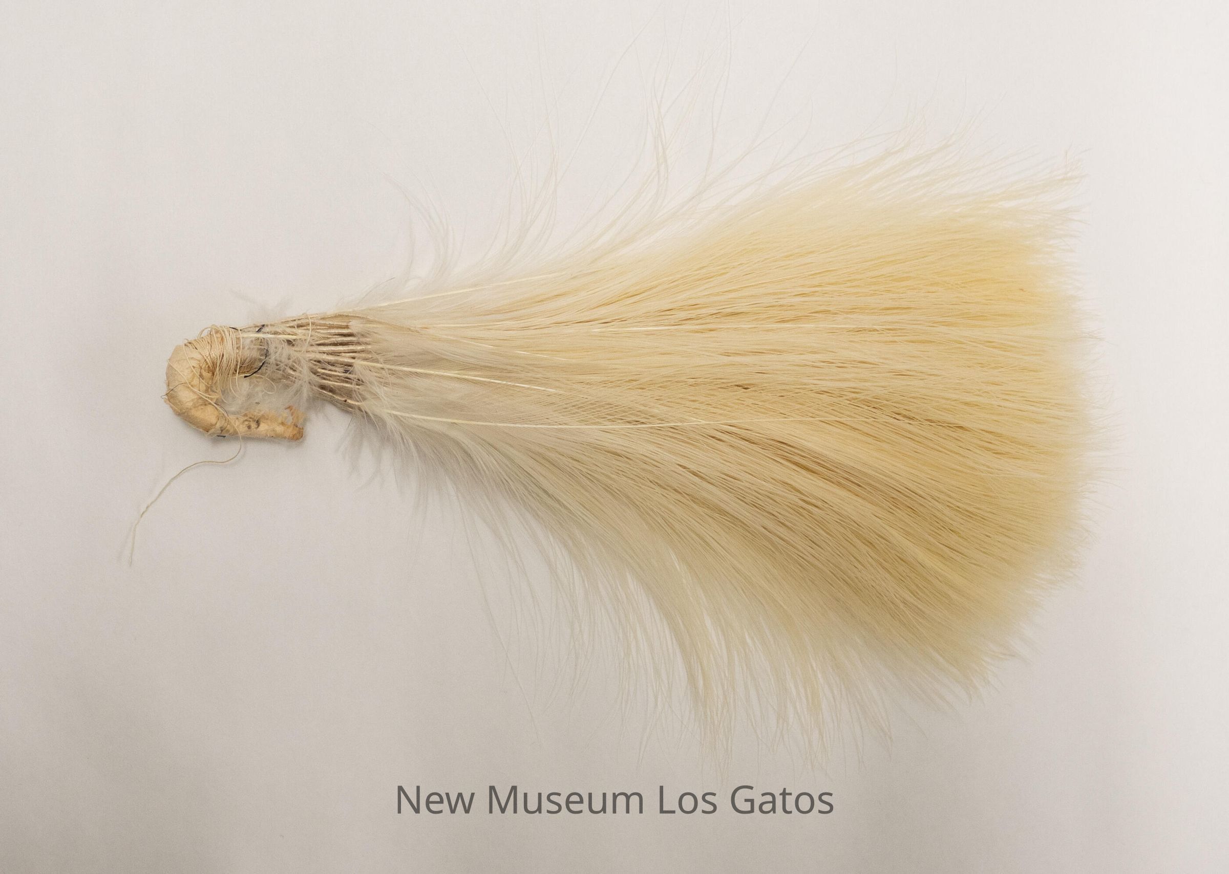 A feather decoration consisting of numerous white tail feathers bound together at their base. The bases are wrapped in white string, and bent to form a hook shape.