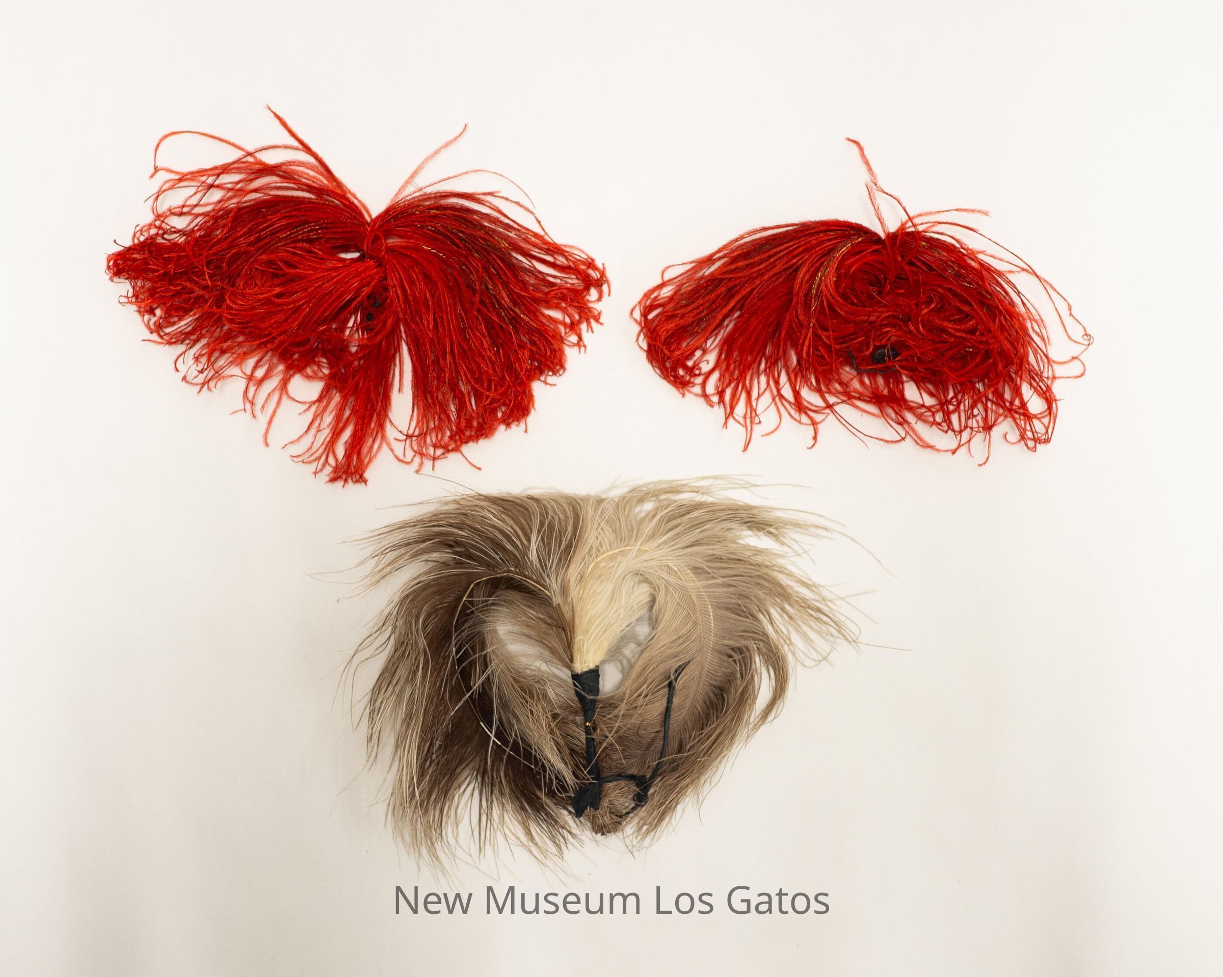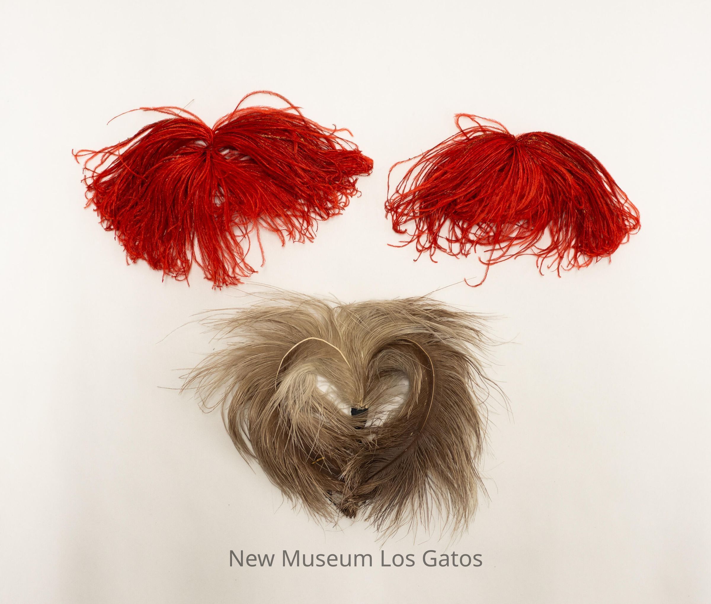 A set of three feather decorations. Two of the decorations are red with threads of gold, and black stems. The third decoration is brown and tan, also with a black stem. The brown decoration is shaped into a heart, and has a gold bobby pin in it.