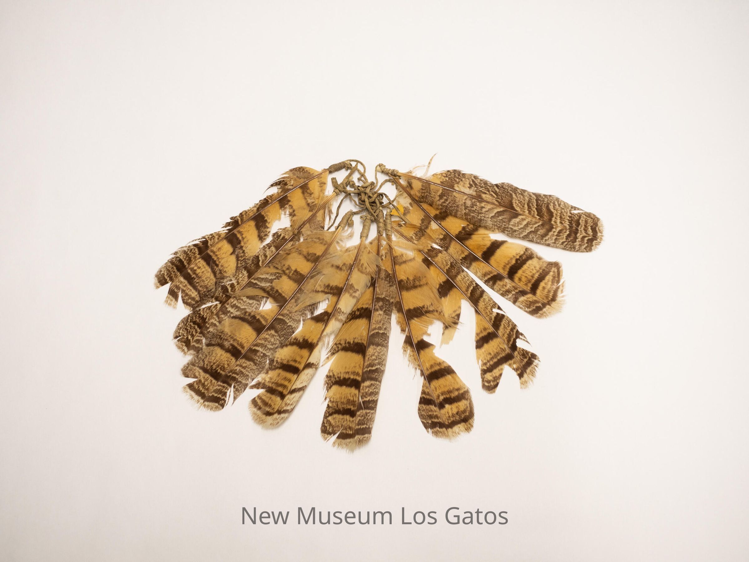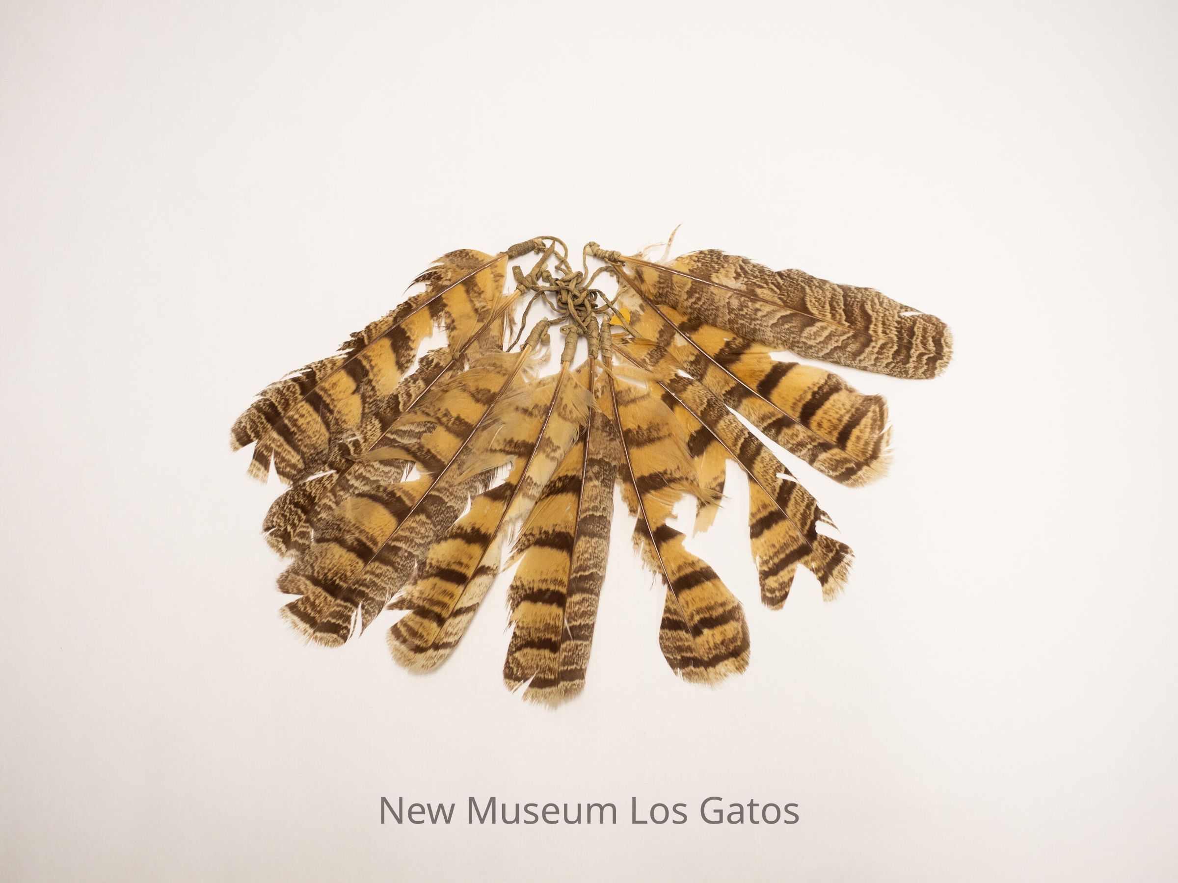 Nine feathers tied together with leather bands. The feathers are dark and light brown and are striped, although the size and scale of the striping varies from feather to feather.