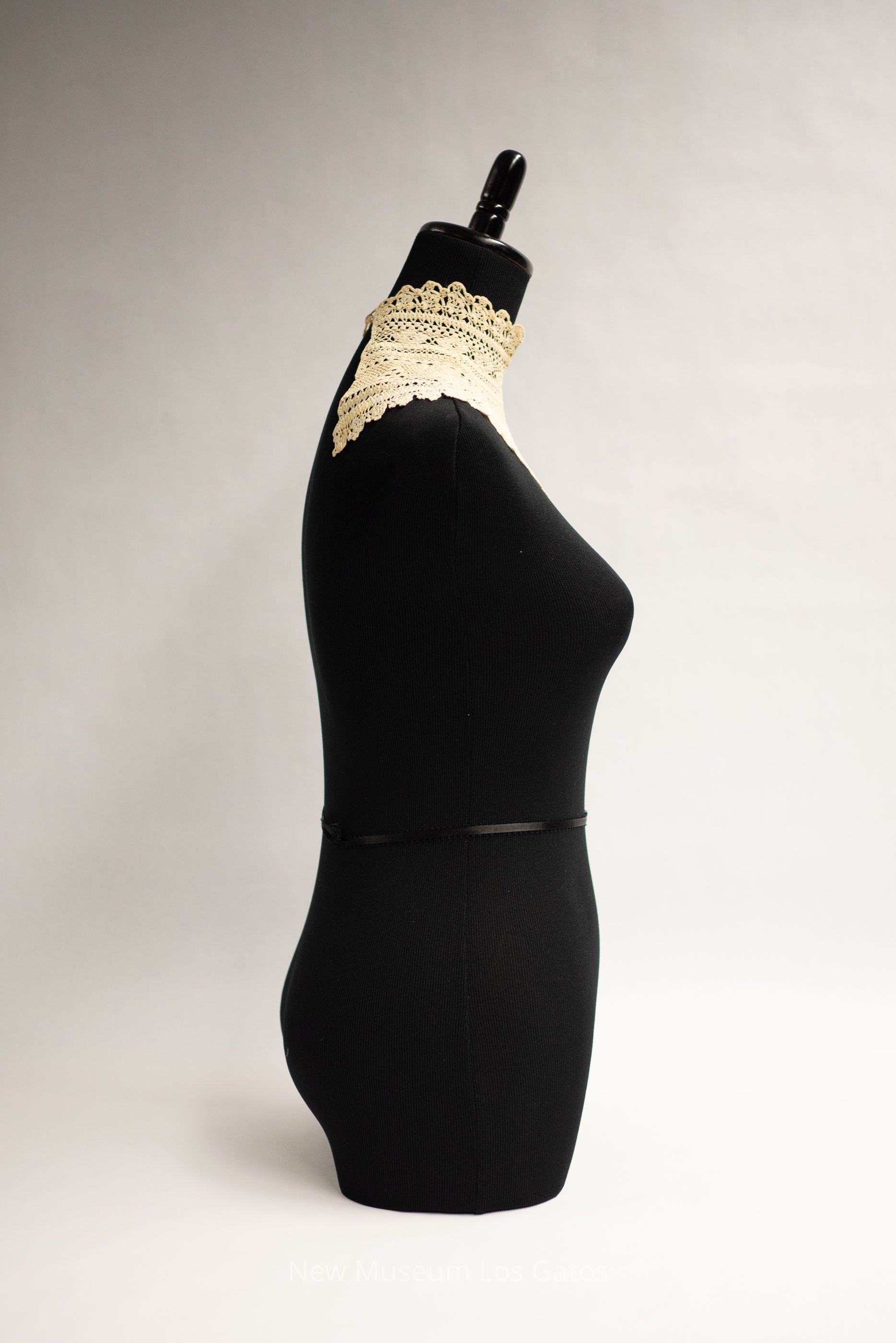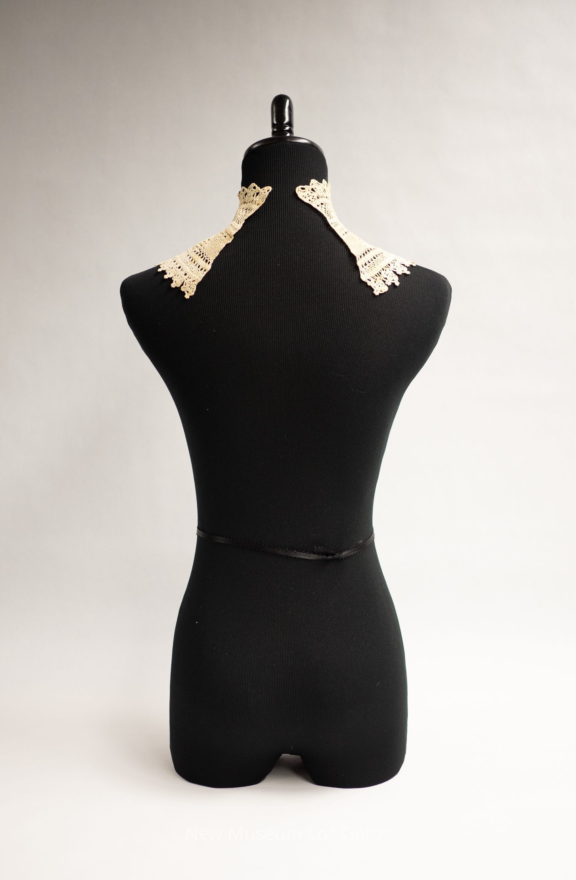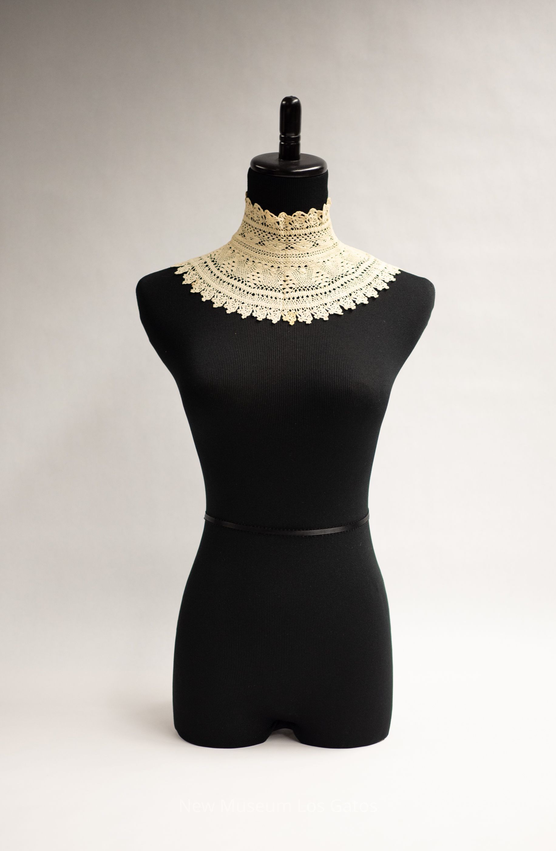 A white cotton crocheted dickey. The dickey is curved slightly, and features a more geometric, smaller-scale pattern in the middle and a more floral, larger-scale pattern along the edges.Collection